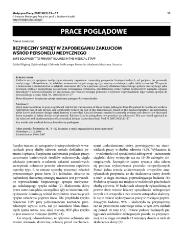 Medycyna Pracy, 2007;58(1):13 — 17 © Instytut Medycyny Pracy im. prof. J. Nofera w Łodzi http://medpr.imp.lodz.pl 13 PRACE POGLĄDOWE Maria Gańczak BEZPIECZNY SPRZĘT W ZAPOBIEGANIU ZAKŁUCIOM WŚRÓD PERSONELU MEDYCZNEGO SAFE EQUIPMENT TO PREVENT INJURIES IN THE MEDICAL STAFF Zakład Higieny, Epidemiologii i Zdrowia Publicznego, Pomorska Akademia Medyczna, Szczecin Streszczenie Zakłucia ostrym sprzętem medycznym stanowią zagrożenie transmisją patogenów krwiopochodnych od pacjenta do personelu medycznego. Udowodniono, że właściwe stosowa-nie bezpiecznego sprzętu znacząco redukuje ryzyko takiej transmisji. W oparciu o doniesienia z piśmiennictwa w artykule omówiono aktywne i pasywne sposoby działania bezpiecznego sprzętu oraz wymogi, jakie powinien spełniać. Komentując zastosowane rozwiązania techniczne, przedstawiono różne rodzaje bezpiecznych narzędzi, opisano przeszkody w upowszechnieniu ich stosowania, jak również strategie pomocne w wyborze i wprowadzaniu tego rodzaju sprzętu do powszechnego użytku. Med. Pr., 2007;58(1):13–17 Słowa kluczowe: bezpieczny sprzęt medyczny, patogeny krwiopochodne Abstract Sharp injures continue to pose a significant risk for the transmission of blood-borne pathogens from the patient to health care workers. Appropriate use of safe devices can significantly reduce the risk of this transmission. Based on the medical literature, an information about active and passive design safety features is provided. Crucial elements needed to properly evaluate safe devices are discussed. Some examples of safety devices are presented. Barriers faced in using these new products are addressed. The user-based approach to the selection and implementation of safe medical devices is also described. Med Pr 2007;58(1):13–17 Key words: safe medical devices, bloodborne pathogens Adres autorki: Żołnierska 48, 71-412 Szczecin, e-mail: [email protected] Nadesłano: 21.12.2006 Zatwierdzono: 19.01.2007 Ryzyko transmisji patogenów krwiopochodnych w warunkach pracy służby zdrowia zostało dokładnie poznane i opisane. Bezpieczne zachowania podczas pracy, stosowanie barierowych środków ochronnych, ciągła edukacja personelu w zakresie zakażeń zawodowych, szczepienia ochronne przeciw wirusowemu zapaleniu wątroby typu B, to uznane sposoby prewencji zakażeń przenoszonych przez krew (1). Jednakże, obecnie za najbardziej skuteczną strategię uważane jest powszechne wprowadzanie bezpiecznego sprzętu medycznego, redukującego ryzyko zakłuć (2). Skaleczenia skóry przez ostre narzędzia, szczególnie igły ze światłem, zdecydowanie dominują wśród incydentów stwarzających ryzyko zakażenia poprzez krew. Dla przykładu ryzyko zakażenia HIV przy jednorazowym kontakcie przezskórnym wynosi 0,3%, zaś po kontakcie błon śluzowych (jama ustna, nos, oko) z krwią HIV-plus ryzyko to jest znacznie mniejsze (0,09%) (3). Co więcej, udowodniono, że rękawice ochronne nie zawsze stanowią skuteczną ochronę przed mechanicz- nymi uszkodzeniami skóry, powstającymi na stanowiskach pracy w służbie zdrowia (4,5). Wykazano, iż – w zależności od specjalności zabiegowej – naruszenie ciągłości skóry występuje raz na 10–50 zabiegów chirurgicznych. Szczególnie często sytuacja taka zdarza się podczas wykonywania procedur ortopedycznych. Ponad jedna trzecia ankietowanych ortopedów amerykańskich przyznała, że do skaleczenia skóry doszło u nich w ciągu miesiąca poprzedzającego badanie (6). Podobna sytuacja ma miejsce w rodzimych placówkach służby zdrowia. W badaniach własnych wykazaliśmy, że prawie dwie trzecie lekarzy specjalności zabiegowych innych niż ortopedia i trzy czwarte ortopedów skaleczyło się w trakcie wykonywania pracy w miesiącu poprzedzającym badanie, 98% – skaleczyło się przynajmniej raz na przestrzeni ostatniego roku, w tym 24% zakłuło się ponad 10 razy (7,8). Prawie połowa badanych pielęgniarek oddziałów zabiegowych podała, że przynajmniej raz w ciągu ostatnich 12 miesięcy doszło u nich do skaleczenia skóry (9). 14 M. Gańczak Eliminacja użycia igieł i innych ostrych narzędzi w placówkach służby zdrowia, to strategia wchodząca w zakres profilaktyki pierwotnej. Zaleca się, by wnikliwie rozważać wskazania do pobierania krwi w celach diagnostycznych, a także podawania leków i szczepionek w iniekcjach. Jednak wiele procedur medycznych wymaga użycia ostrego sprzętu. W takich sytuacjach wskazane jest stosowanie sprzętu bezpiecznego, co znacznie eliminuje możliwość zakłucia (profilaktyka wtórna) (10). Uważa się, że – w zależności od typu narzędzia i rodzaju procedury – około 60–80% zakłuć notowanych wśród personelu medycznego można by zapobiec, używając bezpieczniejszego sprzętu (1,11,12). W badaniach przeprowadzonych przez Sohna i wsp., w jednym z nowojorskich szpitali, wykazano, że w rok po wprowadzeniu różnych odmian bezpiecznych narzędzi drastycznie zmniejszyła się liczba zakłuć zarówno wśród pielęgniarek, jak i lekarzy oraz personelu pomocniczego (13). Redukcja liczby skaleczeń została odnotowana zarówno w odniesieniu do procedur obarczonych wysokim, jak i niskim ryzykiem spowodowania zakłucia. Najbardziej znacząco zmniejszyła się liczba zakłuć podczas zakładania dojścia dożylnego, najmniej – w fazie utylizacji zużytego sprzętu. Bezpieczny sprzęt może działać w sposób aktywny lub pasywny (12,14,15): 1. Sposób aktywny wymaga, by tuż po użyciu sprzętu pracownik własnoręcznie uruchamiał mechanizm zabezpieczający przed przypadkowym zakłuciem. Niestety, użytkownik może zapomnieć o potrzebie uruchomienia wspomnianego mechanizmu lub uruchomienie może zakończyć się niepowodzeniem, co wpływa na zwiększenie możliwości skaleczenia. 2. Sposób pasywny – gdy mechanizm zabezpieczający przed skaleczeniem uruchamia się automatycznie, tzn. bez potrzeby aktywacji przez użytkownika. Pracownik nie może zi