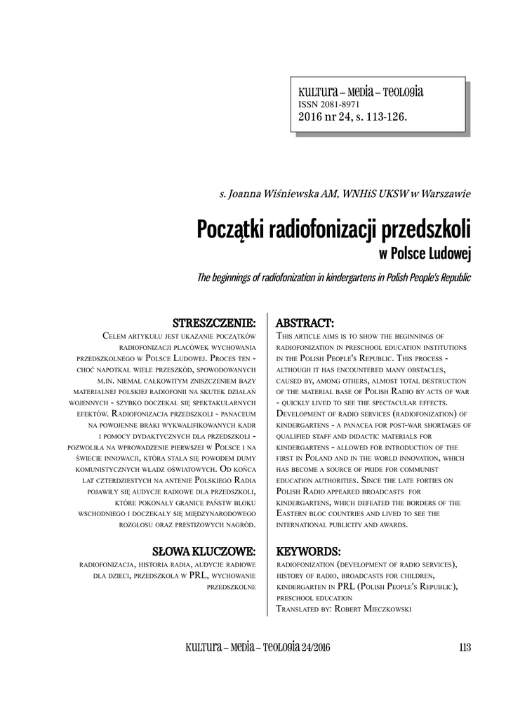 Kultura – Media – Teologia ISSN 2081-8971 2016 nr 24, s. 113-126. s. Joanna Wiśniewska AM, WNHiS UKSW w Warszawie Początki radiofonizacji przedszkoli w Polsce Ludowej The beginnings of radiofonization in kindergartens in Polish People's Republic STRESZCZENIE: CELEM ARTYKUŁU JEST UKAZANIE POCZĄTKÓW RADIOFONIZACJI PLACÓWEK WYCHOWANIA POLSCE LUDOWEJ. PROCES TEN CHOĆ NAPOTKAŁ WIELE PRZESZKÓD, SPOWODOWANYCH M.IN. NIEMAL CAŁKOWITYM ZNISZCZENIEM BAZY PRZEDSZKOLNEGO W MATERIALNEJ POLSKIEJ RADIOFONII NA SKUTEK DZIAŁAŃ - SZYBKO DOCZEKAŁ SIĘ SPEKTAKULARNYCH EFEKTÓW. RADIOFONIZACJA PRZEDSZKOLI - PANACEUM WOJENNYCH NA POWOJENNE BRAKI WYKWALIFIKOWANYCH KADR POLSCE I NA I POMOCY DYDAKTYCZNYCH DLA PRZEDSZKOLI POZWOLIŁA NA WPROWADZENIE PIERWSZEJ W ABSTRACT: THIS ARTICLE AIMS IS TO SHOW THE BEGINNINGS OF RADIOFONIZATION IN PRESCHOOL EDUCATION INSTITUTIONS IN THE POLISH PEOPLE'S REPUBLIC. THIS PROCESS - ALTHOUGH IT HAS ENCOUNTERED MANY OBSTACLES, CAUSED BY, AMONG OTHERS, ALMOST TOTAL DESTRUCTION POLISH RADIO BY ACTS OF WAR - QUICKLY LIVED TO SEE THE SPECTACULAR EFFECTS. DEVELOPMENT OF RADIO SERVICES (RADIOFONIZATION) OF KINDERGARTENS - A PANACEA FOR POST-WAR SHORTAGES OF OF THE MATERIAL BASE OF QUALIFIED STAFF AND DIDACTIC MATERIALS FOR - ALLOWED FOR INTRODUCTION OF THE POLAND AND IN THE WORLD INNOVATION, WHICH KINDERGARTENS ŚWIECIE INNOWACJI, KTÓRA STAŁA SIĘ POWODEM DUMY FIRST IN KOMUNISTYCZNYCH WŁADZ OŚWIATOWYCH. HAS BECOME A SOURCE OF PRIDE FOR COMMUNIST OD KOŃCA POLSKIEGO RADIA POJAWIŁY SIĘ AUDYCJE RADIOWE DLA PRZEDSZKOLI, LAT CZTERDZIESTYCH NA ANTENIE KTÓRE POKONAŁY GRANICE PAŃSTW BLOKU WSCHODNIEGO I DOCZEKAŁY SIĘ MIĘDZYNARODOWEGO ROZGŁOSU ORAZ PRESTIŻOWYCH NAGRÓD. SŁOWA KLUCZOWE: RADIOFONIZACJA, HISTORIA RADIA, AUDYCJE RADIOWE DLA DZIECI, PRZEDSZKOLA W PRL, WYCHOWANIE PRZEDSZKOLNE EDUCATION AUTHORITIES. SINCE THE LATE FORTIES ON POLISH RADIO APPEARED BROADCASTS FOR KINDERGARTENS, WHICH DEFEATED THE BORDERS OF THE EASTERN BLOC COUNTRIES AND LIVED TO SEE THE INTERNATIONAL PUBLICITY AND AWARDS. KEYWORDS: RADIOFONIZATION (DEVELOPMENT OF RADIO SERVICES), HISTORY OF RADIO, BROADCASTS FOR CHILDREN, KINDERGARTEN IN PRL (POLISH PEOPLE'S REPUBLIC), PRESCHOOL EDUCATION TRANSLATED BY: ROBERT MIECZKOWSKI Kultura – Media – Teologia 24/2016 113 OBLICZA MEDIÓW W Polsce odrodzonej radio jest (…) nowym instrumentem kształtowania psychiki ludzkiej i doniosłym orężem upowszechnienia oświaty, sztuki i kultury” – stwierdził w 1949 r. podczas uroczystego otwarcia radiostacji we Wrocławiu, prezydent Bolesław Bierut1. Władze Polski Ludowej postrzegały radiofonizację jako skuteczne narzędzie transmisji ideologii komunistycznej do społeczeństwa. Bezpośrednio po zakończeniu II wojny światowej, postulaty szybkiego postępu w dziedzinie radiofonii oraz powszechnej radiofonizacji kraju, wydawały się jednak nierealne. Wykaz strat wojennych w tym obszarze zajmował niemal sto stron maszynopisu. Obiekty budowlane, sieci nadawcze, wyposażenie sal studyjnych, sprzęt techniczny oraz płytoteki zostały rozgrabione i zniszczone na skutek działań wojennych. Straty w polskim przemyśle radiotechnicznym szacowano na ok. 98%2. Dodatkową barierę stanowił niski stopień zelektryfikowania miejscowości, co szczególnie dotyczyło terenów wiejskich3. Pomimo obiektywnych trudności, już na przełomie lat czterdziestych i pięćdziesiątych systematycznie nadawane były specjalistyczne, profesjonalne audycje dla przedszkoli, stanowiące fenomen na skalę światową. Czy rzeczywiście jednak można mówić o sukcesie polskiej radiofonizacji, biorąc pod uwagę realia komunistycznego państwa? Celem znalezienia odpowiedzi na postawione pytanie, autorka w pracy posłużyła się metodą historyczną, polegającą na krytyce i interpretacji źródeł oraz opracowań na ten temat powstałych przed rokiem 1989. Szczególnie cennym źródłem informacji okazała się pozycja Radio w przedszkolu wydana przez Biuro Wydawnicze Polskiego Radia w 1951 r. Publikacja stanowiła swoiste pokłosie wystawy objazdowej o tym samym tytule, zorganizowanej przez Ministerstwo Oświaty i Polskie Radio w 1950 r. Jej broszurowe wydanie doczekało się licznych uzupełnień. W kolejnych latach Radio w przedszkolu uzyskało dojrzałą postać, stając się podręcznikiem metodycznym dla wychowawczyń przedszkoli. Analiza ww. źródeł i opracowań pokazała wybitne osiągnięcia polskiej radiofonii w dziedzinie wychowania przedszkolnego. Jej wyniki wymagały jednak konfrontacji z realiami ówczesnej polityki oświatowej, co z kolei pozwoliło na zdemaskowanie istoty opisywanego zjawiska4. Radiofonizacja w służbie oświaty czy ideologii? Radiowe prace nad upowszechnieniem oświaty rozpoczęto od nadawania audycji z cyklu „Nauka przy głośniku”. W latach 1946-47 powołano Radiowy Uniwersytet Ludowy, a z dniem 1 września 1948 r. ruszyła Wszechnica Radiowa, zorganizowana przez Polskie 1 2 3 4 114 Zarząd Główny Społecznego Komitetu Radiofonizacji Kraju [dalej: SKRK], Informator SKRK, Warszawa 1949, s. 3. S. Miszczak, Historia radiofonii i telewizji w Polsce, Warszawa 1972, s. 222-223. Tamże, s. 319; por. Rocznik statystyczny GUS 1950, Warszawa 1951, s. 53. Więcej informacji na temat historii polskiej radiofonii w pierwszych dekadach Polski Ludowej znaleźć można np. w takich pozycjach, jak: A. Ossibach-Budzyński (red.), Polskie Radio – historia, program, technika. 90 lat Polskiego Radia, Warszawa 2015; P. Szulc, Zniewolony eter. Polskie Radio Szczecin w latach 1945-1989, Szczecin 2012; W. Jastrzębski, M. Rzepa, Polskie Radio na Pomorzu i Kujawach 1935-2005, Bydgoszcz 2005; S. Miszczak, Historia radiofonii i telewizji w Polsce, Warszawa 1972; J. Kubin, Audycje radiowe w szkole, Warszawa 1957; H. Korn, Audycje radiowe w świetlicach, Warszawa 1952. Kultura – Media – Teologia 24/2016 J. Wiśniewska, Początki radiofonizacji przedszkoli w Polsce Ludowej Radio i Ministerstwo Oświaty