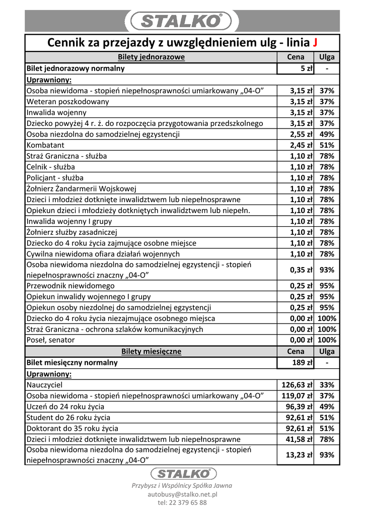 Cennik za przejazdy z uwzględnieniem ulg - linia J
