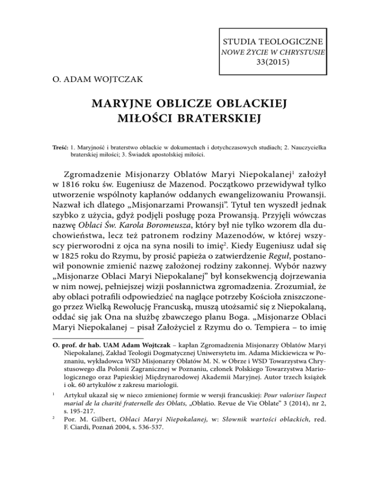 STUDIA TEOLOGICZNE NOWE ŻYCIE W CHRYSTUSIE 33(2015) O. ADAM WOJTCZAK MARYJNE OBLICZE OBLACKIEJ MIŁOŚCI BRATERSKIEJ Treść: 1. Maryjność i braterstwo oblackie w dokumentach i dotychczasowych studiach; 2. Nauczycielka braterskiej miłości; 3. Świadek apostolskiej miłości. Zgromadzenie Misjonarzy Oblatów Maryi Niepokalanej 1 założył w 1816 roku św. Eugeniusz de Mazenod. Początkowo przewidywał tylko utworzenie wspólnoty kapłanów oddanych ewangelizowaniu Prowansji. Nazwał ich dlatego „Misjonarzami Prowansji”. Tytuł ten wyszedł jednak szybko z użycia, gdyż podjęli posługę poza Prowansją. Przyjęli wówczas nazwę Oblaci Św. Karola Boromeusza, który był nie tylko wzorem dla duchowieństwa, lecz też patronem rodziny Mazenodów, w której wszyscy pierworodni z ojca na syna nosili to imię2. Kiedy Eugeniusz udał się w 1825 roku do Rzymu, by prosić papieża o zatwierdzenie Reguł, postanowił ponownie zmienić nazwę założonej rodziny zakonnej. Wybór nazwy „Misjonarze Oblaci Maryi Niepokalanej” był konsekwencją dojrzewania w nim nowej, pełniejszej wizji posłannictwa zgromadzenia. Zrozumiał, że aby oblaci potrafili odpowiedzieć na naglące potrzeby Kościoła zniszczonego przez Wielką Rewolucję Francuską, muszą utożsamić się z Niepokalaną, oddać się jak Ona na służbę zbawczego planu Boga. „Misjonarze Oblaci Maryi Niepokalanej – pisał Założyciel z Rzymu do o. Tempiera – to imię O. prof. dr hab. UAM Adam Wojtczak – kapłan Zgromadzenia Misjonarzy Oblatów Maryi Niepokalanej, Zakład Teologii Dogmatycznej Uniwersytetu im. Adama Mickiewicza w Poznaniu, wykładowca WSD Misjonarzy Oblatów M. N. w Obrze i WSD Towarzystwa Chrystusowego dla Polonii Zagranicznej w Poznaniu, członek Polskiego Towarzystwa Mariologicznego oraz Papieskiej Międzynarodowej Akademii Maryjnej. Autor trzech książek i ok. 60 artykułów z zakresu mariologii. 1 2 Artykuł ukazał się w nieco zmienionej formie w wersji francuskiej: Pour valoriser l’aspect marial de la charité fraternelle des Oblats, „Oblatio. Revue de Vie Oblate” 3 (2014), nr 2, s. 195-217. Por. M. Gilbert, Oblaci Maryi Niepokalanej, w: Słownik wartości oblackich, red. F. Ciardi, Poznań 2004, s. 536-537. O. Adam Wojtczak cieszy serce i ucho. […] Cieszmy się, że nosimy Jej imię i Jej służymy”3, a były przełożony generalny, L. Deschâtelets konkluduje: „to nie etykieta. Ta nazwa nas określa”4. Oprócz maryjności, istotnym elementem oblackiego charyzmatu jest braterska miłość. Św. Eugeniusz uważał ją za oś, wokół której toczy się życie oblatów. Praktykują ją wpierw pośród siebie, kochając się jak bracia, traktując zgromadzenie nie inaczej niż jako rodzinę najbardziej zjednoczoną, jaka istnieje na ziemi5. Przed śmiercią powiedział do nich: „Zachowujcie między sobą miłość, miłość, miłość, a na zewnątrz gorliwość o zbawienie dusz”. Spontanicznie uznano te słowa za duchowy testament, który streszcza charyzmat, jakim chciał przepoić życie zgromadzenia6. Pragnął, żeby wspólnoty oblackie były na wzór pierwszych gmin chrześcijańskich opisanych w Dziejach Apostolskich, a więc zjednoczone wokół Jezusa, który jest ich „wspólną miłością i wspólnym Mistrzem”7. Sam Założyciel dał przykład, kochając bez reszty współbraci. Świadkowie potwierdzają, że nikt nie był dla nich w takiej mierze ojcem, jak on8 – kochał nie tylko słowem, ale jego miłość wyrażała się w drobiazgach codziennego życia. Zgłębianie charyzmatycznej natury powołania oblackiego jest stosunkowo młode. Trzeba było czekać aż do czasów współczesnych, żeby na nowo ją przemyśleć. Założyciel nie napisał o niej naukowego traktatu. Dopiero od połowy XX wieku badacze usiłują dokładniej określić, co nazywamy oblacką duchowością. Ma słuszność F. Ciardi, kiedy stwierdza, że „mówienie o powołaniu oblackim jako charyzmacie wydaje się najlepszym spo3 4 5 6 7 8 Eugeniusz de Mazenod, Lettre au p. Tempier (22 XII 1825), w: Écrits oblats I, t. VI, Rome 1982, s. 234. L. Deschâtelets, Notre vocation et notre vie d’union intime avec Marie Immaculée (Circulaire, nr 191), w: Circulaires administratives des Supérieurs Généraux aux membres de la Congregation des Missionnaires Oblats de M. I., t. V, 1947-1952, Rome 1952, s. 347. Racje i duchowy sens nazwy zgromadzenia analizują M. Bélanger, «Regina Congregationis nostrae». Réflexions sur notre vocation et notre esprit marial, III, Existence d’un esprit marial, „Études Oblates” 19 (1960), s. 219-241 i K. Lubowicki, Dlaczego Misjonarze Oblaci Maryi Niepokalanej?, w: Niepokalane Poczęcie i życie chrześcijańskie. Materiały z sympozjum mariologiczno-maryjnego. Niepokalanów, 15-17 października 2004 roku, red. D. Mastalska, Częstochowa-Niepokalanów 2005, s. 237-245. Por. Eugeniusz de Mazenod, Lettre au p. Hippolyt Guibert (29 VII 1830), w: Écrits…, t. VII, Rome 1983, s. 206-207. Por. M. Gilbert, Les «Novissima verba» du Fondateur, „Études Oblates” 28 (1969), s. 45-59. F. Santucci, Wspólnota, w: Słownik…, s. 822. Por. Y. Beaudoin, The spritual Journey of E. de Mazenod, „Vie Oblate Life” 47 (1988), s. 254255; K. Lubowicki, Misterium i dynamika miłości w życiu św. Eugeniusza de Mazenoda, Wrocław 2006, s. 159-164. 164 Maryjne oblicze oblackiej miłości braterskiej sobem jego wszechstronnego opisu i uniknięcia dychotomii ciągle ukrytej pomiędzy działaniem i kontemplacją, posłannictwem i życiem duchowym”9. W tym celu konieczne jest wyróżnianie składników charyzmatu i zestawianie ze sobą, by umożliwić ich lepsze zrozumienie. Oczywiście, należy je odczytywać w świetle historycznego postępowania Założyciela i całego zgromadzenia. I tak się faktycznie dzieje. Dokumenty i studia oblackie dostrzegają klucz do interpretacji ducha oblackiego w dwóch elementach: „oblat – mąż apostolski” lub „oblat