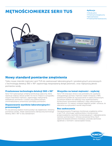 MĘTNOŚCIOMIERZE SERII TU5 Aplikacje • Woda pitna • Przemysł energetyczny • Browarnictwo • Przemysł farmaceutyczny Nowy standard pomiarów zmętnienia Tylko nowe mierniki mętności serii TU5 do zastosowań laboratoryjnych i produkcyjnych procesowych z technologią detekcji 360 × 90° zapewniają niespotykaną dotąd pewność, oraz najwyższą jakość pomiarów wody. Przełomowa technologia detekcji 360 × 90° Wszystko na temat mętności - szybciej Seria TU5 wykorzystuje unikalną konstrukcję optyczną, która rejestruje większy obszar próbki niż ma to miejsce w przypadku innych mierników mętności, zapewniając maksymalną dokładność pomiarów i czułość przy jednoczesnym zminimalizowaniu zmienności pomiędzy pomiarami. Seria TU5 znacząco skraca czas potrzebny do uzyskania wiarygodnego pomiaru mętności dzięki mniejszej o 98%, powierzchni próbki do wyczyszczenia w trybie procesowym, szczelnym fiolkom do kalibracji oraz wyeliminowaniu konieczności stosowania indeksacji i oleju silikonowego w laboratorium. Co więcej, mniejsza objętość próbki oznacza, że zdarzenia są wykrywane niemal natychmiast. Dopasowanie wyników laboratoryjnych i procesowych Po raz pierwszy będzie można pozbyć się wątpliwości, któremu pomiarowi zaufać, dzięki zastosowaniu identycznej technologii detekcji 360 × 90° w obu dziedzinach. Bez zaskoczenia Oprogramowanie Prognosys monitoruje urządzenia online z serii TU5, informując użytkowników o konieczności przeprowadzenia czynności konserwacyjnych i zabezpieczenia wartości pomiarowych. Umowa serwisowa firmy Hach zapewnia bezpieczeństwo inwestycji, pozwala zachować zgodność z normami i zaoszczędzić koszty. 2 Mętnościomierze serii TU5 Dane techniczne* TU5200 TU5300 sc / TU5400 sc Źródło światła Urządzenie laserowe klasy 2, z wbudowanym laserem 650 nm (EPA) lub 850 nm (ISO), maks 1,0 mW, klasa 2 (zgodność z IEC/EN 60825-1 i 21 CFR 1040.10, stosownie do normy Laser Notice nr 50) Źródło światła Urządzenie laserowe klasy 2, z wbudowanym laserem 650 nm (EPA) lub 850 nm (ISO), maks 1,0 mW, klasa 2 (zgodność z IEC/EN 60825-1 i 21 CFR 1040.10, stosownie do normy Laser Notice nr 50) Zakres pomiarowy EPA: 0-700 NTU/FNU/ TE/F /FTU 0–100 mg/L 0-175 EBC Zakres pomiarowy EPA: 0-700 NTU/FNU/ TE/F /FTU 0-175 EBC ISO: 0-1000 NTU/FNU/ TE/F /FTU 0-100 mg/L 0-250 EBC ISO: 0-1000 NTU/FNU/ TE/F /FTU 0-250 EBC Dokładność Dokładność ±2 % odczytu plus 0,01 NTU od 0–40 NTU; ±10% odczytu od 40–1000 NTU w oparciu o pierwszorzędowy formazynowy wzorzec mętności (przy 25°C) ±2 % odczytu plus 0,01 NTU od 0-40 NTU; ±10 % odczytu od 40-1000 NTU w oparciu o pierwszorzędowy formazynowy wzorzec mętności Rozdzielczość 0,0001 NTU/FNU/ TE/F /FTU/EBC Rozdzielczość 0,0001 NTU / FNU / TE/F / FTU / EBC / mg/L Powtarzalność Powtarzalność <40 NTU: 1% odczytu lub ±0,002 NTU na formazynie w temp. 25°C, zależnie od tego, która z wartości jest większa TU5300 sc: Tolerancja: 1% odczytu lub ±0,002 NTU na formazynie przy 25 °C, zależnie od tego, która z wartości jest większa TU5400 sc: Tolerancja: 1% odczytu lub ±0,0006 NTU na formazynie przy 25°C, zależnie od tego, która z wartości jest większa >40 NTU: 3,5% odczytu na formazynie w temp. 25°C Światło rozproszone <10 mNTU Jednostka NTU; FNU; TE/F; FTU; EBC; mg/L jeśli przyrząd jest skalibrowany z użyciem stopniowej krzywej kalibracji Światło rozproszone <10 mNTU Jednostka NTU, FNU, TE/F, FTU, EBC Średni czas sygnału 50-90 s (domyślnie: 30 s) Zakres temperatury pracy 10-40°C Czas odpowiedzi T90<30 s przy 100 mL/min Wilgotność 80% przy 30°C (bez kondensacji) Temperatura próbki 2-60°C Temperatura próbki 4-70°C Ciśnienie próbki Warunki przechowywania -30-60°C maks. 6 bar, w porównaniu z powietrzem w zakresie temperatur próbki od 2-40°C Prędkość przepływu Wymogi energetyczne (napięcie) 100 - 240 VAC 100-1000 mL/min; optymalne natężenie przepływu: 200-500 mL/min Zakres temperatury pracy 0-50°C Wymogi energetyczne (Hz) 50/60 Hz Wilgotność Wilgotność względna: 5–95% w różnych temperaturach, bez kondensacji Certyfikaty Certyfikat CE Warunki przechowywania -40-60°C Certyfikaty Certyfikat CE Numer rejestru w FDA (USA): 1420493-000 (EPA), 1420492-000 (ISO) Zgodność z normą IEC/EN 60825-1 oraz 21 CFR 1040.10, zgodnie z wymogami Laser Notice nr 50) Numer rejestru w FDA (USA): 1420493-000 (EPA), 1420492-000 (ISO) Zgodność z normą IEC/EN 60825-1 oraz 21 CFR 1040.10, zgodnie z wymogami Laser Notice nr 50) Oznaczenie RCM (Australia) Wymiary (wys. x szer. x głęb.) 195 mm x 409 mm x 278 mm Waga 2,4 kg Gwarancja 2 lata Oznaczenie RCM (Australia) Wymiary (wys. x szer. x głęb.) 249 mm x 268 mm x 190 mm Waga 2,7 kg (5,0 kg z akcesoriami) Gwarancja 2 lata *Może ulec zmianie bez powiadomienia. www.pl.hach.com 3 Mętnościomierze serii TU5 Zasada działania Mierniki mętności serii TU5 mierzą mętność kierując na próbkę światło lasera, które ulega rozproszeniu na zawartych w próbce cząstkach. Światło rozproszone pod kątem 90° w stosunku do padającej wiązki przed pochłonięciem przez detektor ulega odbiciu przez stożkowe lustro otaczające próbkę w zakresie 360°. Ilość rozproszonego światła jest proporcjonalna do poziomu mętności próbki. W przypadku, gdy wartość mętności próbki jest nieznaczna, ilość światła rozproszonego, a następnie wykrytego przez fotokomórkę, będzie niewielka, co spowoduje uzyskanie niskiej wartości pomiarowej. Z kolei wysoka mętność będzie prowadzić do rozpraszania dużej ilości światła i uzyskania wysokiej wartości pomiarowej. Wymiary Seria TU5300 sc i TU5400 sc - widok z przodu Seria TU5300 sc i TU5400 sc - widok z tyłu Seria TU5300 sc i TU5400 sc - widok z góry Seria TU5300 sc i TU5400 sc z modułem automatycznego czyszczenia www.pl.hach.com 4 Mętnościomierze serii TU5 Informacje do zamówień Laserowe laboratoryjne mętnmościomierze TU520