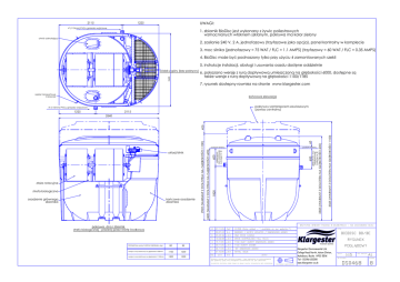 2115 UWAGI: 1225 4" (110mm) PVCu gniazdo wyjściowe 1. zbiornik BioDisc jest wykonany z żywic poliestrowych wzmacnianych włóknem szklanym, pokrywa ma kolor zielony otwór odmulający 2. zasilanie 240 V, 2 A, jednofazowy (trzyfazowe jako opcja), panel kontrolny w komplecie 3. moc silnika (jednofazowy = 75 WAT / FLC = 1.1 AMPS) (trzyfazowy = 60 WAT / FLC = 0.35 AMPS) 4. BioDisc może być podnoszony tylko przy użyciu 4 zamontowanych szekli 5. instrukcje instalacji, obsługi i usuwania osadu dostęne oddzielnie 2450 widok z góry (bez pokrywy) 6. pokazano wersję z rurą dopływową umieszczoną na głębokości 6000, dostępne są także wersje z rurą dopływową na głębokości 1100/1185 7. rysunek dostepny rowniez na stronie www.klargester.com szekle transportowe 4 pozycje końcowa elewacja pokrywa z zamknięciem zawiasowym (zawias centralny) 4" (110mm) PVCu gniazdo wejsciowe 1225 2115 końcowe osadzenie zbiornika 65 685 600 głębokość rury odpływowej (uwaga nr 5) głębokość rury wlotowej (uwaga nr 5) 3325 (WARIANT Z DOLOTEM NA GŁĘBOKOŚCI 1100) osadzenie głównego zbiornika 2825 (WARIANT Z DOLOTEM NA GŁĘBOKOŚCI 600) strefa biologiczna poziom terenu 1820 złoża rotacyjne poziom terenu 2420 (WARIANT Z DOLOTEM NA GŁĘBOKOŚCI 600) uklad/silnik 2920 (WARIANT Z DOLOTEM NA GŁĘBOKOŚCI 1100) 405 3340 WSZYSTKIE WYMIARY PODANO W MILIMETRACH - NIE ZACHOWANO SKALI pokrywa, dno i zbiornik strefy biologicznej - przekrój przez strefę środkową PRZYBLIŻONA MASA PUSTEGO ZBIORNIKA (kg) BD BE wersja z rurą dolotową na głębokości 600mm 1100 1200 wersja z rurą dolotową na głębokości 1100mm 1200 1300 8 07.11.05 SnP CC306 (Note added - "..available on our website..") 7 30.07.03 A.L. BORDER / NOTES UPDATED / DIMENSIONS ADDED 6 25.05.99 J.A.H. ONE PIECE CASING 5 13.09.98 J.A.H. DRIVE CENTRALISED FALL 15mm 4 15.11.95 1100 INLET INVERT DIMENSION ADDED 3 09.11.95 J.A.H. 1100 INVERT SHOWN 2 06.11.95 J.A.H. '65' DIMENSION ADDED 1 01.10.95 J.A.H. INITIAL ISSUE WYD. DATA J.A.H. RYS. BIODISC BD/BE RYSUNEK Treatment Systems ZMIANY Niniejszy rysunek jest chroniony prawem i jego kopiowanie lub wykorzystywanie bez pisemnej zgody firmy Klargester Environmental Ltd. jest zabronione KLARGESTER ZASTRZEGA SOBIE PRAWO DO ZMIANY DANYCH TECHNICZNYCH BEZ UPRZEDZENIA TYTUŁ RZUTOWANIE AMERYKAŃSKIE Klargester Environmental Ltd. College Road North, Aston Clinton, Aylesbury, Bucks. HP22 5EW. Tel:- 01296 633000 www.klargester.co.uk POGLĄDOWY 1:15 SKALA ROZ. ARKUSZA NR RYSUNKU DS0468 A1 WYDANIE 8