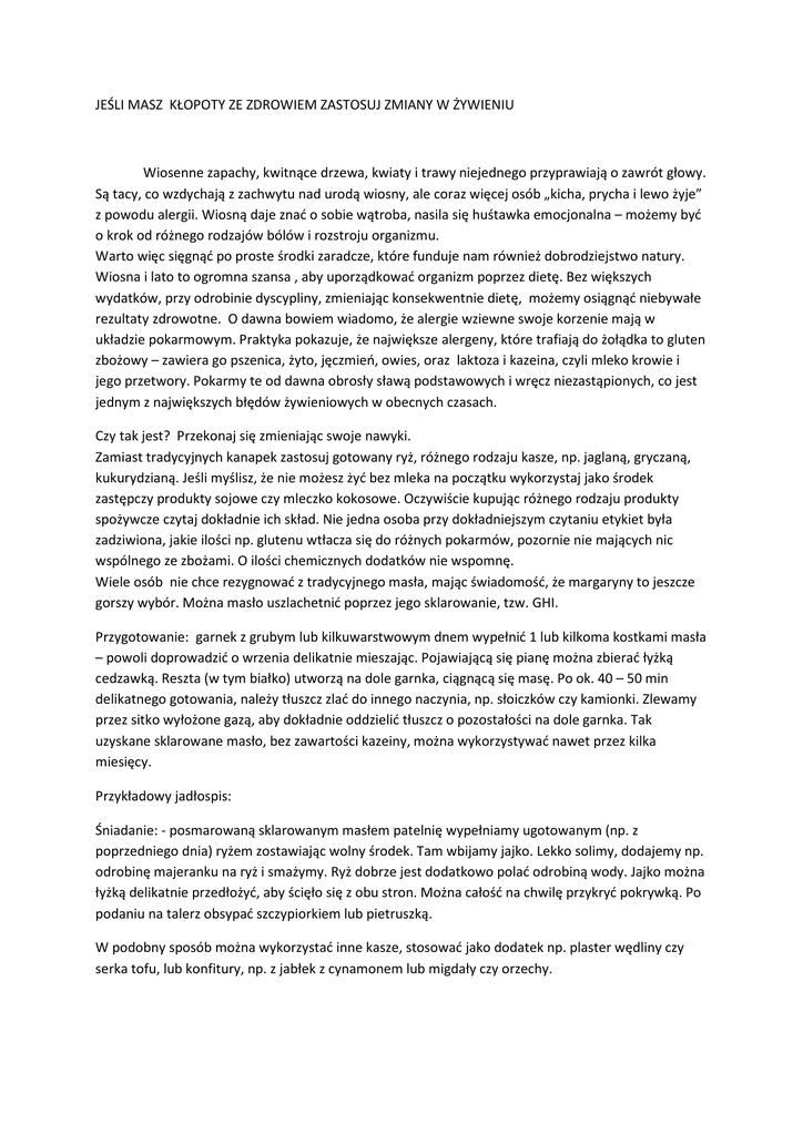 JEŚLI MASZ KŁOPOTY ZE ZDROWIEM ZASTOSUJ ZMIANY W ŻYWIENIU Wiosenne zapachy, kwitnące drzewa, kwiaty i trawy niejednego przyprawiają o zawrót głowy. Są tacy, co wzdychają z zachwytu nad urodą wiosny, ale coraz więcej osób „kicha, prycha i lewo żyje” z powodu alergii. Wiosną daje znać o sobie wątroba, nasila się huśtawka emocjonalna – możemy być o krok od różnego rodzajów bólów i rozstroju organizmu. Warto więc sięgnąć po proste środki zaradcze, które funduje nam również dobrodziejstwo natury. Wiosna i lato to ogromna szansa , aby uporządkować organizm poprzez dietę. Bez większych wydatków, przy odrobinie dyscypliny, zmieniając konsekwentnie dietę, możemy osiągnąć niebywałe rezultaty zdrowotne. O dawna bowiem wiadomo, że alergie wziewne swoje korzenie mają w układzie pokarmowym. Praktyka pokazuje, że największe alergeny, które trafiają do żołądka to gluten zbożowy – zawiera go pszenica, żyto, jęczmień, owies, oraz laktoza i kazeina, czyli mleko krowie i jego przetwory. Pokarmy te od dawna obrosły sławą podstawowych i wręcz niezastąpionych, co jest jednym z największych błędów żywieniowych w obecnych czasach. Czy tak jest? Przekonaj się zmieniając swoje nawyki. Zamiast tradycyjnych kanapek zastosuj gotowany ryż, różnego rodzaju kasze, np. jaglaną, gryczaną, kukurydzianą. Jeśli myślisz, że nie możesz żyć bez mleka na początku wykorzystaj jako środek zastępczy produkty sojowe czy mleczko kokosowe. Oczywiście kupując różnego rodzaju produkty spożywcze czytaj dokładnie ich skład. Nie jedna osoba przy dokładniejszym czytaniu etykiet była zadziwiona, jakie ilości np. glutenu wtłacza się do różnych pokarmów, pozornie nie mających nic wspólnego ze zbożami. O ilości chemicznych dodatków nie wspomnę. Wiele osób nie chce rezygnować z tradycyjnego masła, mając świadomość, że margaryny to jeszcze gorszy wybór. Można masło uszlachetnić poprzez jego sklarowanie, tzw. GHI. Przygotowanie: garnek z grubym lub kilkuwarstwowym dnem wypełnić 1 lub kilkoma kostkami masła – powoli doprowadzić o wrzenia delikatnie mieszając. Pojawiającą się pianę można zbierać łyżką cedzawką. Reszta (w tym białko) utworzą na dole garnka, ciągnącą się masę. Po ok. 40 – 50 min delikatnego gotowania, należy tłuszcz zlać do innego naczynia, np. słoiczków czy kamionki. Zlewamy przez sitko wyłożone gazą, aby dokładnie oddzielić tłuszcz o pozostałości na dole garnka. Tak uzyskane sklarowane masło, bez zawartości kazeiny, można wykorzystywać nawet przez kilka miesięcy. Przykładowy jadłospis: Śniadanie: - posmarowaną sklarowanym masłem patelnię wypełniamy ugotowanym (np. z poprzedniego dnia) ryżem zostawiając wolny środek. Tam wbijamy jajko. Lekko solimy, dodajemy np. odrobinę majeranku na ryż i smażymy. Ryż dobrze jest dodatkowo polać odrobiną wody. Jajko można łyżką delikatnie przedłożyć, aby ścięło się z obu stron. Można całość na chwilę przykryć pokrywką. Po podaniu na talerz obsypać szczypiorkiem lub pietruszką. W podobny sposób można wykorzystać inne kasze, stosować jako dodatek np. plaster wędliny czy serka tofu, lub konfitury, np. z jabłek z cynamonem lub migdały czy orzechy. Kanapka wiosenna 3 liście sałaty z plastrem tofu wędzonego + ogórek małosolny do środka zwinąć jak naleśnik. Obiad: - wiosenna zupa szczawiowa z pokrzywą. Przygotować wywar z włoszczyzny, którą w całości drobno kroimy + ziemniaki i przyprawy wg upodobania. Gdy będą już miękkie dodajemy szczaw i pokrzywę w równej proporcji – drobno pokrojone. Chwilę gotujemy. Uwaga: pokrzywy przed krojeniem należy przelać gorącą wodą, lub włożone w złożoną na pół ściereczkę oklepujemy – wówczas podczas krojenia nie będą parzyły! W tym czasie na łyżce masła sklarowanego podsmażamy cebulę i dodajemy 1 łyżkę mąki kukurydzianej, mieszamy, po chwili zalewamy ½ szklanki zimnej wody – szybko mieszając dodajemy do zupy. Tę zupę można podawać z gotowanym jajkiem lub z dodatkiem mleka sojowego. - II danie Ziemniaczki dobrze umyte gotować w mundurkach. Podawać na talerz w całości z oliwką smakową, solą i pieprzem. Dodatkiem mogą być kalafior lub brokuł gotowane na parze lub krótko smażone w cieście (jajko + mąka kukurydziana, ew. amarantusowa + sól). Tak przygotowane ziemniaki czy warzywa mogą być wykorzystane do tworzenia różnego rodzaju zapiekanek lub podsmażania. Danie można wzbogacić sztuką mięsa, ryby czy tofu. Czasami zamiast całego drugiego dania warto ugotować posiłek jednorodny, np. fasolę szparagową z dodatkiem dobrego oleju i ziół, lub masła podsmażonego z mąką kukurydzianą o polania. Podwieczorek: - owoce lub surówka z młodej kapusty czy młode marchewki, dla dzieci dodatek zbóż w postaci np. chrupków. Kolacja: - Cukinia lub kabaczek + kasza jaglana (ciemny ryż, kasza kukurydziana)+ cebula + natka pietruszki + nasiona słonecznika (1 łyżka). Cukinię należy przekroić wzdłuż, wydrążyć pestki i odrzucić. Następnie wydrążyć jeszcze trochę miąższu. Na patelni zeszklić cebulę (można dodać pieczarki) z solą i pieprzem, dodać wydrążone, drobno pokrojone kawałki cukinii i razem chwilę podsmażyć. Następnie wymieszać pestki słonecznika, natkę pietruszki z kaszą i zawartością patelni. Tym nadzieniem wypełnić oprószone solą i ziołami połówki cukini. Całość zapiec przez ok. 30 min w piekarniku, w trakcie delikatnie posmarować po wierzchu tłuszczem. Przestawione przepisy, mam nadzieję, że staną się bodźcem do tworzenia nowych – własnych dań, bogatych w energię i wartościowe składniki, a także zachęcającą do tego, aby obserwować reakcje organizmu na to, czym go karmimy. Małgorzata Worsztynowicz