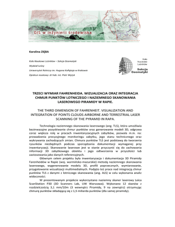 Karolina ZIĘBA Koło Naukowe Leśników – Sekcja Geomatyki Wydział Leśny Uniwersytet Rolniczy im. Hugona Kołłątaja w Krakowie Opiekun naukowy: dr hab. inż. Piotr Wężyk TRZECI WYMIAR FAHRENHEIDA. WIZUALIZACJA ORAZ INTEGRACJA CHMUR PUNKTÓW LOTNICZEGO I NAZIEMNEGO SKANOWANIA LASEROWEGO PIRAMIDY W RAPIE. THE THIRD DIMENSION OF FAHRENHEIT. VISUALIZATION AND INTEGRATION OF POINTS CLOUDS AIRBORNE AND TERRESTRIAL LASER SCANNING OF THE PYRAMID IN RAPA. Technologia naziemnego skanowania laserowego (ang. TLS), która umożliwia bezinwazyjne pozyskiwanie chmur punktów oraz generowanie modeli 3D, odgrywa coraz większa rolę w pracach inwentaryzacyjnych zabytków, pozwala m.in. na: prowadzenia precyzyjnego monitoringu zabytku, jego stanu technicznego oraz wykrywania zachodzących zmian. Chmura punktów TLS jest podstawą do tworzenia rysunków niezbędnych podczas sporządzania dokumentacji wymaganej przy inwentaryzacji. Skanowanie laserowe jest w stanie przyczynić się do zachowania informacji 3D zabytkowego obiektu i jego odtworzenia w przyszłości lub zastosowania jako danych referencyjnych. Głównym celem projektu była inwentaryzacja i dokumentacja 3D Piramidy Farenheidów w Rapie (woj. warmińsko-mazurskie) metodą naziemnego skanowania laserowego, wygenerowanie modelu 3D, profili poprzecznych, wymiarowanie, przygotowanie wizualizacji multimedialnych. Podjęto też prace nad integracją chmur punktów TLS z danymi z lotniczego skanowania (ang. ALS) w celu wykonania analiz widoczności. W prezentowanym projekcie wykorzystano naziemny skaner laserowy Leica ScanStation P30 (3D Scanners Lab, UW Warszawa). Wykonano 12 skanów z rozdzielczością 3,1 mm/10m (3 wewnątrz Piramidy, 9 na zewnątrz) otrzymując chmurę punktów składającą się z 1,5 miliarda punktów (dla samej piramidy). Integracja danych z lotniczego i naziemnego skanowania laserowego pozwoliła na wykonanie analiz przestrzennych GIS i rekompozycji krajobrazu w otoczeniu zabytkowego obiektu. Dzięki integracji danych ALS i TLS oraz modelowi 3D możliwe jest tworzenie wirtualnych wycieczek, animacji prezentujących obiekt pomiarów. Technologia ALS sprawdza się tutaj jako uzupełnienie do pomiarów górnych partii mierzonego obiektu oraz całego otoczenia, poprzez ich umieszczenie w jednym układzie współrzędnych. Zastosowane oprogramowanie z zakresu GIS oraz CAD pozwoliło na szybkie opracowanie dokumentacji i wizualizacji 3D Piramidy w Rapie oraz na podstawie danych ALS umożliwiło wykrycie historycznych obiektów z nią związanych i powiązanych niegdyś widokowo. BIBLIOGRAFIA [1] Wężyk P. (Ed.) 2014. Podręcznik dla uczestników szkoleń z wykorzystania produktów LiDAR. Warszawa, s. 328, ISBN: 978-83-254-2090-1 [2] Wężyk P., 2015. Making the invisible visible the DTM modelling in complex environments. In: Geomorphometry for Geosciences. Jasiewicz J., Zwoliński Z., Mitasova H., and Hengl T. (Eds.). Adam Mickiewicz University in Poznań - Institute of Geoecology and Geoinformation, International Society forGeomorphometry. Bogucki Wydawnictwo Naukowe, 57-60, Poznań, Poland: 57-60 [3] Wężyk P., Szostak M., Rysiak P., Zięba K, Hawryło P., Ratajczak M. 2015. Dąb Bartek 3D - naziemne skanowanie laserowe 3D pomników przyrody - nowy wymiar edukacji przyrodniczej. CEPL. R.17 Zeszyt 43/2/2015, s 7-15
