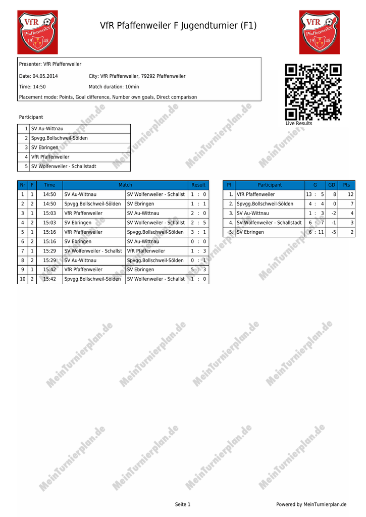 VfR Pfaffenweiler F Jugendturnier (F1) Presenter: VfR Pfaffenweiler Date: 04.05.2014 City: VfR Pfaffenweiler, 79292 Pfaffenweiler Time: 14:50 Match duration: 10min Placement mode: Points, Goal difference, Number own goals, Direct comparison Participant Live Results 1 SV Au-Wittnau 2 Spvgg.Bollschweil-Sölden 3 SV Ebringen 4 VfR Pfaffenweiler 5 SV Wolfenweiler - Schallstadt Nr F Time 1 1 14:50 SV Au-Wittnau Match SV Wolfenweiler - Schallst 1 : 0 Result Pl 1. VfR Pfaffenweiler Participant 2 2 14:50 Spvgg.Bollschweil-Sölden SV Ebringen 1 : 1 3 1 15:03 VfR Pfaffenweiler SV Au-Wittnau 4 2 15:03 SV Ebringen 5 1 15:16 6 2 7 1 8 G GD Pts 13 : 5 8 12 2. Spvgg.Bollschweil-Sölden 4 : 4 0 7 2 : 0 3. SV Au-Wittnau 1 : 3 -2 4 SV Wolfenweiler - Schallst 2 : 5 4. SV Wolfenweiler - Schallstadt 6 : 7 -1 3 VfR Pfaffenweiler Spvgg.Bollschweil-Sölden 3 : 1 5. SV Ebringen 6 : 11 -5 2 15:16 SV Ebringen SV Au-Wittnau 0 : 0 15:29 SV Wolfenweiler - Schallst VfR Pfaffenweiler 1 : 3 2 15:29 SV Au-Wittnau Spvgg.Bollschweil-Sölden 0 : 1 9 1 15:42 VfR Pfaffenweiler SV Ebringen 5 : 3 10 2 15:42 Spvgg.Bollschweil-Sölden SV Wolfenweiler - Schallst 1 : 0 Seite 1 Powered by MeinTurnierplan.de
