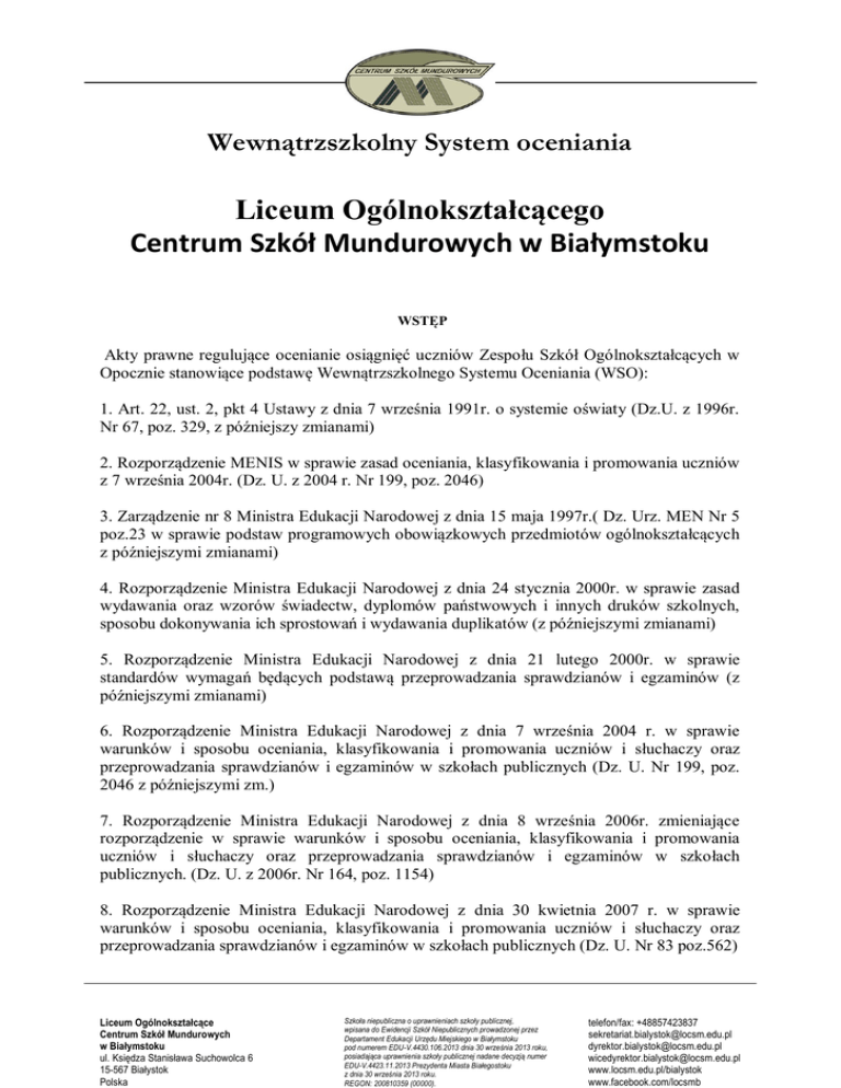 Wewnątrzszkolny System oceniania Liceum Ogólnokształcącego Centrum Szkół Mundurowych w Białymstoku WSTĘP Akty prawne regulujące ocenianie osiągnięć uczniów Zespołu Szkół Ogólnokształcących w Opocznie stanowiące podstawę Wewnątrzszkolnego Systemu Oceniania (WSO): 1. Art. 22, ust. 2, pkt 4 Ustawy z dnia 7 września 1991r. o systemie oświaty (Dz.U. z 1996r. Nr 67, poz. 329, z późniejszy zmianami) 2. Rozporządzenie MENIS w sprawie zasad oceniania, klasyfikowania i promowania uczniów z 7 września 2004r. (Dz. U. z 2004 r. Nr 199, poz. 2046) 3. Zarządzenie nr 8 Ministra Edukacji Narodowej z dnia 15 maja 1997r.( Dz. Urz. MEN Nr 5 poz.23 w sprawie podstaw programowych obowiązkowych przedmiotów ogólnokształcących z późniejszymi zmianami) 4. Rozporządzenie Ministra Edukacji Narodowej z dnia 24 stycznia 2000r. w sprawie zasad wydawania oraz wzorów świadectw, dyplomów państwowych i innych druków szkolnych, sposobu dokonywania ich sprostowań i wydawania duplikatów (z późniejszymi zmianami) 5. Rozporządzenie Ministra Edukacji Narodowej z dnia 21 lutego 2000r. w sprawie standardów wymagań będących podstawą przeprowadzania sprawdzianów i egzaminów (z późniejszymi zmianami) 6. Rozporządzenie Ministra Edukacji Narodowej z dnia 7 września 2004 r. w sprawie warunków i sposobu oceniania, klasyfikowania i promowania uczniów i słuchaczy oraz przeprowadzania sprawdzianów i egzaminów w szkołach publicznych (Dz. U. Nr 199, poz. 2046 z późniejszymi zm.) 7. Rozporządzenie Ministra Edukacji Narodowej z dnia 8 września 2006r. zmieniające rozporządzenie w sprawie warunków i sposobu oceniania, klasyfikowania i promowania uczniów i słuchaczy oraz przeprowadzania sprawdzianów i egzaminów w szkołach publicznych. (Dz. U. z 2006r. Nr 164, poz. 1154) 8. Rozporządzenie Ministra Edukacji Narodowej z dnia 30 kwietnia 2007 r. w sprawie warunków i sposobu oceniania, klasyfikowania i promowania uczniów i słuchaczy oraz przeprowadzania sprawdzianów i egzaminów w szkołach publicznych (Dz. U. Nr 83 poz.562) Liceum Ogólnokształcące Centrum Szkół Mundurowych w Białymstoku ul. Księdza Stanisława Suchowolca 6 15-567 Białystok Polska Szkoła niepubliczna o uprawnieniach szkoły publicznej, wpisana do Ewidencji Szkół Niepublicznych prowadzonej przez Departament Edukacji Urzędu Miejskiego w Białymstoku pod numerem EDU-V.4430.106.2013 dnia 30 września 2013 roku, posiadająca uprawnienia szkoły publicznej nadane decyzją numer EDU-V.4423.11.2013 Prezydenta Miasta Białegostoku z dnia 30 września 2013 roku. REGON: 200810359 (00000). telefon/fax: +48857423837 [email protected] [email protected] [email protected] www.locsm.edu.pl/bialystok www.facebook.com/locsmb 9. Rozporządzenie Ministra Edukacji Narodowej z dnia 25 września 2008 r. zmieniające rozporządzenie w sprawie warunków i sposobu oceniania, klasyfikowania i promowania uczniów i słuchaczy oraz przeprowadzania sprawdzianów i egzaminów w szkołach publicznych (Dz. U. Nr 178, poz. 1097) 10. Rozporządzenie Ministra Edukacji Narodowej z dnia 26 sierpnia 2009 r. zmieniające rozporządzenie w sprawie warunków i sposobu oceniania, klasyfikowania i promowania uczniów i słuchaczy oraz przeprowadzania sprawdzianów i egzaminów w szkołach publicznych (Dz. U. nr 141, poz. 1150) 11. Rozporządzenie Ministra Edukacji Narodowej z dnia 29 maja 2009 r. zmieniające rozporządzenie w sprawie warunków i sposobu oceniania, klasyfikowania i promowania uczniów i słuchaczy oraz przeprowadzania sprawdzianów i egzaminów w szkołach publicznych (Dz. U. nr 83, poz. 694) 12. Rozporządzenie Ministra Edukacji Narodowej z dnia 31 marca 2009 r. zmieniające rozporządzenie w sprawie warunków i sposobu oceniania, klasyfikowania i promowania uczniów i słuchaczy oraz przeprowadzania sprawdzianów i egzaminów w szkołach publicznych (Dz.U. nr 58, poz.475 13. Rozporządzenie Ministra Edukacji Narodowej z dnia 20 sierpnia 2010 zmieniające rozporządzenie w sprawie warunków i sposobu oceniania, klasyfikowania i promowania uczniów i słuchaczy oraz przeprowadzania sprawdzianów i egzaminów w szkołach publicznych Na podstawie art. 22 ust. 2 pkt 4 ustawy z dnia 7 września 1991 r. o systemie oświaty (Dz. U. z 2004 r. Nr 256, poz. 2572, z późn. Zm.) §1 1. Wewnątrzszkolny System Oceniania, zwany dalej WSO, określa szkolne zasady oceniania, klasyfikowania i promowania uczniów oraz przeprowadzania egzaminów. 2. WSO jest zgodny z aktualnymi rozporządzeniami ministra właściwego do spraw oświaty i wychowania w sprawie warunków i sposobu oceniania, klasyfikowania i promowania uczniów oraz przeprowadzania sprawdzianów i egzaminów w szkołach publicznych. 3. Na WSO składają się: 1) szkolne zasady oceniania osiągnięć edukacyjnych uczniów; 2) ocenianie zachowania uczniów; 3) zasady klasyfikowania i promowania uczniów. 4. Przedmiotowe zasady oceniania osiągnięć edukacyjnych uczniów zawarte są w Przedmiotowych Systemach Oceniania, dalej zwanych PSO. 5. Zasady przeprowadzania egzaminu maturalnego regulują odrębne przepisy. 6. Zasady oceniania religii regulują odrębne przepisy. 7. Zasady realizacji przez ucznia indywidualnego programu lub toku nauki regulują odrębne przepisy. §2 1. Ocenianiu podlegają: 1) osiągnięcia edukacyjne ucznia; Liceum Ogólnokształcące Centrum Szkół Mundurowych w Białymstoku ul. Księdza Stanisława Suchowolca 6 15-567 Białystok Polska Szkoła niepubliczna o uprawnieniach szkoły publicznej, wpisana do Ewidencji Szkół Niepublicznych prowadzonej przez Departament Edukacji Urzędu Miejskiego w Białymstoku pod numerem EDU-V.4430.106.2013 dnia 30 września 2013 roku, posiadająca uprawnienia szkoły publicznej nadane decyzją numer EDU-V.4423.11.2013 Prezydenta Miasta Białegostoku z dnia 30 września 2013 roku. REGON: 200810359 (00000). telefon/fax: +48857423837 [email protected] [email protected] [email protected] www.locsm.edu.pl/bialystok www.fa