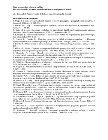 Stan przyzębia a zdrowie ogólne The relationship between periodontal status and general health lek. dent. Jakub Waszyrowski, dr hab. n. med. Sebastian K. Kłosek Piśmiennictwo/References: 1. Stopa J. i wsp.: Związek chorób naczyń i chorób przyzębia – przegląd piśmiennictwa. J. Stomatol. 2012, 65, 4, 543–554. 2. Hujoel P.P. i wsp.: The dentogingival epithelial surface area revisited. J. Periodontal Res., 2001, 36, 1: 48–55. 3. Sanz M. i wsp.: European workshop in periodontal health and cardiovascular disease. European Heart Journal Supplements 2010, 12, supplement B, B2. 4. Konopka T.: Periodontal medicine – nowy obszar badań we współczesnej periodontologii. Por. Stomatol., 2003, 8, 38–44. 5. Franek E., Górska R.: Choroby przyzębia a układ sercowo-naczyniowy – kliniczna interpretacja badania stomatologicznego. Choroby Serca i Naczyń, 2009, 6, 3: 142–146. 6. Górska R.: Miniony rok w periodontologii – moje refleksje. Mag. Stomatol., 2012, 3: 103– 105. 7. Górska R. i wsp.: Częstość występowania chorób przyzębia u osób w wieku 35–44 lat w populacji dużych aglomeracji miejskich. Dent. Med. Probl., 2012, 49, 1: 19–27. 8. Kłosińska A. i wsp.: Choroby przyzębia a ryzyko chorób sercowo-naczyniowych – przegląd badań epidemiologicznych. Kardiologia Polska, 2010, 68, 8: 973–976. 9. Peterson-Jęckowska R., Kłosek S.: Manifestacje chorób ogólnoustrojowych w jamie ustnej. Komentarz do artykułu. Lekarz Rodzinny, 2011, 16, 5: 533–535. 10. Wild S.: Global prevalence of diabetes: estimates for the year 2000 and projections for 2030, Diabetes Care, 2004, 27, 5: 1047–1053. 11. Nagata T.: Relationship between diabetes and periodontal disease. Clin Calcium, 2009, 19, 9: 1291–1298. 12. Górska R.: Sprawozdanie z niezależnego Panelu Ekspertów na temat związku chorób przyzębia z chorobami ogólnoustrojowymi. Nowa Stomatol., 2009, 1–2: 49–52. 13. Shultis W.A. i wsp.: Effect of periodontitis on overt nephropathy and end-stage renal disease in type 2 diabetes. Diabetes Care, 2007, 30, 2: 306–311. 14. Pereira R.B. i wsp.: Oral P. gingivalis infection alters the vascular reactivity in healthy and spontaneously atherosclerotic mice. Lipids Health Dis., 2011, 10: 80. 15. Saadi-Thiers K. i wsp.: Periodontal and systemic responses in various mice models of experimental periodontitis: respective roles of inflammation duration and porphyromonas gingivalis infection. J. Periodontol., 2013 84, 3: 396–406. 16. Bouchard P. i wsp.: European workshop in periodontal health and cardiovascular disease consensus document. Europ. Heart J. Suppl., 2010, 12: B13–B22. 17. Puchalska-Niedbał L., Dojs A., Opalko K.: Czy zaawansowane stany zapalne przyzębia mają wpływ na stan okulistyczny chorych? Mag. Stomatol., 2012, 7–8: 45–48. 18. Grau A.J. i wsp.: Periodontal disease as a risk factor for ischemic stroke. Stroke, 2004, 35, 2: 496–501. 19. Pussinen P.J. i wsp.: Systemic exposure to Porphyromonas gingivalis predicts incident stroke. Atherosclerosis, 2007, 193, 1: 222–228. 20. Konopka T.: Związek pomiędzy chorobami przyzębia a udarem mózgu – analiza krytyczna dotychczasowych badań. Czas. Stomatol., 2009, 62, 7: 567–577.