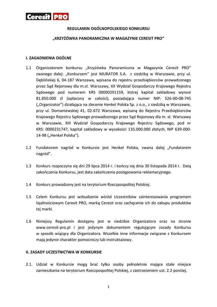 REGULAMIN OGÓLNOPOLSKIEGO KONKURSU „KRZYŻÓWKA PANORAMICZNA W MAGAZYNIE CERESIT PRO” I. ZAGADNIENIA OGÓLNE 1.1 Organizatorem konkursu „Krzyżówka Panoramiczna w Magazynie Ceresit PRO” zwanego dalej: „Konkursem” jest MURATOR S.A. z siedzibą w Warszawie, przy ul. Dęblińskiej 6, 04-187 Warszawa, wpisana do rejestru przedsiębiorców prowadzonego przez Sąd Rejonowy dla m.st. Warszawy, XII Wydział Gospodarczy Krajowego Rejestru Sądowego pod numerem KRS 00000291159, której kapitał zakładowy wynosi 81.850.000 zł (opłacony w całości), posiadająca numer NIP: 526-00-08-745 („Organizator”) działająca na zlecenie Henkel Polska Sp. z o.o., z siedzibą w Warszawie, przy ul. Domaniewskiej 41, 02-672 Warszawa, wpisaną do Rejestru Przedsiębiorców Krajowego Rejestru Sądowego prowadzonego przez Sąd Rejonowy dla m. st. Warszawy w Warszawie, XIII Wydział Gospodarczy Krajowego Rejestru Sądowego, pod nr KRS: 0000231747, kapitał zakładowy w wysokości 135.000.000 złotych, NIP 639-00014-98 („Henkel Polska”). 1.2 Fundatorem nagród w Konkursie jest Henkel Polska, zwana dalej „Fundatorem nagród”. 1.3 Konkurs rozpoczyna się dni 29 lipca 2014 r. i kończy się dnia 30 listopada 2014 r. Datą zakończenia Konkursu, jest data zakończenia postępowania reklamacyjnego. 1.4 Konkurs prowadzony jest na terytorium Rzeczpospolitej Polskiej. 1.5 Celem Konkursu jest wzbudzenie wśród Uczestników zainteresowania programem lojalnościowym Ceresit PRO, marką Ceresit oraz zachęcenie ich do zakupu produktów tej marki. 1.6 Niniejszy Regulamin dostępny jest w siedzibie Organizatora oraz na stronie www.ceresit-pro.pl i jest jedynym dokumentem regulującym zasady Konkursu w sposób wiążący dla Organizatora. Wszelkie inne informacje związane z Konkursem mają jedynie charakter pomocniczy lub instruktażowy. II. ZASADY UCZESTNICTWA W KONKURSIE 2.1. Udział w Konkursie mogą brać tylko osoby pełnoletnie mające stałe miejsce zamieszkania na terytorium Rzeczpospolitej Polskiej, z zastrzeżeniem ust. 2.2 poniżej. 1 2.2. W Konkursie nie mogą brać udziału pracownicy Organizatora, Fundatora oraz Spółki i360 Sp. z o.o., ani osoby które wykonują pracę lub czynności na ich rzecz na podstawie innego niż stosunek prawny tytułu prawnego, ani też członkowie najbliższej rodziny wymienionych osób. Przez członków najbliższej rodziny rozumieć należy wstępnych, zstępnych, rodzeństwo, małżonków, małżonków rodzeństwa, rodziców małżonków, kuzynów oraz osoby pozostające w stosunku przysposobienia. 2.3. Konkurs polega na tym, że osoby, o których mowa w pkt 2.1, które rozwiązały krzyżówkę panoramiczną zamieszczoną w wydaniu czasopisma Ceresit PRO nr2(4)/2014, mogą w celu uzyskania nagrody przesłać swoje zgłoszenie zawierające hasło stanowiące rozwiązanie krzyżówki oraz odpowiedź na pytanie konkursowe podane w czasopiśmie Ceresit PRO nr 2(4)/2014 bezpośrednio pod krzyżówką, na adres email [email protected]. Z chwilą przesłania powyższych danych wraz z informacjami, o których mowa w pkt 2.4 stają się oni Uczestnikami Konkursu („Uczestnicy”). 2.4. Wraz ze zgłoszeniem Uczestnik zobowiązany jest podać swój numer telefonu oraz adres korespondencyjny. 2.5. Zgłoszenia do konkursu można przesyłać do dnia 29 sierpnia 2014 r. 2.6. Organizatorowi przysługuje prawo do odmowy zarejestrowania w Konkursie zgłoszenia niespełniającego warunków wskazanych w niniejszym Regulaminie. III. NAGRODY 3.1. W Konkursie Laureatowi przyznana zostanie 1 nagroda w postaci zegarka Casio AE 2000W-1AV o wartości rynkowej 219,00 zł brutto (słownie: dwieście dziewiętnaście zł 00/100). Organizator zastrzega, iż kolor prezentowanej nagrody w magazynie Ceresit PRO może różnić się kolorem od nagrody otrzymanej jednak rodzaj i wartość nagrody nie ulegną zmianie. 3.2. Wartość nagrody nie przekroczy 760 zł (siedmiuset sześćdziesięciu złotych) i w związku z powyższym Laureat będący osobą fizyczną nieprowadzącą działalności gospodarczej korzysta ze zwolnienia od opodatkowania podatkiem dochodowym na podstawie art. 21 ust. 1 pkt 68 ustawy z dnia 26 lipca 1991 r. o podatku dochodowym od osób fizycznych. 3.3. Zwolnienie od podatku nie dotyczy nagrody otrzymanej przez podatnika w związku z prowadzoną przez niego pozarolniczą działalnością gospodarczą, stanowiących przychód z tej działalności. 2 3.3. Nagroda nie podlega zamianie na ekwiwalent pieniężny. IV. WYŁANIANIE LAUREATA 4.1. Wyłonienie Laureata Konkursu następować będzie w drodze decyzji Komisji konkursowej powoływanej przez Organizatora („Komisja konkursowa”). 4.2. Komisja konkursowa składa się, z co najmniej 3 (trzech) Ekspertów. Członkowie komisji wybierają spośród siebie Przewodniczącego Komisji konkursowej („Przewodniczący”). 4.3. Fundatorowi nagród Konkursu przysługuje prawo wskazania jednego eksperta, który w jego imieniu będzie sprawował funkcję Członka komisji konkursowej. 4.4. Komisja konkursowa wybiera spośród zgłoszeń prawidłowo zarejestrowanych jedną odpowiedź na pytanie konkursowe, którego autorowi przyznaje prawo do odebrania nagrody. Kryterium wyboru Laureata jest podanie prawidłowego hasła krzyżówki oraz najbardziej kreatywna w ocenie Komisji odpowiedź na pytanie konkursowe. 4.5. Posiedzenie Komisji konkursowej odbędzie się w ciągu 14 dni od daty zakończenia przyjmowania zgłoszeń konkursowych, o której mowa w pkt 2.5 powyżej, tj. nie później niż dnia 12 września 2014 r. 4.6. O decyzji Komisji konkursowej Laureat Konkursu zostanie powiadomiony w ciągu 14 dni od dnia wyłonienia laureata, tj. nie później niż dnia 26 września 2014 r. Powiadomienie nastąpi telefonicznie na numer telefonu podany w zgłoszeniu lub za pośrednictwem poczty email, na adres z której nadeszło zgłoszenie rejestracyjne. 4.7. Od decyzji Komisji konkursowej Uczestnikom przysługuje odwołanie do Sądu Pows