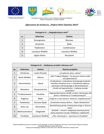 Europejski Fundusz Rolny na rzecz Rozwoju Obszarów Wiejskich Europejski Fundusz Rolny na rzecz Rozwoju Obszarów Wiejskich: Europa inwestująca w obszary wiejskie Zgłoszenia do konkursu „Piękna Wieś Opolska 2014” Kategoria A : „Najpiękniejsza wieś” Lp. Sołectwo Gmina 1 Dziergowice Bierawa 2 Gostomia Biała 3 Piątkowice Łambinowice 4 Lasowice Wielkie Lasowice Wielkie 5 Ligota Dolna Kluczbork Kategoria B : „Najlepszy projekt odnowy wsi” Lp. Sołectwo Gmina Nazwa projektu 1 Chróścina Lewin Brzeski „Urządzenie placu zabaw” 2 Borki Wielkie 3 Sieroniowice 4 Wawelno 5 Trzeboszowice 6 Pogórze Biała „Pogórze w oku kamery. Historia i współczesność” 7 Pawłowice Gorzów Śląski „Pawłowice bawią okolice – Śląski Oktoberfest” 8 Stary Las Głuchołazy 9 Biedrzychowice Głogówek 10 Chudoba Lasowice Wielkie „Izba Tradycji Śląskiej – Co jeszcze można ocalić od Zapomnienia” „Przebudowa i rozbudowa istniejącego budynku świetlicy wiejskiej wraz z rozbudową zaplecza Ujazd sportowo-rekreacyjnego w Sieroniowicach” „Ocalić od zapomnienia – tradycja przede Komprachcice wszystkim” „Zagospodarowanie działki na plac rekreacyjny dla Paczków dzieci i młodzieży w Trzeboszowicach” Olesno „Rewitalizacja grodu średniowiecznego w Starym Lesie” „Wielołk – remont i adaptacja pomieszczenia starej wozowni na piec chlebowy i wędzarnik” „Plac rekreacyjno – sportowy w Chudobie” Projekt współfinansowany ze środków Unii Europejskiej w ramach Schematu III Pomocy Technicznej Programu Rozwoju Obszarów Wiejskich na lata 2007-2013. Instytucja Zarządzająca PROW na lata 2007-2013: Minister Rolnictwa i Rozwoju Wsi Europejski Fundusz Rolny na rzecz Rozwoju Obszarów Wiejskich Europejski Fundusz Rolny na rzecz Rozwoju Obszarów Wiejskich: Europa inwestująca w obszary wiejskie Kategoria C : „Wieś przeżyć i emocji” Lp. Sołectwo Gmina 1 Lubieszów Bierawa 2 Kadłub Strzelce Opolskie 3 Pawłowice Gorzów Śląski 4 Żędowice Zawadzkie 5 Staniszcze Małe Kolonowskie Projekt współfinansowany ze środków Unii Europejskiej w ramach Schematu III Pomocy Technicznej Programu Rozwoju Obszarów Wiejskich na lata 2007-2013. Instytucja Zarządzająca PROW na lata 2007-2013: Minister Rolnictwa i Rozwoju Wsi