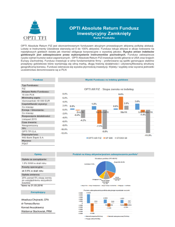 OPTI Absolute Return Fundusz Inwestycyjny Zamknięty Karta Produktu OPTI Absolute Return FIZ jest skoncentrowanym funduszem akcyjnym prowadzącym aktywną politykę alokacji. Lokaty w Instrumenty Udziałowe stanowią od 0 do 100% aktywów. Fundusz lokuje aktywa w akcje notowane na największych giełdach świata jak również obligacje korporacyjne o wysokiej jakości. Ryzyko zmian indeksów giełdowych jest zabezpieczane przez wykorzystanie instrumentów pochodnych. Fundusz zabezpiecza ryzyko wahań kursów walut zagranicznych. OPTI Absolute Return FIZ inwestuje śordki głównie w USA oraz krajach Europy Zachodniej. Fundusz inwestuje w silne fundamentalnie firmy - preferowane są spółki generujące stabilne przepływy gotówkowe które wyróżniają się silną marką, długą historią działalności i zdywersyfikowaną strukturę geograficzną biznesu. Fundusz odznacza się wysoka płynnością inwestycji. Wpłaty / wypłaty oraz wycena jednostki uczestnictwa denominowane są w PLN Fundusz Wyniki Funduszu vs indeksy giełdowe Typ Funduszu: FIZ Aktywa Netto Funduszu: 15 mln PLN Minimalny zapis: równowartość 40 000 EUR Częstotliwość wyceny: Co miesiąc Emisje / Umorzenia: Co miesiąc Rozpoczęcie działalności Listopad 2015 Czas trwania: Nieograniczony TFI: OPTI TFI S.A. Depozytariusz: ING Bank Śląski S.A. Wycena: PSAT Opłaty Opłata za zarządzanie: 1.9% WAN w skali roku Koszty operacyjne: ok 0.5% w skali roku Opłata zmienna: 25% ponad 5% stopę zwrotu po uwzględnieniu wszystkich kosztów *dane na 31.03.2016 Zarządzający Arkadiusz Chojnacki, CFA dr Tomasz Bursa Konrad Anuszkiewicz Waldemar Stachowiak, PRM Podział na klasy aktywów/poziom zabezpieczenia portfela* Zastrzeżenia prawne OPTI TFI S.A.. dołożyła należytych starań, aby zamieszczone informacje były rzetelne i oparte na miarodajnych źródłach, jednak ryzyko związane z wszelkimi decyzjami podjętymi na podstawie informacji zawartych w niniejszym materiale, w szczególności decyzji inwestycyjnej, ponosi wyłącznie osoba podejmująca te decyzje. Niniejszy materiał ma wyłącznie charakter informacyjny i nie stanowi oferty ani rekomendacji do zawarcia transakcji kupna lub sprzedaży jakiegokolwiek instrumentu finansowego. Podane informacje nie mogą być traktowane jako usługa doradztwa inwestycyjnego lub innego typu doradztwa, w tym świadczenia pomocy prawnej. Rozpowszechnianie oraz publikowanie informacji zawartych w niniejszym materiale informacyjnym bez zgody OPTI TFI S.A. jest zabronione. Zamieszczone w niniejszej publikacji informacje dotyczące OPTI Absolute Return FIZ (zwanego dalej „Funduszem”) nie są i nie mogą być traktowane jako proponowanie nabycia certyfikatów inwestycyjnych, ani proponowanie złożenia zapisu na certyfikaty inwestycyjne, jak również nie stanowią oferty w rozumieniu przepisów Kodeksu cywilnego. Niniejsza publikacja ma wyłącznie charakter informacyjny. Wartość aktywów netto Funduszu może cechować się dużą zmiennością, ze względu na skład portfela, a w szczególności inwestowanie aktywów w instrumenty udziałowe i instrumenty pochodne. Fundusz nie gwarantuje realizacji założonego celu inwestycyjnego, ani uzyskania określonego wyniku inwestycyjnego. Uczestnik Funduszu musi liczyć się z możliwością utraty całości lub części wpłaconych środków.