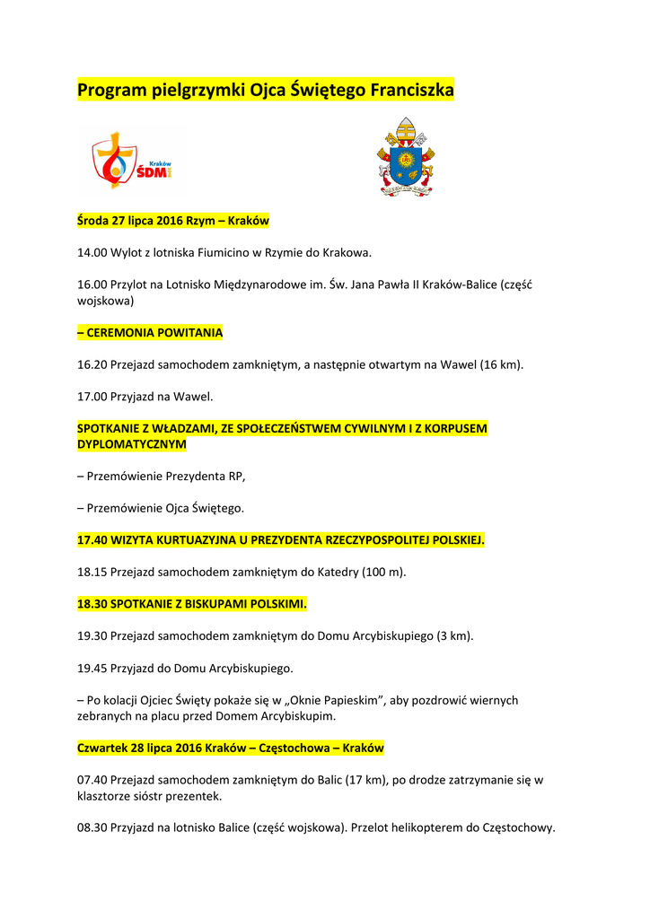 Program pielgrzymki Ojca Świętego Franciszka Środa 27 lipca 2016 Rzym – Kraków 14.00 Wylot z lotniska Fiumicino w Rzymie do Krakowa. 16.00 Przylot na Lotnisko Międzynarodowe im. Św. Jana Pawła II Kraków-Balice Kraków Balice (część wojskowa) – CEREMONIA POWITANIA 16.20 Przejazd samochodem zamkniętym, a następnie otwartym na Wawel (16 km). 17.00 Przyjazd na Wawel. SPOTKANIE Z WŁADZAMI, ZE SPOŁECZEŃSTWEM CYWILNYM I Z KORPUSEM DYPLOMATYCZNYM – Przemówienie Prezydenta RP, – Przemówienie Ojca Świętego. 17.40 WIZYTA KURTUAZYJNA U PREZYDENTA RZECZYPOSPOLITEJ POLSKIEJ. 18.15 Przejazd samochodem zamkniętym do Katedry (100 m). 18.30 SPOTKANIE Z BISKUPAMI POLSKIMI. 19.30 Przejazd samochodem zamkniętym do Domu Arcybiskupiego (3 km). 19.45 Przyjazd do Domu Arcybiskupiego. – Po kolacji Ojciec Święty pokaże się w „Oknie Papieskim”, aby pozdrowić wiernych zebranych na placu przed Domem Arcybiskupim. Czwartek 28 lipca 2016 Kraków – Częstochowa – Kraków 07.40 Przejazd samochodem zamkniętym zamkniętym do Balic (17 km), po drodze zatrzymanie się w klasztorze sióstr prezentek. 08.30 Przyjazd na lotnisko Balice (część wojskowa). Przelot helikopterem do Częstochowy. Częstochowa 09.15 Przylot na lądowisko. – Przejazd samochodem otwartym do Klasztoru na Jasnej Górze, z przejazdem między wiernymi (2 km). 09.45 Przyjazd do Klasztoru – Modlitwa w Kaplicy Cudownego Obrazu. 10.15 Przyjście do zakrystii. 10.30 Msza Święta z okazji 1050. rocznicy Chrztu Polski – homilia Ojca Świętego. 12.15 Powrót do zakrystii. 12.30 Przejazd samochodem zamkniętym na lądowisko (300 m). 12.45 Przyjazd na lądowisko. Przelot helikopterem do Balic. 13.30 Przylot na lotnisko w Balicach (część wojskowa) – Przejazd samochodem zamkniętym do Domu Arcybiskupiego (16 km). 14.00 Przyjazd do Domu Arcybiskupiego. Obiad prywatny. 17.00 Przekazanie kluczy do miasta i przejazd tramwajem na Błonia (800 m). 17.15 Przyjazd na Błonia. Przejazd między wiernymi. 17.30 CEREMONIA POWITANIA – Przemówienie Ojca Świętego. 19.00 Przejazd samochodem zamkniętym do Domu Arcybiskupiego (2 km). 19.15 Przyjazd do Domu Arcybiskupiego. – Po kolacji Ojciec Święty pokaże się w „Oknie Papieskim”, aby pozdrowić wiernych zebranych na placu przed Domem Arcybiskupim. Piątek 29 lipca 2016 Kraków – Oświęcim – Kraków 07.00 Msza Święta prywatna. 08.15 Przejazd samochodem zamkniętym do Balic (16 km). 08.45 Przyjazd na lotnisko. Przelot helikopterem do Oświęcimia. 09.20 Przylot do Oświęcimia. Przejazd samochodem zamkniętym do Muzeum Auschwitz (700 m). 09.30 WIZYTA W OBOZIE AUSCHWITZ – ściana śmierci – cela męczeństwa św. Maksymiliana Kolbego. 10.15 Przejazd samochodem zamkniętym do Birkenau (3 km). 10.30 WIZYTA W OBOZIE BIRKENAU – Przemówienie Ojca Świętego. 11.15 Przejazd samochodem zamkniętym na lądowisko (4 km). 11.30 Przyjazd na lądowisko. Przelot helikopterem do Balic. 12.00 Przylot na lotnisko (część wojskowa) – Przejazd samochodem zamkniętym do Domu Arcybiskupiego (16 km). 12.30 Przyjazd do Domu Arcybiskupiego. Obiad prywatny. 16.15 Przejazd samochodem do Uniwersyteckiego Szpitala Dziecięcego w Prokocimiu (9 km). 16.30 Przyjazd do Prokocimia. – Wizyta w Uniwersyteckim Szpitalu Dziecięcym. 17.30 Przejazd samochodem zamkniętym na Błonia (10 km). 17.45 Przyjazd na Błonia. 18.00 DROGA KRZYŻOWA Z MŁODZIEŻĄ – Na zakończenie Ojciec Święty wygłasza krótkie przemówienie. 19.30 Przejazd samochodem zamkniętym do Domu Arcybiskupiego (2 km). 19.45 Przyjazd do Domu Arcybiskupiego. Sobota 30 lipca 2016 Kraków 08.00 Przejazd samochodem otwartym do Łagiewnik (6 km). 08.30 WIZYTA W SANKTUARIUM MIŁOSIERDZIA BOŻEGO – Kaplica Świętej Faustyny Kowalskiej. 08.45 Przejazd samochodem otwartym do Sanktuarium (200 m). 09.00 Przejście przez Bramę Miłosierdzia. 09.15 Liturgia pojednania z udziałem młodzieży. 10.00 Przejazd samochodem do Sanktuarium Św. Jana Pawła II (1 km). 10.15 Przybycie do zakrystii. 10.30 Msza Święta z Kapłanami, Zakonnicami, Zakonnikami, Osobami Konsekrowanymi i Seminarzystami z Polski – homilia Ojca Świętego. 12.15 Powrót do zakrystii. 12.30 Przejazd samochodem zamkniętym do Domu Arcybiskupiego (6 km). 12.45 Przyjazd do Domu Arcybiskupiego. OBIAD Z MŁODZIEŻĄ. 18.30 Przejazd samochodem zamkniętym, a następnie otwartym na Kampus Miłosierdzia (12 km). 19.00 Przyjazd na Kampus Miłosierdzia. 19.30 CZUWANIE MODLITEWNE Z MŁODZIEŻĄ – Świadectwa i pytania pięciu przedstawicieli młodzieży do Ojca Świętego – Odpowiedzi i przemówienie Ojca Świętego. 21.00 Przejazd samochodem zamkniętym do Domu Arcybiskupiego (12 km). 21.30 Przyjazd do Domu Arcybiskupiego. Niedziela 31 lipca 2016 Kraków – Rzym 08.15 Przejazd samochodem na Kampus Miłosierdzia (12 km). 08.45 Przyjazd na Kampus Miłosierdzia – Błogosławieństwo dwóch budynków Caritas – Przejazd wśród wiernych. 09.40 Przybycie do zakrystii. 10.00 MSZA ŚWIĘTA ŚWIATOWEGO DNIA MŁODZIEŻY – homilia Ojca Świętego – Anioł Pański. 12.30 Powrót do zakrystii. 12.45 Przejazd samochodem zamkniętym do Domu Arcybiskupiego (12 km). 13.15 Przyjazd do Domu Arcybiskupiego. Obiad z Orszakiem Papieskim. 16.30 Pożegnanie w rezydencji. 16.30 Przejazd samochodem zamkniętym do Tauron Arena (10 km). 17.00 PRZYJAZD DO TAURON ARENA – SPOTKANIE Z WOLONTARIUSZAMI ŚDM ORAZ KOMITETEM ORGANIZACYJNYM I DOBROCZYŃCAMI. 17.45 Przejazd samochodem zamkniętym na lotnisko (20 km). 18.15 Przyjazd do Balic (część wojskowa) CEREMONIA POŻEGNANIA 18.30 Wylot samolotem do Rzymu (Ciampino). 20.25 Przylot na lotnisko Rzym (Ciampino) – Przejazd do Watykanu (28 km). za: Katolicka Agencja Informacyjna