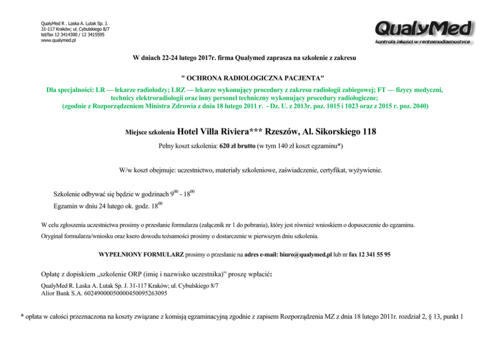 QualyMed R . Laska A. Lutak Sp. J. 31-117 Kraków; ul. Cybulskiego 8/7 tel/fax 12 3414300 / 12 3415595 www.qualymed.pl W dniach 22-24 lutego 2017r. firma Qualymed zaprasza na szkolenie z zakresu " OCHRONA RADIOLOGICZNA PACJENTA" Dla specjalności: LR — lekarze radiolodzy; LRZ — lekarze wykonujący procedury z zakresu radiologii zabiegowej; FT — fizycy medyczni, technicy elektroradiologii oraz inny personel techniczny wykonujący procedury radiologiczne; (zgodnie z Rozporządzeniem Ministra Zdrowia z dnia 18 lutego 2011 r. - Dz. U. z 2013r. poz. 1015 i 1023 oraz z 2015 r. poz. 2040) Miejsce szkolenia Hotel Villa Riviera*** Rzeszów, Al. Sikorskiego 118 Pełny koszt szkolenia: 620 zł brutto (w tym 140 zł koszt egzaminu*) W/w koszt obejmuje: uczestnictwo, materiały szkoleniowe, zaświadczenie, certyfikat, wyżywienie. Szkolenie odbywać się będzie w godzinach 900 - 1800 Egzamin w dniu 24 lutego ok. godz. 1800 W celu zgłoszenia uczestnictwa prosimy o przesłanie formularza (załącznik nr 1 do pobrania), który jest również wnioskiem o dopuszczenie do egzaminu. Oryginał formularza/wniosku oraz ksero dowodu tożsamości prosimy o dostarczenie w pierwszym dniu szkolenia. WYPEŁNIONY FORMULARZ prosimy o przesłanie na adres e-mail: [email protected] lub nr fax 12 341 55 95 Opłatę z dopiskiem „szkolenie ORP (imię i nazwisko uczestnika)” proszę wpłacić: QualyMed R. Laska A. Lutak Sp. J. 31-117 Kraków; ul. Cybulskiego 8/7 Alior Bank S.A. 60249000050000450095263095 * opłata w całości przeznaczona na koszty związane z komisją egzaminacyjną zgodnie z zapisem Rozporządzenia MZ z dnia 18 lutego 2011r. rozdział 2, § 13, punkt 1