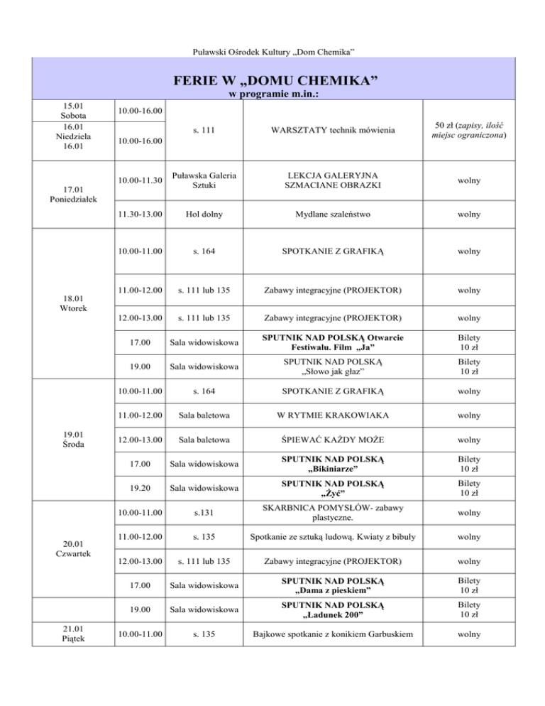 Puławski Ośrodek Kultury „Dom Chemika” FERIE W „DOMU CHEMIKA” w programie m.in.: 15.01 Sobota 16.01 Niedziela 16.01 10.00-16.00 s. 111 WARSZTATY technik mówienia 50 zł (zapisy, ilość miejsc ograniczona) 10.00-11.30 Puławska Galeria Sztuki LEKCJA GALERYJNA SZMACIANE OBRAZKI wolny 11.30-13.00 Hol dolny Mydlane szaleństwo wolny 10.00-11.00 s. 164 SPOTKANIE Z GRAFIKĄ wolny 11.00-12.00 s. 111 lub 135 Zabawy integracyjne (PROJEKTOR) wolny 12.00-13.00 s. 111 lub 135 Zabawy integracyjne (PROJEKTOR) wolny 17.00 Sala widowiskowa SPUTNIK NAD POLSKĄ Otwarcie Festiwalu. Film „Ja” Bilety 10 zł 19.00 Sala widowiskowa SPUTNIK NAD POLSKĄ „Słowo jak głaz” Bilety 10 zł 10.00-11.00 s. 164 SPOTKANIE Z GRAFIKĄ wolny 11.00-12.00 Sala baletowa W RYTMIE KRAKOWIAKA wolny 12.00-13.00 Sala baletowa ŚPIEWAĆ KAśDY MOśE wolny 17.00 Sala widowiskowa SPUTNIK NAD POLSKĄ „Bikiniarze” Bilety 10 zł 19.20 Sala widowiskowa SPUTNIK NAD POLSKĄ „śyć” Bilety 10 zł 10.00-11.00 s.131 SKARBNICA POMYSŁÓW- zabawy plastyczne. wolny 11.00-12.00 s. 135 Spotkanie ze sztuką ludową. Kwiaty z bibuły wolny 12.00-13.00 s. 111 lub 135 Zabawy integracyjne (PROJEKTOR) wolny 17.00 Sala widowiskowa SPUTNIK NAD POLSKĄ „Dama z pieskiem” Bilety 10 zł 19.00 Sala widowiskowa SPUTNIK NAD POLSKĄ „Ładunek 200” Bilety 10 zł 10.00-11.00 s. 135 Bajkowe spotkanie z konikiem Garbuskiem wolny 10.00-16.00 17.01 Poniedziałek 18.01 Wtorek 19.01 Środa 20.01 Czwartek 21.01 Piątek 22.01 Sobota 23.01 Niedziela 11.00-12.00 s. 131 Konkurs plastyczny dla dzieci wolny 12.00-13.00 s. 111 lub 135 Zabawy integracyjne (PROJEKTOR) wolny 15.30 Sala widowiskowa SPUTNIK NAD POLSKĄ „Czuburaszek”” Bilety 5 zł 17.00 Sala widowiskowa SPUTNIK NAD POLSKĄ „Dwanaście miesięcy” Bilety 5 zł 19.00 Sala widowiskowa SPUTNIK NAD POLSKĄ „Wyspa” Bilety 10 zł 11.00 Sala widowiskowa SPUTNIK NAD POLSKĄ „Wilk i zając” 11.00-13.00 s. 164 Warsztaty decoupage 18.00 Sala widowiskowa Koncert zespołu SECATOR Bilety 5 zł Zapisy (ilość miejsc ograniczona) Bilety 6 zł 16.00 Sala widowiskowa SPUTNIK NAD POLSKĄ „Królowa Śniegu” Bilety 5 zł 18.00 Sala widowiskowa SPUTNIK NAD POLSKĄ „PodróŜe ze zwierzętami” Bilety 10 zł WARSZTATY TEATRALNE „Zwierciadło duszy, archetypy i symbole” 50 zł (zapisy, ilość miejsc ograniczona) 10.00-13.00 Sala widowiskowa 24.01 Poniedziałek 10.00-11.30 s. 111 lub 135 Zabawy integracyjne (PROJEKTOR) wolny 11.00-13.00 s.164 Warsztaty makramy Zapisy (ilość miejsc ograniczona) 11.30-13.00 s. 37 Projekcja filmu niespodzianki wolny 17.30 Sala widowiskowa Sala widowiskowa Magiczny teatr baśni. – recital iluzjonistyczny w wykonaniu Mistrza Łukasza Podymskiego WARSZTATY TEATRALNE „Zwierciadło duszy, archetypy i symbole” 10.00-11.30 s. 111 lub 135 Zabawy integracyjne (PROJEKTOR) 11.00-13.00 s. 164 Warsztaty makramy Zapisy (ilość miejsc ograniczona) 11.30-13.00 s. 37 Projekcja filmu niespodzianki wolny 18.00 Sala widowiskowa Grupa MoCarta WARSZTATY TEATRALNE „Zwierciadło duszy, archetypy i symbole” Bilety 40 zł 50 zł (zapisy, ilość miejsc ograniczona) 10.00-13.00 25.01 Wtorek 26.01 Środa 10.00-13.00 Sala widowiskowa Bilety 5 zł 50 zł (zapisy, ilość miejsc ograniczona) wolny 10.00-11.00 s. 131 Plastyczne łamigłówki wolny 11.00-13.00 s. 164 Warsztaty makramy Zapisy (ilość miejsc ograniczona) 11.00-12.00 Sala baletowa W RYTMIE KRAKOWIAKA- zajęcia taneczne wolny 12.00-13.00 Sala baletowa 10.00-13.00 Sala widowiskowa 27.01 Czwartek 50 zł (zapisy, ilość miejsc ograniczona) 11.00-12.00 s. 135 Spotkanie ze sztuką ludową - wycinanka wolny 12.00-13.00 s. 111 lub 135 Zabawy integracyjne (PROJEKTOR) wolny 18.00 Sala widowiskowa 11.30-13.00 17.00-19.00 s. 131 s. 111 lub 135 s. 111 wolny Koncert zespołu wokalnego Michała Matrasa WARSZTATY TEATRALNE „Zwierciadło duszy, archetypy i symbole” 50 zł (zapisy, ilość miejsc ograniczona) Plastyczne łamigłówki wolny Zabawy integracyjne (PROJEKTOR) Bal karnawałowy dla dzieci wolny wolny Zapisy (ilość miejsc ograniczona) Sala widowiskowa Koncert młodzieŜowych zespołów muzycznych: „Servants of silence”, „Herd Rushing Radiators” Bilety 7 zł 11.00-13.00 s. 164 Warsztaty decoupage Zapisy (ilość miejsc ograniczona) 16.00 Sala widowiskowa Ogólnopolskie zawody Taneczne Break dance wolny 18.00 Sala widowiskowa Koncert „Ogień i woda” Maciej Balcar z zespołem Bilety 30 zł 18.00 30.01 Niedziela WARSZTATY TEATRALNE „Zwierciadło duszy, archetypy i symbole” SKARBNICA POMYSŁÓW – zabawy plastyczne. s. 131 10.00-11.30 29.01 Sobota wolny 10.00-11.00 10.00-13.00 Sala widowiskowa 28.01 Piątek ŚPIEWAĆ KAśDY MOśE