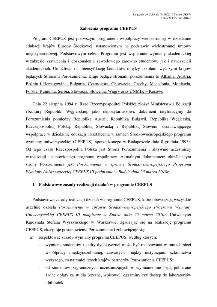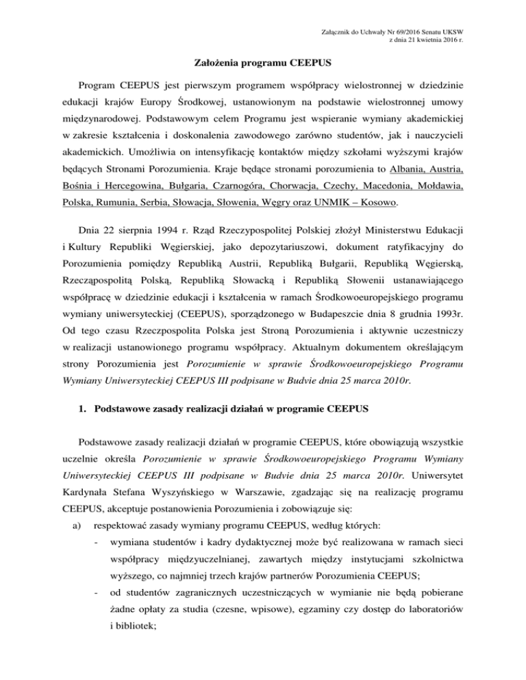 Załącznik do Uchwały Nr 69/2016 Senatu UKSW z dnia 21 kwietnia 2016 r. Założenia programu CEEPUS Program CEEPUS jest pierwszym programem współpracy wielostronnej w dziedzinie edukacji krajów Europy Środkowej, ustanowionym na podstawie wielostronnej umowy międzynarodowej. Podstawowym celem Programu jest wspieranie wymiany akademickiej w zakresie kształcenia i doskonalenia zawodowego zarówno studentów, jak i nauczycieli akademickich. Umożliwia on intensyfikację kontaktów między szkołami wyższymi krajów będących Stronami Porozumienia. Kraje będące stronami porozumienia to Albania, Austria, Bośnia i Hercegowina, Bułgaria, Czarnogóra, Chorwacja, Czechy, Macedonia, Mołdawia, Polska, Rumunia, Serbia, Słowacja, Słowenia, Węgry oraz UNMIK – Kosowo. Dnia 22 sierpnia 1994 r. Rząd Rzeczypospolitej Polskiej złożył Ministerstwu Edukacji i Kultury Republiki Węgierskiej, jako depozytariuszowi, dokument ratyfikacyjny do Porozumienia pomiędzy Republiką Austrii, Republiką Bułgarii, Republiką Węgierską, Rzecząpospolitą Polską, Republiką Słowacką i Republiką Słowenii ustanawiającego współpracę w dziedzinie edukacji i kształcenia w ramach Środkowoeuropejskiego programu wymiany uniwersyteckiej (CEEPUS), sporządzonego w Budapeszcie dnia 8 grudnia 1993r. Od tego czasu Rzeczpospolita Polska jest Stroną Porozumienia i aktywnie uczestniczy w realizacji ustanowionego programu współpracy. Aktualnym dokumentem określającym strony Porozumienia jest Porozumienie w sprawie Środkowoeuropejskiego Programu Wymiany Uniwersyteckiej CEEPUS III podpisane w Budvie dnia 25 marca 2010r. 1. Podstawowe zasady realizacji działań w programie CEEPUS Podstawowe zasady realizacji działań w programie CEEPUS, które obowiązują wszystkie uczelnie określa Porozumienie w sprawie Środkowoeuropejskiego Programu Wymiany Uniwersyteckiej CEEPUS III podpisane w Budvie dnia 25 marca 2010r. Uniwersytet Kardynała Stefana Wyszyńskiego w Warszawie, zgadzając się na realizację programu CEEPUS, akceptuje postanowienia Porozumienia i zobowiązuje się: a) respektować zasady wymiany programu CEEPUS, według których: - wymiana studentów i kadry dydaktycznej może być realizowana w ramach sieci współpracy międzyuczelnianej, zawartych między instytucjami szkolnictwa wyższego, co najmniej trzech krajów partnerów Porozumienia CEEPUS; - od studentów zagranicznych uczestniczących w wymianie nie będą pobierane żadne opłaty za studia (czesne, wpisowe), egzaminy czy dostęp do laboratoriów i bibliotek; - studenci uczestniczący w wymianie otrzymają od macierzystej uczelni pełne zaliczenie ustalonych w Porozumieniu o programie zajęć (Learning Agreement) programów studiów, które zaliczą w uczelniach zagranicznych. - wypłaty stypendium za okres pobytu Uczestnika przyjeżdzającego na UKSW w ramach wymiany oraz zwrotu kosztów podróży Uczestnikowi wyjeżdzającemu w ramach programu z UKSW b) zapewnić pomoc w realizacji projektów wielostronnych - sieci programu CEEPUS, w szczególności udzielając niezbędnego wsparcia instytucjonalnego pracownikom uczelni zaangażowanym w realizację zatwierdzonych projektów; c) informować studentów i nauczycieli akademickich o warunkach i wymogach obowiązujących przy ubieganiu się o udział w wymianie studentów i nauczycieli akademickich w programie CEEPUS; Uniwersytet Kardynała Stefana Wyszyńskiego w Warszawie zapewnia, że dołoży wszelkich starań, aby zapewnić wysoką jakość organizacji wymiany studentów i nauczycieli akademickich, w szczególności poprzez: a) właściwe przygotowanie i podpisywanie ze studentami Porozumień o programie zajęć oraz przestrzeganie ich postanowień; b) niezwłoczne wydawanie Letter of Confirmation oraz Wykazów zaliczeń (Transcripts of Records) wszystkim zagranicznym studentom po zrealizowaniu przez nich ustalonego programu zajęć; c) stosowanie systemu ECTS, który zapewnia przejrzystość w zaliczaniu okresów studiów; d) udzielanie rzetelnych informacji wyjeżdżającym i przyjeżdżającym studentom oraz nauczycielom akademickim; e) włączanie przyjeżdżających studentów do regularnych zajęć oferowanych przez uczelnię; f) zapewnienie włączania wykładów i zajęć prowadzonych przez przyjeżdżających nauczycieli akademickich do regularnych programów studiów; g) zapewnienie przyjeżdżającym studentom pomocy w znalezieniu zakwaterowania; h) ułatwianie i wspieranie wymiany nauczycieli akademickich; i) podniesienie rangi pracy dydaktycznej prowadzonej przez nauczycieli akademickich za granicą. 2 Uczestnicząc w programie CEEPUS, Uniwersytet Kardynała Stefana Wyszyńskiego w Warszawie zobowiązuje się przestrzegać generalnych zasad, związanych z: a) równouprawnieniem kobiet i mężczyzn; b) integrowaniem niepełnosprawnych studentów i nauczycieli akademickich; c) wzmacnianiem społecznej i gospodarczej spójności oraz zwalczaniem zjawisk ksenofobii i rasizmu. 2. Działania w ramach programu CEEPUS Do podstawowych działań w ramach programu CEEPUS należy: tworzenie sieci współpracy międzyuczelnianej przy udziale partnerów z co najmniej trzech krajów, staże krótkoterminowe, studia semestralne i praktyki, seminaria doskonalące, kursy językowe, kursy specjalistyczne, wyjazdy Free Mover w ramach programu CEEPUS. W ramach powyższych działań Uczelnia może realizować dwa rodzaje mobilności: a) Mobilność studentów: o wyjazdy/przyjazdy studentów na studia – na okres od 3 do 10 miesięcy, o wyjazdy/przyjazdy studentów na praktyki, o wyjazdy/przyjazdy studentów na staże i szkoły letnie – na okres od 21 dni do 10 miesięcy. b) Mobilność pracowników uczelni: o wyjazdy nauczycieli akademickich w celu prowadzenia zajęć dydaktycznych na uczelniach w krajach programu. 3. Podstawowe wymagania stawiane uczelni realizującej działania programu CEEPUS Uczelnia realizująca działania programu CEEPUS zapewnia: - wyznaczenie Uczelnianego Ko