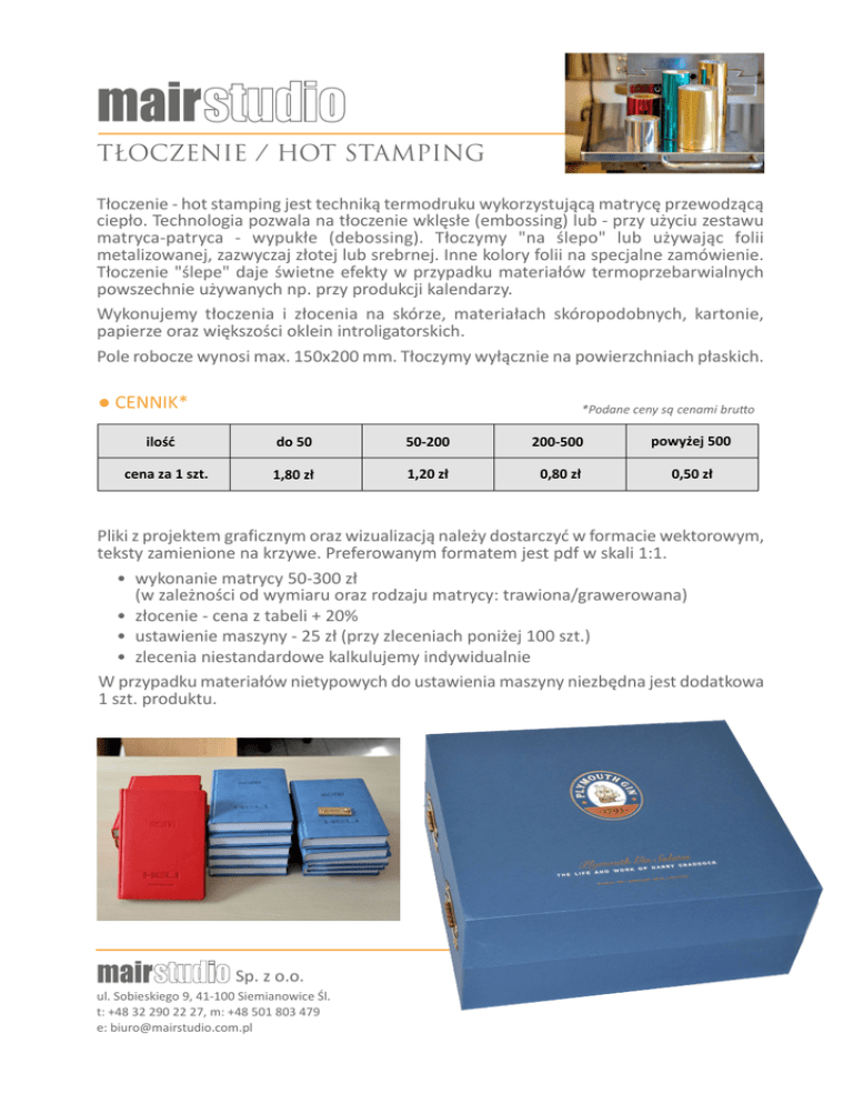T£OCZENIE / HOT STAMPING T³oczenie hot stamping jest technik¹ termodruku wykorzystuj¹c¹ matrycê przewodz¹c¹ ciep³o. Technologia pozwala na t³oczenie wklês³e (embossing) lub przy u¿yciu zestawu matrycapatryca wypuk³e (debossing). T³oczymy "na lepo" lub u¿ywaj¹c folii metalizowanej, zazwyczaj z³otej lub srebrnej. Inne kolory folii na specjalne zamówienie. T³oczenie "lepe" daje wietne efekty w przypadku materia³ów termoprzebarwialnych powszechnie u¿ywanych np. przy produkcji kalendarzy. Wykonujemy t³oczenia i z³ocenia na skórze, materia³ach skóropodobnych, kartonie, papierze oraz wiêkszoci oklein introligatorskich. Pole robocze wynosi max. 150x200 mm. T³oczymy wy³¹cznie na powierzchniach p³askich. ● CENNIK* iloæ cena za 1 szt. *Podane ceny s¹ cenami bru�o do 50 50200 200500 powy¿ej 500 1,80 z³ 1,20 z³ 0,80 z³ 0,50 z³ Pliki z projektem graficznym oraz wizualizacj¹ nale¿y dostarczyæ w formacie wektorowym, teksty zamienione na krzywe. Preferowanym formatem jest pdf w skali 1:1. wykonanie matrycy 50300 z³ (w zale¿noci od wymiaru oraz rodzaju matrycy: trawiona/grawerowana) z³ocenie cena z tabeli + 20% ustawienie maszyny 25 z³ (przy zleceniach poni¿ej 100 szt.) zlecenia niestandardowe kalkulujemy indywidualnie W przypadku materia³ów nietypowych do ustawienia maszyny niezbêdna jest dodatkowa 1 szt. produktu. Sp. z o.o. ul. Sobieskiego 9, 41‐100 Siemianowice Śl. t: +48 32 290 22 27, m: +48 501 803 479 e: [email protected]