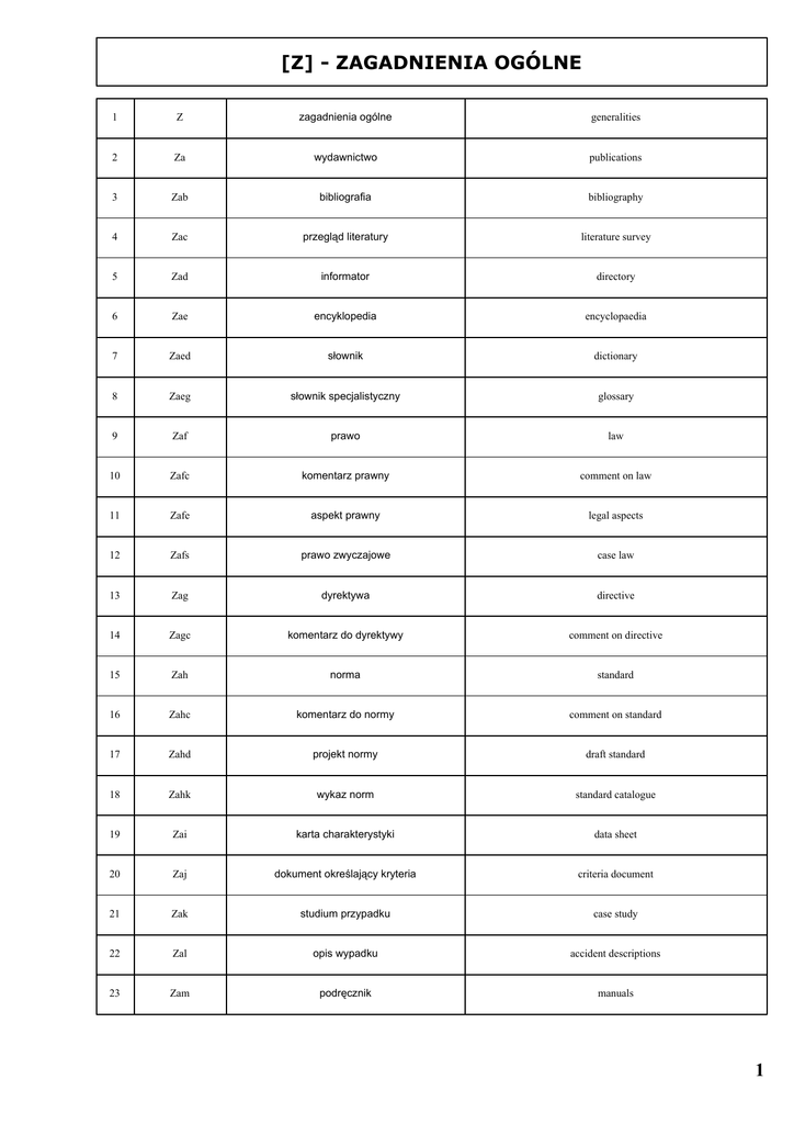 [Z] - ZAGADNIENIA OGÓLNE 1 Z zagadnienia ogólne generalities 2 Za wydawnictwo publications 3 Zab bibliografia bibliography 4 Zac przegląd literatury literature survey 5 Zad informator directory 6 Zae encyklopedia encyclopaedia 7 Zaed słownik dictionary 8 Zaeg słownik specjalistyczny glossary 9 Zaf prawo law 10 Zafc komentarz prawny comment on law 11 Zafe aspekt prawny legal aspects 12 Zafs prawo zwyczajowe case law 13 Zag dyrektywa directive 14 Zagc komentarz do dyrektywy comment on directive 15 Zah norma standard 16 Zahc komentarz do normy comment on standard 17 Zahd projekt normy draft standard 18 Zahk wykaz norm standard catalogue 19 Zai karta charakterystyki data sheet 20 Zaj dokument określający kryteria criteria document 21 Zak studium przypadku case study 22 Zal opis wypadku accident descriptions 23 Zam podręcznik manuals 1 24 Zami instrukcja użytkowania instructions for use 25 Zamt poradnik szkoleniowy training manuals 26 Zan czasopismo periodicals 27 Zao katalog catalogue 28 Zap patent patent 29 Zaq nazwa handlowa trade names 30 Zar raport report 31 Zara sprawozdanie z działalności report of activities 32 Zarh system alarmowy sygnalizujący zagrożenie hazard alert system 33 Zas dane statystyczne statistics 34 Zast trendy statystyczne statistical trends 35 Zat dysertacja thesis 36 Zau streszczenie compendium 37 Zav wykaz list 38 Zavd wykaz substancji chemicznych list of chemical substances 39 Zavo wykaz zawodów list of occupations 40 Zavr wykaz substancji radioaktywnych list of radioactive substances 41 Zaw umowy międzynarodowe international agreements 42 Zax taśma magnetowidowa videotape 43 Zay wymieniony dokument replaced 44 Zayd duplikat duplicate 45 Zaz tłumaczenie translation 46 Ze klasyfikacja classification 47 Zec system klasyfikacji classification systems 48 Zecu UKD UDC 2 49 Zi konferencja conference 50 Zo kontakty zawodowe industrial relations 51 Zob złe traktowanie bullying 52 Zod dyskryminacja discriminatory practices 53 Zol zwolnienie z pracy dismissal 54 Zoq warunki zatrudnienia terms of employment 55 Zor prawa pracownika employee rights 56 Zos molestowanie seksualne sexual harassment 57 Zu postęp techniczny technical development 58 Zuc opis procesu technicznego description of technique 59 Zud opis sprzętu description of equipment 60 Zue zastosowanie komputerów computer applications 61 Zueb baza danych computerized data bases 62 Zuec CD-ROM CD-ROM 63 Zuei dokument internetowy internet document 64 Zuem zastosowanie mikrokomputerów microcomputer applications 65 Zuep program komputerowy computer programme 66 Zuev DVD DVD 67 Zuf trendy future trends 68 Zui wzrost produkcji increase in productivity 69 Zum proces produkcyjny manufacturing processes 70 Zumn nanotechnologia nanotechnology 71 Zun nowe technologie new technologies 72 Zuo zasoby occurrence 73 Zus wykorzystanie uses 3 74 Zusa bezpieczny produkt product safety 75 Zy różne miscellaneous 76 Zyc kraje uprzemysłowione industrialized countries 77 Zyd kraje rozwijające się developing countries 78 Zydt współpraca techniczna technical cooperation 79 Zye gospodarki w stadium przejściowym transition economies 80 Zyh historia history 81 Zyo organizacja organization 82 Zyr ogólny przegląd round-up 83 Zyt transfer technologii transfer of technology 4