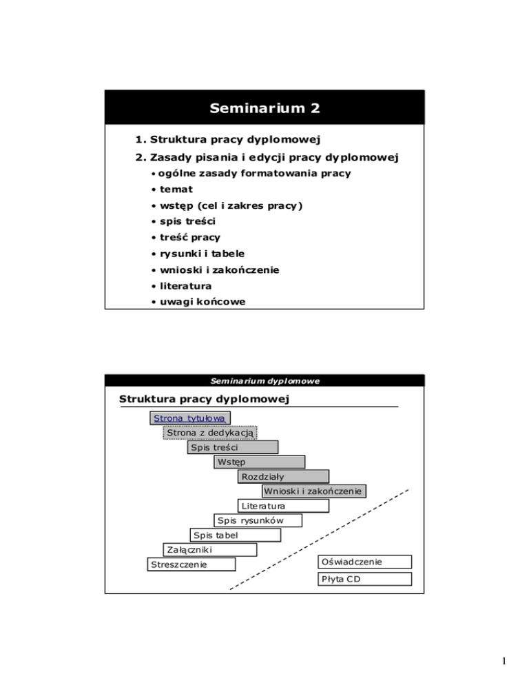 Seminarium 2 1. Struktura pracy dyplomowej 2. Zasady pisania i edycji pracy dyplomowej • ogólne zasady formatowania pracy • temat • wstęp (cel i zakres pracy) • spis treści • treść pracy • rysunki i tabele • wnioski i zakończenie • literatura • uwagi końcowe Semina rium dypl omowe Struktura pracy dyplomowej Strona tytułowa Strona z dedykacją Spis treści Wstęp Rozdziały Wniosk i i zakończenie Lite ratura Spis rysunków Spis tabel Załącznik i Streszczenie Oświadczenie Płyta C D 1 Semina rium dypl omowe Zasady pisania i edycji pracy dyplomowej Ogólne zasady formatowania pracy • praca dyplomowa powinna być wydrukowana dwustronnie w formacie A4 w orie ntacji pionowe j, • należy zastosować następujące ustawienia marginesów: - margine sy lustrzane - sze rokość wszystk ich marginesów: 2,5 cm - naddatek 0,5 cm na oprawę . • strony powinny być numerowane nume racją ciągłą i być um ieszczone w dolnym zewnętrznym rogu strony (stronę pie rwszą stanowi strona tytułowa, ale nume ry na stronach powinny pojawić się dopie ro na stronie gdzie znajduje się wstę p). Tek st tek st t ek st tek st tek st tek st tek st tek st tek st tek st tek st tek st tek st tek st tek st tek st tek st tek st tek st tek st tek st 5 Tek st tek st t ek st tek st tek st tek st tek st tek st tek st tek st tek st tek st tek st tek st tek st tek st tek st tek st tek st tek st tek st 6 Semina rium dypl omowe Temat pracy • powinien znaleźć się na stronie tytułowe j, • powinien dotyczyć zagadnień związanych z nauczaniem te chniki (ogólnie te chniki lub poszczególnych modułów nauczania np. obróbka metalu i dre wna, mode larstwo, żywienie , projek towanie wychowanie komunikacyjne, itp.), • powinien być sform ułowany w postaci pojedynczego zdania oznajm ującego, • powinien mie ć charak te r problemowy czyli zawie rać tak ie słowa kluczowe , jak: wpływ, analiza, rola, itp. Przykłady - P roblemy wykorzystania technologii informacyjnej w nauc zaniu tec hniki - Rola I nternetu w proces ie samokształcenia nauc zycieli techniki - Wpływ edukacyjnej strony internetowej na stopień indywidualizac ji proc esu kształcenia tec hnicznego uc zniów szkoły podstawowej - Rola multimediów s trumieniowyc h we wspomaganiu procesu kształcenia tec hnicznego 2 Semina rium dypl omowe Wstęp (cel i zakres pracy) • powinien zawie rać wprowadzenie do problematyk i pracy, cel oraz zak res pracy, • cel i zak res powinien być sformułowany w czasie te raźnie jszym. Przykład Temat : Rola tec hnologii informacyjnej w procedurze awans u zawodowego nauczyciela techniki Celem pracy jes t analiza roli tec hnologii informacyjnej w procesie awans u zawodowego nauc zyciela techniki. A naliza ta została dokonana w oparciu o badania własne uwzględniające nauczycieli s zkół podstawowyc h. Zakres pracy obejmuje trzy rozdziały. W rozdziale pierws zym przeds tawione s ą/przedstawiono założenia teoretyczne rozwoju i awansu zawodowego nauczyciela techniki. W rozdziale drugim.... Rozdział trzeci........ ..... Praca zawiera również wnioski i zakończenie. Semina rium dypl omowe Spis treści • spis treści powinno się wyge ne rować automatycznie z podaniem tytułów rozdziałów, podrozdziałów i nume rów stron. Wstęp......................................................................... 1.Tytuł 1-go rozdziału................................................. 1.1. Tytuł 1-go podrozdziału rozdziału 1-go...................... 1.2. Tytuł 2-go podrozdziału rozdziału 1-go...................... 2. Tytuł 2-go rozdziału................................................ 2.1. Tytuł 1- go podrozdziału rozdziału 2-go..................... 3. ............................................................................... Wnioski i zakończenie................................................. Literatura.................................................................... Spis rysunków............................................................. Spis tabel.................................................................... Załączniki.................................................................... Streszczenie................................................................ 3 Semina rium dypl omowe Treść pracy • tek st pracy powinie n być napisany jednolitą czcionką Times Ne w Roman, typ normalny o wysokości 12 pk t z odstę pem między wie rszami wynoszącym 1,5 pk t, • wcię cie akapitowe powinno wynosić 1,25 cm, • tek st pracy powinie n być wyjustowany (obustronnie wyrównany), • tytuły rozdziałów powinny być napisane czcionką TNR, bold 16 pk t a podtytuły bold 14 pk t, dalsze podrozdziały bold 12 pkt, • tytuły rozdziałów i podrozdziałów nie powinny kończyć się k ropką, • każdy rozdział powinien zaczynać się od nowe j strony. tekst tekst tekst tekst tekst tekst tekst tekst tekst tekst tekst tekst tekst tekst. a 1.2. Podtytuł podtytuł podtytuł podtytuł podtytuł podtytuł a>b b Tekst tekst tekst tekst tekst tekst tekst Semina rium dypl omowe 4 Semina rium dypl omowe Rysunki i tabele • nume racja rysunków i tabe l może być ciągła (rys.1, rys. 2, itd. ) lub przebiegać osobno w każdym rozdziale (rys.1.1, rys 1.2 dla rozdziału 1-go, rys. 2.1, rys 2.2, itd. dla rozdziału 2-go), • tytuł rysunku umieszcza się pod rysunkiem, • tytuł tabeli umieszcza się nad tabelą ! • tytuły rysunków i tabe l powinny być pisane czcionką o 1 –2 pk t mnie jszą niż treść pracy i nie powinny kończyć się k ropką, • należy zachowywać pe wien odstę p m iedzy rysunk iem, podpisem rysunku, a tekstem rozdziału, • niedopuszczalne jest um ieszcze nie rysunku na końcu strony, a podpisu na początki następne j, • w tekście należy wstawiać odwołania do rysunków i tabe l (np. na rysunku 3.2. przedstawiono....), • tabele powinny w całe j pracy mie ć podobny wygląd (np. pogrubienie tytułów kolumn, 