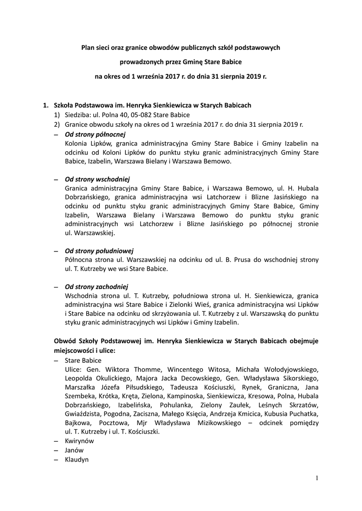 Plan sieci oraz granice obwodów publicznych szkół podstawowych prowadzonych przez Gminę Stare Babice na okres od 1 września 2017 r. do dnia 31 sierpnia 2019 r. 1. Szkoła Podstawowa im. Henryka Sienkiewicza w Starych Babicach 1) Siedziba: ul. Polna 40, 05-082 Stare Babice 2) Granice obwodu szkoły na okres od 1 września 2017 r. do dnia 31 sierpnia 2019 r. Od strony północnej Kolonia Lipków, granica administracyjna Gminy Stare Babice i Gminy Izabelin na odcinku od Koloni Lipków do punktu styku granic administracyjnych Gminy Stare Babice, Izabelin, Warszawa Bielany i Warszawa Bemowo. Od strony wschodniej Granica administracyjna Gminy Stare Babice, i Warszawa Bemowo, ul. H. Hubala Dobrzańskiego, granica administracyjna wsi Latchorzew i Blizne Jasińskiego na odcinku od punktu styku granic administracyjnych Gminy Stare Babice, Gminy Izabelin, Warszawa Bielany i Warszawa Bemowo do punktu styku granic administracyjnych wsi Latchorzew i Blizne Jasińskiego po północnej stronie ul. Warszawskiej. Od strony południowej Północna strona ul. Warszawskiej na odcinku od ul. B. Prusa do wschodniej strony ul. T. Kutrzeby we wsi Stare Babice. Od strony zachodniej Wschodnia strona ul. T. Kutrzeby, południowa strona ul. H. Sienkiewicza, granica administracyjna wsi Stare Babice i Zielonki Wieś, granica administracyjna wsi Lipków i Stare Babice na odcinku od skrzyżowania ul. T. Kutrzeby z ul. Warszawską do punktu styku granic administracyjnych wsi Lipków i Gminy Izabelin. Obwód Szkoły Podstawowej im. Henryka Sienkiewicza w Starych Babicach obejmuje miejscowości i ulice: Stare Babice Ulice: Gen. Wiktora Thomme, Wincentego Witosa, Michała Wołodyjowskiego, Leopolda Okulickiego, Majora Jacka Decowskiego, Gen. Władysława Sikorskiego, Marszałka Józefa Piłsudskiego, Tadeusza Kościuszki, Rynek, Graniczna, Jana Szembeka, Krótka, Kręta, Zielona, Kampinoska, Sienkiewicza, Kresowa, Polna, Hubala Dobrzańskiego, Izabelińska, Pohulanka, Zielony Zaułek, Leśnych Skrzatów, Gwiaździsta, Pogodna, Zaciszna, Małego Księcia, Andrzeja Kmicica, Kubusia Puchatka, Bajkowa, Pocztowa, Mjr Władysława Mizikowskiego – odcinek pomiędzy ul. T. Kutrzeby i ul. T. Kościuszki. Kwirynów Janów Klaudyn 1 Latchorzew Ulice: Aleksandra Janowskiego, Wojciecha Jastrzębowskiego, Romana Kobendzy, Armii Poznań, Oddziału Dzieci Warszawy, Kazimierza Wójcickiego, płk. Zygmunta Padlewskiego, Powstańców Styczniowych, Majora Jacka Decowskiego, Hubala Dobrzańskiego, Armii Krajowej, Janusza Kusocińskiego, Kompanii Jerzyków, Stanisława Zająca, Szarych Szeregów, Olimpijska, Orła Białego, Władysława Reymonta, Na Skraju, Krzysztofa Kamila Baczyńskiego, Grupy Kampinos, Henryka Grabowskiego, Lwowska, Adama Asnyka, Tomasza Zana, Stanisława Lema Babice Nowe Ulice: Kresowa, Leopolda Okulickiego, Hubala Dobrzańskiego, marsz. Józefa Piłsudskiego, Miła Lipków Ulice: Kolonia Lipków, Charłampa, Jastrzębia 2. Szkoła Podstawowa w Koczargach Starych 1) Siedziba: ul. Akacjowa 12, 05-080 Koczargi Stare 2) Granice obwodu szkoły na okres od 1 września 2017 r. do dnia 31 sierpnia 2019 r. Od strony północnej Granica administracyjna Gminy Stare Babice i Gminy Izabelin na odcinku od punktu styku granic wsi Mariew, Gminy Leszno i Gminy Izabelin do punktu styku granic wsi Koczargi Stare, Lipków i Gminy Izabelin. Od strony wschodniej Granica administracyjna wsi Koczargi Stare i Lipków, granica administracyjna wsi Koczargi Stare i Zielonki Wieś, granica administracyjna wsi Koczargi Nowe i Zielonki Wieś na odcinku od punktu styku granic wsi Koczargi Stare, Lipków i Gminy Izabelin do punktu styku granic wsi Koczargi Nowe, Zielonki Wieś i Gminy Ożarów Mazowiecki. Od strony południowej Granica administracyjna wsi Koczargi Nowe i Gminy Ożarów Mazowiecki na odcinku od punktu styku granic administracyjnych wsi Koczargi, Zielonki Wieś i Gminy Ożarów Mazowiecki do punktu styku granic administracyjnych wsi Wojcieszyn, Topolin i Gminy Ożarów Mazowiecki. Od strony zachodniej Granica administracyjna wsi Wojcieszyn i Topolin, granica administracyjna wsi Wojcieszyn i Wierzbin, granica administracyjna wsi Wierzbin i Zalesie, granica administracyjna wsi Zalesie i Borzęcin Duży, granica administracyjna wsi Stanisławów i Borzęcin Duży, granica administracyjna wsi Mariew i Borzęcin Duży, granica administracyjna wsi Mariew i Gminy Leszno na odcinku od punktu styku granic administracyjnych wsi Wojcieszyn, Topolin i Gminy Ożarów Mazowiecki do punktu styku granica administracyjnych wsi Mariew, Gminy Ożarów Mazowiecki i Gminy Leszno. Obwód Szkoły Podstawowej w Koczargach Starych obejmuje miejscowości: Koczargi Stare 2 Koczargi Nowe Wojcieszyn Zalesie Stanisławów Mariew Buda 3. Zespół Szkolno – Przedszkolny w Borzęcinie Dużym 1) Siedziba: Borzęcin Duży ul. Warszawska 697, 05-083 Zaborów 2) Granice obwodu szkoły na okres od 1 września 2017 r. do dnia 31 sierpnia 2019 r. Od strony północnej Granica administracyjna wsi Mariew i Borzęcin Duży, granica administracyjna wsi Stanisławów i Borzęcin Duży na odcinku od punktu styku granic administracyjnych wsi Borzęcin Duży, Mariew i Gminy Leszno do punktu styku granic administracyjnych wsi Stanisławów i Zalesie. Od strony wschodniej Granica administracyjna wsi Zalesie i Borzęcin Duży, granica administracyjna wsi Zalesie i Wierzbin, granica administracyjna wsi Wierzbin i Wojcieszyn, granica administracyjna wsi Topolin i Wojcieszyn na odcinku od punktu styku granic administracyjnych wsi Stanisławów i Zalesie do punktu styku granic administracyjnych wsi Wojcieszyn, Topolin i Gminy Ożarów Mazowiecki. Od strony południowej Granica administracyjna wsi Topolin i Gminy Ożarów Mazowiecki, granica administracyjna wsi Borzęcin Mały i Gminy Ożarów Mazowiecki na odcinku od punktu styku granic administracyjnych wsi Wojcieszyn, Topolin i Gminy Ożarów Mazowiecki do punktu styku granic administracyjnych wsi Borzęcin Mały, Gminy Leszno i Gminy