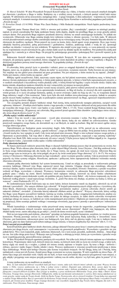 POWRÓT DO RAJU (Uroczystość Wszystkich Świętych) O. Kornelian Dende O. Marcel Sokalski: W dniu Wszystkich Świętych Kościół raduje się z faktu, iż bardzo wielu naszych zmarłych dostąpiło już zbawienia i przebywa u Boga w niebie. Radujemy się z wielkiej rzeszy świętych, o których pamięć wśród ludzi nieraz zaginęła. W odróżnieniu od tej uroczystości, następnego dnia – 2-giego listopada, w dniu zadusznym - wspomina się wszystkich wiernych zmarłych. A tematem naszego zbawienia zajmie się dzisiaj Ojciec Kornelian w archiwalnej pogadance pod tytułem: „Powrót do raju”. O. Kornelian Dende (11/4/1990): Witam Was Zacni Rodacy i Miłe Rodaczki staropolskim: Niech będzie pochwalony Jezus Chrystus! Angielski poeta Thomas Hood (zm. 1845) w utworze pod tytułem „Raj i czarodziejka”, opartym na mitologii perskiej, napisał, że przed czarodziejką Peri będą zamknięte bramy nieba dopóty, dopóki nie przebłaga Boga za swoje grzechy jakimś cennym darem. Peri przyniosła Bogu najpierw pocałunek dziewicy złożony na ustach umierającego kochanka. To jednak nie wystarczyło. Ofiarowała więc Bogu ostatnią kroplę krwi żołnierza wylaną w obronie ojczyzny. I to było mało. W dalszych swoich poszukiwaniach cennego skarbu czarodziejka natknęła się na wzruszającą scenę: Oto przy fontannie klęczało dziecko ze złożonymi do modlitwy rączkami. Wtem pojawił się rycerz na koniu, który chciał ugasić swoje pragnienie. Rysy jego twarzy zdradzały burzliwą przeszłość, pełną przewrotności i grubiaństwa. Jeździec, podnosząc kubek z wodą do ust, spostrzegł modlące się dziecko i wzruszył się tym widokiem. W mgnieniu oka zmiękł wyraz jego twarzy, a z oczu potoczyły się rzęsiste łzy na wspomnienie swych niewinnych lat, gdy u kolan matki uczył się składać rączki do modlitwy. Peri podstawiła czarkę pod spadające łzy i zaniosła ją w ofierze Bogu. On przyjął łzy pokutującego grzesznika i pokutującej Peri i pozwolił wpuścić ją do nieba. Rokrocznie Kościół obchodzi uroczyście święto Wszystkich Świętych. W tym dniu nie wspomina poszczególnych świętych, ale pamięcią ogarnia wszystkich, którzy osiągnęli na ziemi dojrzałość do pełnej i wiecznej wspólnoty z Bogiem. W dzisiejszej pogadance poruszę temat naszego zbawienia. Tę pogadankę tytułuję: „Powrót do raju”. Raj ziemski O człowieku, który przeżył życie w prawdzie i miłości, przez co osiągnął dojrzałość do pełnej i wiecznej wspólnoty z Bogiem, mówi się, że pójdzie do nieba. „Pójście do nieba” to oczywiście, wyrażenie nieścisłe. Niebo bowiem nie jest miejsce. Nie znajduje się ono gdzieś poza chmurami ani poza gwiazdami. Nie jest miejscem, o które można by się zapytać: „Dokąd?”. Niebo jest stanem, o które trzeba się zapytać: „Jak?” Biblijny ogród szczęśliwości, Eden, nazywany często rajem, nie był jakimś rezerwatem, sielankową oazą, w której rosły drzewa i kwiaty piękniejsze niż gdzieindziej, w której ptaki piękniej śpiewały, w której w bród było najrozmaitszych owoców, a w rześkich strumykach o kryształowej wodzie pluskały rybki, w której klimat był łagodny i często świeciło słońce. Gdyby taka kraina istniała, ekspedycje naukowe dotarłyby do niej i oznaczyłyby jej miejsce na naszym globie. Obraz użyty przez natchnionego pisarza wyraża raczej szczęście, jakie pierwsi rodzice przeżywali na skutek przebywania w obecności Boga. Każdą chwilę ich życia opromieniała świadomość, że Bóg ich kocha, że stworzył dla nich wspaniały dom wśród gwiazd, że w życiu ich panuje harmonia, spokój, że nawet zwierzęta i ptaki nie boją się ich. I to, że wzajemnie darzyli Boga miłością i mogli z Nim rozmawiać. Takie życie było dla nich źródłem niewysławionego szczęścia. Jednak to szczęście prysło niczym banka mydlana z chwilą gdy za podszeptem szatana sprzeniewierzyli się Bogu, zgrzeszyli nieposłuszeństwem i pychą, chcąc być na równi z Bogiem. Ten szczególny poranek dziejów ludzkości minął. Nad ziemią, którą zamieszkiwały następne pokolenia, zaciążył wyrok ogłoszony Adamowi: „Przeklęta niech będzie ziemia z tego powodu; w trudzie będziesz zdobywał od niej pożywienie dla siebie po wszystkie dni twego życia. Cierń i oset będzie ci ona rodziła” (Rdz 3, 17-18). Trzeci rozdział Księgi Rodzaju kończy się następującą informacją: „Wygnawszy zaś człowieka, Bóg postawił przed ogrodem Eden cherubów i połyskujące ostrze miecza, aby strzec drogi do drzewa życia” (3, 24). „Wielka nędza i wielkie miłosierdzie” Adam i Ewa nie wyszli z raju potworami – wyszli jako stworzenia rozumne i wolne. Pan Bóg odebrał im radość z przebywania z Nim na co dzień „twarzą w twarz” – to było darem, łaską ale nie odebrał im człowieczeństwa. Gorzko przeżywali następstwa swego buntu, ale dowiedzieli się z ust Bożych, że nadal są kochani. Bóg dał im nawet ogólne zarysy swojego zbawczego planu. Najwybitniejszy po Szekspirze poeta nowożytnej Anglii, John Milton (zm. 1674), porwał się na odtworzenie sceny przekraczania przez Adama i Ewę granicy „ogrodu rozkoszy”, czego już Biblia nam nie podaje. Swój poemat kończy słowami: „Uronili trochę łez, lecz wprędce je otarli. Cały świat stał przed nimi otworem. Mogli w nim wybierać miejsce swego pobytu, a Opatrzność za przewodnika. Tak więc dłoń w dłoni, powolnym krokiem pielgrzymów, rozpoczęli z raju samotną wędrówkę” (Paradise Lost, Book XII). Jakie uczucia nurtowały ich serca i umysły? Chyba jeszcze lepiej niż Milton odgadł je św. Augustyn w V (piątym) wieku: „I pozostała wielka nędza i wielkie miłosierdzie”. Próby zbawienia ludzkości Po buncie pierwszych rodziców przeciwko Bogu w duszach ludzkich pokutuje jeszcze chęć do postawienia na swoim, bez pomocy Boga. Wielu odrzuca plan zbawienia, który w pe