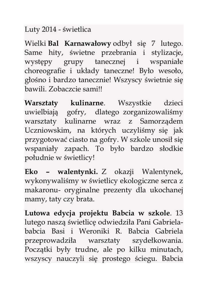 Luty 2014 - świetlica Wielki Bal Karnawałowy odbył się 7 lutego. Same hity, świetne przebrania i stylizacje, występy grupy tanecznej i wspaniałe choreografie i układy taneczne! Było wesoło, głośno i bardzo tanecznie! Wszyscy świetnie się bawili. Zobaczcie sami!! Warsztaty kulinarne. Wszystkie dzieci uwielbiają gofry, dlatego zorganizowaliśmy warsztaty kulinarne wraz z Samorządem Uczniowskim, na których uczyliśmy się jak przygotować ciasto na gofry. W szkole unosił się wspaniały zapach. To było bardzo słodkie południe w świetlicy! Eko – walentynki. Z okazji Walentynek, wykonywaliśmy w świetlicy ekologiczne serca z makaronu- oryginalne prezenty dla ukochanej mamy, taty czy brata. Lutowa edycja projektu Babcia w szkole. 13 lutego naszą świetlicę odwiedziła Pani Gabrielababcia Basi i Weroniki R. Babcia Gabriela przeprowadziła warsztaty szydełkowania. Początki były trudne, ale po kilku minutach, wszyscy nauczyli się prostego ściegu. Babcia Gabriela – to prawdziwa artystka!! Haftuje, szydełkuje i …piecze przepyszne pączki i ciastka!! To było fantastyczne spotkanie! Dziękujemy!! Zimowa olimpiada – w Soczi, a w naszym ogrodzie – jej „szkolna wersja”. Lutowa zimowa olimpiada przyniosła wiele śmiechu i zdrowej rywalizacji. Złotą medalistką została Maja M. z klasy I. Gratulujemy sportowego talentu!!! Lutowe zajęcia plastyczno – artystyczne nawiązywały do lektury pt.: Anaruk, chłopiec z Grenlandii. Po zajęciach czytelniczych powstały ciekawe prace.