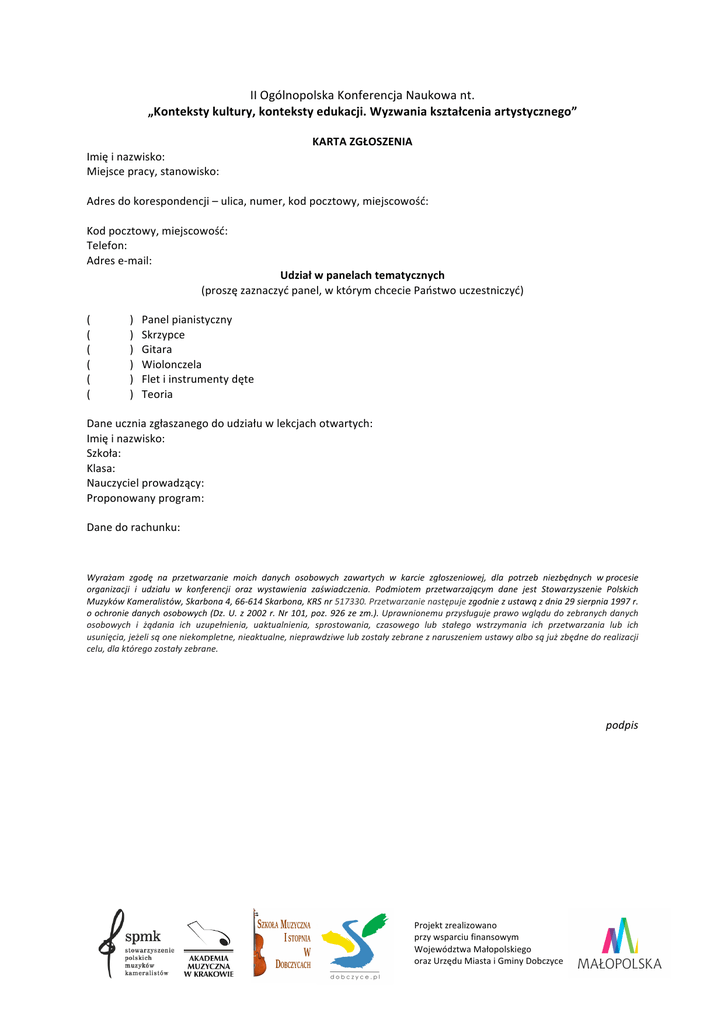 IIOgólnopolskaKonferencjaNaukowant. „Kontekstykultury,kontekstyedukacji.Wyzwaniakształceniaartystycznego” KARTAZGŁOSZENIA Imięinazwisko: Miejscepracy,stanowisko: Adresdokorespondencji–ulica,numer,kodpocztowy,miejscowość: Kodpocztowy,miejscowość: Telefon: Adrese-mail: Udziałwpanelachtematycznych (proszęzaznaczyćpanel,wktórymchceciePaństwouczestniczyć) ( )Panelpianistyczny ( )Skrzypce ( )Gitara ( )Wiolonczela ( )Fletiinstrumentydęte ( )Teoria Daneuczniazgłaszanegodoudziałuwlekcjachotwartych: Imięinazwisko: Szkoła: Klasa: Nauczycielprowadzący: Proponowanyprogram: Danedorachunku: Wyrażam zgodę na przetwarzanie moich danych osobowych zawartych w karcie zgłoszeniowej, dla potrzeb niezbędnych wprocesie organizacji i udziału w konferencji oraz wystawienia zaświadczenia. Podmiotem przetwarzającym dane jest Stowarzyszenie Polskich MuzykówKameralistów,Skarbona4,66-614Skarbona,KRSnr517330.Przetwarzanienastępujezgodniezustawązdnia29sierpnia1997r. oochroniedanychosobowych(Dz.U.z2002r.Nr101,poz.926zezm.).Uprawnionemuprzysługujeprawowglądudozebranychdanych osobowych i żądania ich uzupełnienia, uaktualnienia, sprostowania, czasowego lub stałego wstrzymania ich przetwarzania lub ich usunięcia,jeżelisąoneniekompletne,nieaktualne,nieprawdziwelubzostałyzebraneznaruszeniemustawyalbosąjużzbędnedorealizacji celu,dlaktóregozostałyzebrane. podpis Projektzrealizowano przywsparciufinansowym WojewództwaMałopolskiego orazUrzęduMiastaiGminyDobczyce