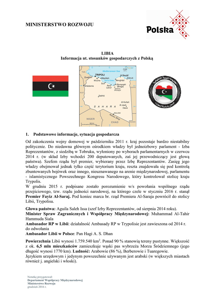MINISTERSTWO ROZWOJU LIBIA Informacja nt. stosunków gospodarczych z Polską 1. Podstawowe informacje, sytuacja gospodarcza Od zakończenia wojny domowej w październiku 2011 r. kraj pozostaje bardzo niestabilny politycznie. Do niedawna głównym ośrodkiem władzy był jednoizbowy parlament - Izba Reprezentantów, z siedzibą w Tobruku, wyłoniony po wyborach parlamentarnych w czerwcu 2014 r. (w skład Izby wchodzi 200 deputowanych, zaś jej przewodniczący jest głową państwa). Szefem rządu był premier, wybierany przez Izbę Reprezentantów. Zasięg jego władzy obejmował jednak tylko część terytorium kraju, reszta znajdowała się pod kontrolą zbuntowanych bojówek oraz innego, nieuznawanego na arenie międzynarodowej, parlamentu - islamistycznego Powszechnego Kongresu Narodowego, który kontrolował stolicę kraju Trypolis. W grudniu 2015 r. podpisane zostało porozumienie w/s powołania wspólnego rządu przejściowego, tzw. rządu jedności narodowej, na którego czele w styczniu 2016 r. stanął Premier Fayiz Al-Saraj. Pod koniec marca br. rząd Premiera Al-Saraja powrócił do stolicy Libii, Trypolisu. Głowa państwa: Aguila Saleh Issa (szef Izby Reprezentantów, od sierpnia 2014 roku). Minister Spraw Zagranicznych i Współpracy Międzynarodowej: Muhammad Al-Tahir Hammuda Siala Ambasador RP w Libii: działalność Ambasady RP w Trypolisie jest zawieszona od 2014 r. do odwołania Ambasador Libii w Polsce: Pan Hagi A. S. Dhan Powierzchnia Libii wynosi 1.759.540 km2. Ponad 90 % stanowią tereny pustynne. Większość z ok. 6,5 mln mieszkańców zamieszkuje wąski pas wybrzeża Morza Śródziemnego (jego długość wynosi 1770 km). Ludność: Arabowie (86 %), Berberowie i Tuaregowie. Językiem urzędowym i jedynym powszechnie używanym jest arabski (w większych miastach również j. angielski i włoski). Notatkę przygotował: Departament Współpracy Międzynarodowej Ministerstwo Rozwoju grudzień 2016 r. Stolica: Trypolis (ok. 1,2 mln mieszkańców), drugim największym miastem jest Benghazi (640 tys.). Bogactwa naturalne: ropa naftowa, gaz ziemny, gips. Walutą narodową jest dinar libijski LYD; średni kurs wymiany w 2015 r. wynosił: 1 USD = 1,379 LYD. Struktura PKB: rolnictwo – 1,9 %, przemysł – 43,1 %, usługi – 55,0 %. Gospodarka libijska jest zdominowana przez sektor węglowodorów, który w okresie przed „arabską wiosną” dostarczał około 98 % wpływów eksportowych oraz 90 % dochodów budżetowych, generując ponad 70 % PKB kraju. W czasie rewolucji produkcja tego towaru spadła z 1,77 mln baryłek do zaledwie 22 tys. baryłek dziennie. Od roku 2012 nastąpił znaczący wzrost mocy produkcyjnych, które dotychczas jednak nie powróciły do wcześniejszego poziomu. Podstawowe wskaźniki makroekonomiczne gospodarki: Wyszczególnienie Wzrost PKB (w %) PKB (PPP, mld USD) PKB per capita (PPP, USD) Stopa inflacji (w %, r.d r.) Dług publiczny (% PKB) Dług zagraniczny (w mld USD) Rezerwy dewizowe (w mld USD) Eksport (w mld USD) Import (w mld USD) BIZ w Libii (mld USD, wartość skumulowana) Inwestycje Libii za granicą (mld USD, wartość skumulowana) 2012 2013 2014 2015* b/d 149,1 24 200 3,6 b/d 4,77 b/d 51,5 16,3 b/d - 13,6 130,2 20 800 2,6 3,5 6,03 b/d 46,0 34,0 16,04 - 24,0 98,9 15 800 8,7 7,2 5,24 89,3 13,8 20,4 18,7 - 6,4 92,6 14 600 12,1 8,0 3,99 71,0 10,9 11,2 18,8 b/d 20,16 20,91 21,59 Źródło: Międzynarodowy Fundusz Walutowy, CIA, African Economic Outlook */ dane szacunkowe W wymianie handlowej z zagranicą do 2013 r. Libia tradycyjnie odnotowywała dodatnie saldo obrotów (ok. 12 mld USD w 2013 r.). Według szacunkowych danych, libijski eksport w 2014 r. osiągnął poziom 13,8 mld USD, natomiast import przekroczył 20 mld USD, co przyniosło ujemne saldo w wysokości ponad 6,5 mld USD. W roku ubiegłym uległo ono zmniejszeniu do ok. 0,3 mld USD. Eksport – główne towary: ropa naftowa i produkty jej przetwórstwa, gaz ziemny, chemikalia. Najwięksi partnerzy: Włochy – 32,1 %, Niemcy – 11,3 %, Chiny – 8 %, Francja – 8 %, Hiszpania – 5,6 %, Syria – 5,3 %. Import – główne towary: maszyny, żywność, sprzęt transportowy, dobra konsumpcyjne. Główni partnerzy: Chiny – 14,8 %, Włochy – 12,9 %, Turcja - 11,1 %, Tunezja – 6,5 %, Francja – 6,1 %, Hiszpania, Syria i Egipt – po ok. 4,5 %. W raporcie Banku Światowego Doing Business 2017 oceniającym warunki prowadzenia działalności gospodarczej w poszczególnych krajach, Libia zajmuje trzecią od końca, 188. pozycję wśród 200 ujętych w rankingu gospodarek świata. 2 Stosunki z UE: Dotychczas nie powstały żadne związki prawno-traktatowe pomiędzy Unią Europejską a Libią. Libia nie jest członkiem Unii dla Śródziemnomorza - posiada jedynie status obserwatora. Od listopada 2008 r. trwają negocjacje Libii z Komisją Europejską dotyczące wypracowania ramowej umowy o współpracy. Obalenie reżimu Płk Kadafiego przyspieszyło rozwój współpracy pomiędzy Libią a Unią Europejską. W 2011 r. otworzona została delegatura UE w Trypolisie (tymczasowo przeniesiona do Tunisu). Libia korzysta również z programów pomocowych w ramach Europejskiego Instrumentu Sąsiedztwa i Partnerstwa (ENPI). Członkostwo w organizacjach międzynarodowych: Libia aktywnie działa na forum Unii Afrykańskiej (AU), należy także do Unii Maghrebu Arabskiego (AMU), Wielkiej Arabskiej Strefy Wolnego Handlu (GAFTA), Ligi Arabskiej (AL), Organizacji Państw Eksporterów Ropy Naftowej (OPEC), Organizacji Państw Arabskich Eksportujących Ropę Naftową (OAPEC), Międzynarodowego Funduszu Walutowego (IMF), Arabskiego Funduszu Walutowego (AMF), Banku Światowego (WB), Afrykańskiego Banku Rozwoju (AfBD), Wspólnego Rynku Wschodniej i Południowej Afryki (COMESA). W 2004 r. rozpoczęte zostały negocjacje w/s członkostwa Libii w Światowej Organizacji Handlu (WTO). Aktualnie kraj ten posiada status obserwatora. 2. Ramy prawno-traktatowe współpracy gospodarczej • Jedyną umową 