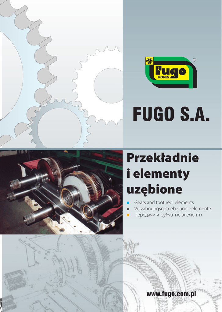 FUGO S.A. Przekładnie i elementy uzębione Gears and toothed elements Verzahnungsgetriebe und -elemente Передачи и зубчатые элементы www.fugo.com.pl FUGO S.A. Kompetencja. Doświadczenie techniczno-produkcyjne. Organizacja pracy. Nowoczesne wyposażenie sprzętowo-narzędziowe, badawcze i kontrolno-pomiarowe. Dbałość o szczegóły. Dążenie do perfekcji w produkcji i obsłudze klienta. To cechy charakterystyczne naszej firmy. Competence. Technical-production experience. Work organisation. State-of-the-art tooling, research, measuring and control equipment. Caring for details. Striving for perfection in production and customer service. These are the features characteristic of our Company. Kompetenz. Technisch-produktive Erfahrung. Arbeitorganisation. Moderne Ausrüstung in Geräte, Werkzeuge, Forschungsausrüstung und Kontroll-Messausrüstung. Sorgfalt um Einzelheiten. Streben nach Perfektion in der Produktion und Kundenbedienung. Das sind charakteristische Merkmale unserer Firma. Компетенция. Техническо-производственный опыт. Организация работы. Современное инструментальное, испытательное и контрольно-измерительное оборудование и оснастка. Забота о деталях. Стремление к совершенству в производстве и обслуживании клиента. Это характерные черты нашей фирмы. Doświadczenie techn 2 FUGO S.A. Z przyjemnością prezentujemy Państwu elementy techniki napędowej w tym reduktory z zazębieniem klasycznym i planetarnym oraz pojedyncze elementy uzębione, które zajmują znaczącą pozycję wśród produktów naszej firmy. It is our pleasure to present you elements of driving technology including reducers with standard and planetary meshing and single toothed elements which occupy a significant position among our Company’s products. Mit Vergnügen präsentieren wir Ihnen Elemente der Antriebstechnik, dabei Untersetzungsgetriebe (Reduktoren) mit der klassischen und planetarischen Verzahnung und einzelne Verzahnungselemente, die eine bedeutende Position unter Produkten unserer Firma haben. С удовольствием представляем Вам элементы приводной техники, в том числе, редукторы с зубчатым классическим и планетарным зацеплением, а также единичные зубчатые элементы, которые занимают значимое место среди продуктов нашей фирмы. niczno-produkcyjne. 3 FUGO S.A. PEWNOŚĆ NASZYCH PRODUKTÓW ZAB Reliability of our products secures Zuverlässigkeit unserer Produkten sichert Надежность наших продуктов защищает Zespół techniczny z bogatą wiedzą inżynierską w dziedzinie projektowania i wytwarzania. Współpraca z Jednostkami naukowymi i Specjalistycznymi Biurami Projektowymi Technical team with rich engineering knowledge in the field of design and production. Cooperation with scientific units and specialist designing departments. Technisches Team mit reichem Ingenieurwissen im Bereich von Planen und Herstellen. Zusammenarbeit mit Wissenschaftsstellen und Projektfachbüros Технический коллектив с богатыми инженерными знаниями по части проектирования и изготовления. Сотрудничество с научными Учреждениями и Специализированными Проектными Бюро Wytwarzanie elementów uzębionych w oparciu o sprawdzone procesy technologiczne i produkcyjne Production of toothed elements based on tested technological and production processes Herstellung der Verzahnungselement in Anlehnung an geprüfte technologische und Produktionsvefahren Изготовление зубчатых элементов на основании проверенных технологических и производственных процессов PROJEKTUJEMY - WYTWARZAMY - NADZORUJE We design - produce - monitor - improve - test - ensure Wir planen - stellen her - überwachen - vervollkommnen - testen - gewährleisten Проектируем - изготовляем - контролируем - совершенствуем - Zdolność do wykańczania twardych zarysów uzębień Ability to finish hard gear tooth forms Nachbearbeitungskraft von harten Verzahnungsabrissen Способность отделывать твёрдые зубчатые профили 4 Testowanie na stanowiskach prób ruchowych i odbiorowych pod obciążeniem Testing under load on motion test and reception stands Testen der Bewegungsproben und Abnahmeproben unter Belastung an den Arbeitsstellen Тестирование на установках работы и приема оборудования под нагрузкой FUGO S.A. ABEZPIECZA: Proces wytwarzania nadzorowany zgodnie z wymaganiami ISO Production process monitored in compliance with ISO. Herstellungsverfahren wird nach ISO-Anforderungen überwacht Процесс производства контролируется в соответствии с требованиями ISO Proces obróbki cieplno-chemicznej nadzorowany w czasie rzeczywistym Heat and chemical treatment monitored in real time Prozess der thermisch-chemischen Behandlung wird in der wirklichen Zeit überwacht Процесс термически-химической обработки контролируется в реальном времени JEMY – DOSKONALIMY - TESTUJEMY - ZAPEWNIAMY уем - тестируем - гарантируем Elastyczność wobec indywidualnych potrzeb i oczekiwań klienta Flexibility as regards customers’ individual needs and expectations Elastizität dem individuellen