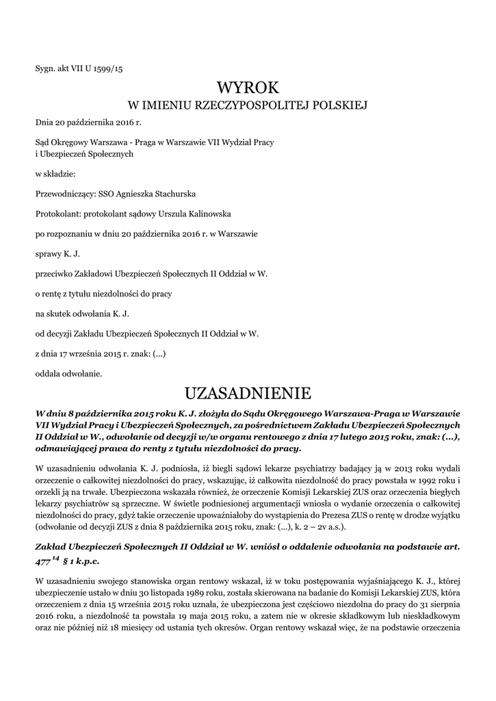 Sygn. akt VII U 1599/15 WYROK W IMIENIU RZECZYPOSPOLITEJ POLSKIEJ Dnia 20 października 2016 r. Sąd Okręgowy Warszawa - Praga w Warszawie VII Wydział Pracy i Ubezpieczeń Społecznych w składzie: Przewodniczący: SSO Agnieszka Stachurska Protokolant: protokolant sądowy Urszula Kalinowska po rozpoznaniu w dniu 20 października 2016 r. w Warszawie sprawy K. J. przeciwko Zakładowi Ubezpieczeń Społecznych II Oddział w W. o rentę z tytułu niezdolności do pracy na skutek odwołania K. J. od decyzji Zakładu Ubezpieczeń Społecznych II Oddział w W. z dnia 17 września 2015 r. znak: (...) oddala odwołanie. UZASADNIENIE W dniu 8 października 2015 roku K. J. złożyła do Sądu Okręgowego Warszawa-Praga w Warszawie VII Wydział Pracy i Ubezpieczeń Społecznych, za pośrednictwem Zakładu Ubezpieczeń Społecznych II Oddział w W., odwołanie od decyzji w/w organu rentowego z dnia 17 lutego 2015 roku, znak: (...), odmawiającej prawa do renty z tytułu niezdolności do pracy. W uzasadnieniu odwołania K. J. podniosła, iż biegli sądowi lekarze psychiatrzy badający ją w 2013 roku wydali orzeczenie o całkowitej niezdolności do pracy, wskazując, iż całkowita niezdolność do pracy powstała w 1992 roku i orzekli ją na trwałe. Ubezpieczona wskazała również, że orzeczenie Komisji Lekarskiej ZUS oraz orzeczenia biegłych lekarzy psychiatrów są sprzeczne. W świetle podniesionej argumentacji wniosła o wydanie orzeczenia o całkowitej niezdolności do pracy, gdyż takie orzeczenie upoważniałoby do wystąpienia do Prezesa ZUS o rentę w drodze wyjątku (odwołanie od decyzji ZUS z dnia 8 października 2015 roku, znak: (...), k. 2 – 2v a.s.). Zakład Ubezpieczeń Społecznych II Oddział w W. wniósł o oddalenie odwołania na podstawie art. 477 14 § 1 k.p.c. W uzasadnieniu swojego stanowiska organ rentowy wskazał, iż w toku postępowania wyjaśniającego K. J., której ubezpieczenie ustało w dniu 30 listopada 1989 roku, została skierowana na badanie do Komisji Lekarskiej ZUS, która orzeczeniem z dnia 15 września 2015 roku uznała, że ubezpieczona jest częściowo niezdolna do pracy do 31 sierpnia 2016 roku, a niezdolność ta powstała 19 maja 2015 roku, a zatem nie w okresie składkowym lub nieskładkowym oraz nie później niż 18 miesięcy od ustania tych okresów. Organ rentowy wskazał więc, że na podstawie orzeczenia Komisji Lekarskiej ZUS oraz w oparciu o art. 57 ustawy o emeryturach i rentach z Funduszu Ubezpieczeń Społecznych, zaskarżoną decyzją z dnia 17 września 2015 roku, znak (...), odmówił ubezpieczonej prawa do renty z tytułu niezdolności do pracy. W świetle powyższego odwołanie K. J., jako bezzasadne, winno podlegać oddaleniu (odpowiedź na odwołanie z dnia 2 listopada 2015r., k. 6 a.s.). Sąd Okręgowy ustalił następujący stan faktyczny: K. J., ur. (...), z zawodu technik elektronik, pracowała ostatnio jako księgowa. Ostatni jej okres ubezpieczenia zakończył się z dniem 30 listopada 1989 roku. Ubezpieczona leczy się psychiatrycznie od 1992 roku, pozostaje pod opieką PZP w D. (wniosek o rentę z tytułu niezdolności do pracy, k. 1 – 4 t. III a.r., dokumentacja lekarska – t. II a.r., świadectwo pracy z dnia 28 listopada 1989r., k. 7 t. I a.r.). Wyrokiem z dnia 4 lipca 2013 roku Sąd Okręgowy Warszawa-Praga w Warszawie VII Wydział Pracy i Ubezpieczeń Społecznych w sprawie VII U 1468/11 oddalił odwołanie K. J. od decyzji Zakładu Ubezpieczeń Społecznych II Oddział w W. z dnia 13 października 2011 roku, znak: (...). W/w decyzją organ rentowy odmówił K. J. prawa do renty z tytułu niezdolności do pracy, ponieważ ubezpieczona nie spełniła przesłanki określonej w art. 57 ust. 1 pkt 1 ustawy o emeryturach i rentach z Funduszu Ubezpieczeń Społecznych, mianowicie Komisja Lekarska ZUS uznała, że ubezpieczona nie jest niezdolna do pracy. W toku postępowania sądowego biegły psychiatra stwierdził, iż ubezpieczona jest trwale niezdolna do pracy. Sąd Okręgowy ustalił jednak, iż K. J. w dziesięcioleciu przed wystąpieniem niezdolności do pracy, tj. w okresie od 14 maja 1982 roku do 13 maja 1992 roku, nie udowodniła 5 lat okresów składkowych i nieskładkowych, a jedynie 3 lata, 4 miesiące i 25 dni. Ponadto, niezdolność do pracy powstała w okresie dłuższym niż 18 miesięcy od ustania ubezpieczenia, bowiem ostatnie zatrudnienia ubezpieczonej ustało w 1989 roku (wyrok Sądu Okręgowego Warszawa-Praga w Warszawie z dnia 4 lipca 2013 roku wraz z fragmentem uzasadnienia, sygn. akt VII U 1468/11 , k. 3 – 5 a.s. oraz k. 12 – 16 t. IV a.r.). W dniu 22 lipca 2015 roku K. J. złożyła ponownie wniosek o rentę z tytułu niezdolności do pracy (wniosek o rentę z tytułu niezdolności do pracy, k. 1 – 4 t. IV a.r.). Po przeprowadzeniu bezpośredniego badania i dokonaniu analizy przedstawionej dokumentacji medycznej, w tym: dokumentacji z przebiegu leczenia z okresu do 2013 roku, zaświadczeń o stanie zdrowia wystawionych przez lekarzy leczących w dniu 14 listopada 2013 roku, Lekarz Orzecznik ZUS wydał w dniu 12 sierpnia 2015 roku orzeczenie, w którym ustalił, że K. J. nie jest niezdolna do pracy (orzeczenie Lekarza Orzecznika ZUS z dnia 12 sierpnia 2015 roku, 18 - 18v, t. IV a.r.). W związku z wniesionym sprzeciwem od orzeczenia Lekarza Orzecznika ZUS z dnia 21 sierpnia 2015 roku, sprawa została skierowana do rozpoznania przez Komisję Lekarską ZUS nr (...), która orzeczeniem z dnia 15 września 2015 roku ustaliła, że K. J. jest osobą częściowo niezdolną do pracy do 31 sierpnia 2016 roku. Datę powstania częściowej niezdolności do pracy Komisja Lekarska ZUS określiła na dzień 19 maja 2015 roku. Orzeczenie Komisji Lekarskiej ZUS wydane zostało po przeprowadzeniu bezpośredniego badania i dokonaniu analizy przedstawionej dokumentacji medycznej, w tym: dokumentacji z przebiegu leczenia w latach 1992 - 2015, zaświadczeń o stanie zdrowia wystawionych przez lekarzy leczą