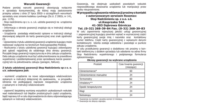 Warunki Gwarancji: Podane poniżej warunki gwarancji obowiązują wyłącznie w sprzedaży konsumenckiej, do której mają zastosowanie przepisy ustawy z dnia 27 lipca 2002r o szczególnych warunkach sprzedaży oraz zmianie kodeksu cywilnego (Dz.U. Z 2002r, nr 141, poz. 1176). - Stop nadciśnieniu sp z o. o. s.k. udziela gwarancji na urządzenia Rossmax. - Informacja o okresie gwarancji znajduje się w instrukcji obsługi urządzenia. - Urządzenia posiadają właściwości opisane w instrukcji obsługi stanowiącej załącznik do karty gwarancyjnej oraz znak zgodności CE. - Uprawnienia z tytułu udzielonej gwarancji urządzenia kupujący może realizować wyłącznie na terytorium Rzeczypospolitej Polskiej. - Rozliczenia z tytułu udzielonej gwarancji kupujący zobowiązany jest zgłosić najpóźniej do ostatniego dnia okresu gwarancji. Początek biegu gwarancji rozpoczyna się w dniu zakupu urządzenia. Data zakupu urządzenia musi być udokumentowana na prawidłowo wypełnionej i podstemplowanej przez sprzedawcę karcie gwarancyjnej lub na pokwitowaniu zakupu (paragon, faktura). Z tytułu udzielonej gwarancji Stop Nadciśnieniu sp z o. o. s.k. zobowiązana jest: - wymienić urządzenie na nowe odpowiadające właściwościom opisanym w instrukcji dołączonej do opakowania, w przypadku istnienia nie podlegającej naprawie niezgodności urządzenia z opisanymi w instrukcji właściwościami lub - zapewnić bezpłatną wymianę wszystkich uszkodzonych wskutek wad materiałowych lub błędów produkcyjnych części urządzenia, bądź naprawy ich w celu doprowadzenia do stanu odpowiadającego opisanym w instrukcji właściwościom. Gwarancja, nie obejmuje uszkodzeń powstałych wskutek nieprawidłowego stosowania urządzenia lub manipulacji przez osoby nieuprawnione. W przypadku zgłoszenia reklamacji prosimy o kontakt z autoryzowanym serwisem Rossmax: Stop Nadciśnieniu sp. z o.o. s.k. ul.Kasprzaka 54A 41-303 Dąbrowa Górnicza Tel. (0-32) 268-39-84 Fax. (0-32) 268-39-83 W celu zapewnienia najwyższej jakości usługi gwarancyjnej i pogwarancyjnej kupujący powinien wpisać w wyznaczonej części karty gwarancyjnej swoje imię i nazwisko oraz kontaktowy numer telefonu. Część karty gwarancyjnej z wpisanymi danymi kontaktowymi klienta zostaje oddzielona i pozostaje w punkcie zakupu urządzenia. W celu przedłużenia gwarancji o dodatkowy rok prosimy o kontakt telefoniczny z działem sprzedaży lub odesłanie na adres firmy Stop Nadciśnieniu wypełnionego i podpisanego formularza zgłoszeniowego. Okresy gwarancji na wybrane urządzenia Produkt Czas trwania gwarancji (miesiące) Ciśnieniomierze* 60 Ciśnieniomierze manualne 24 Termometry 60 Inhalatory** 24 Opaski terapeutyczne 24 Wagi 24 Stetoskopy 24 * Gwarancja na mankiet i gruszkę wynosi 12 miesięcy. ** Gwarancja nie dotyczy osprzętu. Model urządzenia: Opis wykonanej naprawy GWARANCJA JEST WAŻNA WYŁĄCZNIE Z DOKUMENTEM ZAKUPU Numer seryjny: Data sprzedaży: Podpis sprzedawcy: STOP NADCISNIENIU sp z o. o. S.K. ul.Kasprzaka 54A 41-303 Dąbrowa Górnicza Tel. (0-32) 268-39-84 Fax. (0-32) 268-39-83 Pieczątka i podpis Pieczęć sprzedawcy Data i podpis: Wyrażam zgodę na przetwarzanie danych osobowych przez firmę Stop Nadciśnieniu sp. z o.o. s.k. dla celu zapewnienia najwyższej jakośći obsługi gwarancyjnej i pogwarancyjnej zgodnie z art. 23, 24 i 25 ustawy z dnia 29 sierpnia 1997r. o ochronie danych osobowych (Dz.U. z 2002r. Nr 101, poz. 926 z poź. zm.). Model urządzenia: Numer telefonu: Nazwisko: Imię: Oświadczam, że zapoznałem się i akceptuje warunki gwarancji. Lp. Data naprawy KARTA GWARANCYJNA PRODUKTU ROSSMAX
