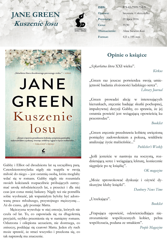 JANE GREEN Kuszenie losu ISBN: 978-83-7999-758-9 Oprawa: broszura + skrzydełka Premiera: 20 lipca 2016 Cena: 35,90 Tłumaczenie: Alina Siewior-Kuś Format: 123 x 195 mm Opinie o książce „Szkarłatna litera XXI wieku”. Kirkus „Green raz jeszcze potwierdza swoją umiejętność badania złożoności ludzkiego serca”. Library Journal „Green prowadzi akcję w interesujących kierunkach, zręcznie badając skutki pochopnej, impulsywnej decyzji Gabby, co sprawia, że jej ostatnia powieść jest wciągającą opowieścią ku przestrodze”. Booklist „Green zręcznie przedstawia kobietę uwięzioną pomiędzy zadowoleniem a pokusą, wnikliwie analizując życie małżeńskie...” Publisher’s Weekly Gabby i Elliot od dwudziestu lat są szczęśliwą parą. Czterdziestotrzylatka nigdy nie wątpiła w swoją miłość do niego – jest ostatnią osobą, która mogłaby wdać się w romans. Gabby nigdy nie rozumiała swoich koleżanek rozpaczliwie próbujących zatrzymać urodę młodzieńczych lat, a przecież i dla niej czas jest coraz mniej łaskawy. Nigdy też nie potrafiła sobie wyobrazić, jak wspaniałym byłoby być adorowaną przez młodszego, przystojnego mężczyznę… Aż do czasu, gdy poznaje Matta. Mężczyzna wywołuje w niej emocje, których nie czuła od lat. To, co zapowiada się na długoletnią przyjaźń, szybko przemienia się w namiętny romans. Odurzona i oślepiona uczuciem, nie dostrzega, co zniszczy, poddając się czarowi Matta. Jeden zły ruch może sprawić, że straci wszystko i przekona się, co tak naprawdę ma znaczenie. „Jeśli jesteście w nastroju na soczystą, rozdzierającą serce i wciągającą lekturę, koniecznie sięgnijcie po tę książkę”. OK magazine „Może sprowokować dyskusje i ożywić dyskusyjne kluby książki”. Danbury News Time „Urzekająca”. Booklist „Frapująca opowieść, odzwierciedlająca niezrozumienie współczesnych kobiet, pełna współczucia, podana ze smakiem”. People Magazine Kolejna powieść autorki bestsellerów „The New York Times”! 18 powieści, 10 milionów egzemplarzy sprzedanych na całym świecie! Sonia Draga Sp. z o.o., Pl. Grunwaldzki 8-10, 40-127 Katowice, Tel.: 32 7826477, 7826037, Fax: 032 2537728 Dział handlowy: Danuta Czarnowska, 693420384, [email protected] Promocja: Agnieszka Jedlińska, 695672067, [email protected] Redakcja: [email protected] JANE GREEN Dziennikarka, która pewnego dnia postawiła wszystko na jedną kartę, rzucając posadę w „The Daily Express”, by spełnić swoje wielkie marzenie i zająć się pisaniem książek. Dziś jest jedną z najpopularniejszych brytyjskich pisarek, ma na koncie kilkanaście bestsellerów i rzesze wiernych fanów. Polskim czytelnikom znana jest dzięki powieściom: Druga szansa, Domek na plaży, Obietnice, których trzeba dotrzymać, Zacząć od nowa, Posklejana rodzina oraz Czysty przypadek. Wszystkie ukazały się nakładem Wydawnictwa Sonia Draga. Jane wciąż sporadycznie publikuje w „Huffington Post”, „The Sunday Times” i „Self ”. Mieszka w Westport z mężem i szóstką dzieci. Strona internetowa Jane Green: http://www.janegreen.com/ Autorka jest na różnych portalach społecznościowych: https://www.facebook.com/authorJaneGreen/ https://twitter.com/janegreen https://www.instagram.com/janegreenauthor/ http://www.pinterest.com/realjanegreen/ „Jane Green to królowa wśród pisarek kobiecych. Ma na swoim koncie kilkanaście powieści i wciąż zostawia koleżanki z branży daleko w tyle”. Heat „Jane Green to mistrzyni zabawnej, inteligentnej literatury dla kobiet. Będziecie poruszeni i zaintrygowani”. Woman „Kartki przewraca się z wypiekami na twarzy, od pierwszej do ostatniej strony”. Daily Express „Jane Green, autorka wielu kobiecych bestsellerów z ujmującą prostotą przemyca uniwersalne prawdy – pokonaj i szanuj siebie, a wtedy przyjdzie czas na prawdziwą miłość. Jej książki są pełne optymizmu. Miłość, lojalność i ludzie – tylko to liczy się w życiu”. Magazyn Literacki Książki „Powieści Green konsekwentnie przedstawiają realistyczne, przystępne, szczere, i rozczulające historie o ludziach, ich problemach i uczuciach”. Redbook