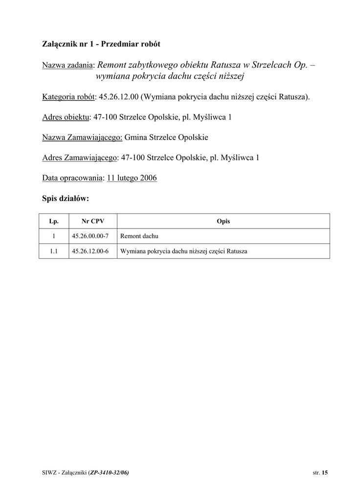 Załącznik nr 1 - Przedmiar robót Nazwa zadania: Remont zabytkowego obiektu Ratusza w Strzelcach Op. – wymiana pokrycia dachu części niŜszej Kategoria robót: 45.26.12.00 (Wymiana pokrycia dachu niŜszej części Ratusza). Adres obiektu: 47-100 Strzelce Opolskie, pl. Myśliwca 1 Nazwa Zamawiającego: Gmina Strzelce Opolskie Adres Zamawiającego: 47-100 Strzelce Opolskie, pl. Myśliwca 1 Data opracowania: 11 lutego 2006 Spis działów: Lp. Nr CPV Opis 1 45.26.00.00-7 Remont dachu 1.1 45.26.12.00-6 Wymiana pokrycia dachu niŜszej części Ratusza SIWZ - Załączniki (ZP-3410-32/06) str. 15 TABELA PRZEDMIARU ROBÓT Lp. Nr spec.techn. Podstawa Opis i wyliczenia j.m. Poszcz Razem REMONT DACHU 1 1.1 ST Wymiana pokrycia dachu niŜszej części Ratusza - etap I KNR 4-01 0235-02 Rozebranie pokrycia dachowego z blachy nie nadającej się do uŜytku m2 (11.4*13.9+11.3*14.5m2 3.6*7.4)*2+((11.3+14.5+13.9*2+11.4)*1)*2+((3.6+5)*0.4)*2 728.220 RAZEM 1.2 ST KNR 4-01 0214-01 Uzupełnienie pokryć z 1 warstwy papy asfaltowej na dachach drewnianych w nakładkę m2 poz.1.1 m2 728.220 RAZEM 1.3 ST UłoŜenie maty "ENKAMAT" jako izolacji umozliwiającej wentylacje przestrzeni pod pokryciem z blachy m poz.1.1 m2 728.220 KNR 4-01 0214-02 Kalkulacja indywidualna -Wymiana deskowania dachu z desek grubości 25 mm na pióro i wpust m 30% pow. z poz. 1 poz.1.1*30% m2 KNBK 23 0101-02 218.466 KNR 4-01 0235-04 Krycie dachu blachą miedzianą w arkuszach m poz.1.1 m2 Rozebranie rynien z blachy nie nadającej się do uŜytku m (11.3+14.5+9.5+11.4+13.9*2+15.9)*2 m 728.220 KNBK 23 0103-02 Wykonanie i zawieszenie rynien półokrągłych śr.do 15 cm z blachy miedzianej gr 0,6mm m (11.3+14.5+9.5+11.4+13.9*2+15.9)*2 m KNNR 7 0401-04 KNNR 7 0401-04 DemontaŜ płyt poliwęglanowych z przekryc korytarzy m 4.0*8.0*2 m2 64.000 Szklenie ram świetlików płytami poliwęglanowymi ciepłochronnymi gr 25mm m2 64 m2 KNRK 5 0105-03 Obróbka połączeń płyt i płyt z murem tasmą Wakaflex m ((4.0+8.0)*2+4.0*6)*2 m KNR 4-03 0515-04 Przykręcanie drobnych elementów konstrukcji o masie do 0.5 kg na gotowym podłoŜu na ścianie - 2 mocowania szt. 8*2 szt. 96.00 16.000 RAZEM str. 16 64.00 96.000 RAZEM 1.11 ST 64.00 64.000 RAZEM 1.10 ST 180.80 2 RAZEM 1.9 ST 180.80 180.800 RAZEM 1.8 ST 728.22 180.800 RAZEM 1.7 ST 218.47 2 RAZEM 1.6 ST 728.22 2 RAZEM 1.5 ST 728.22 2 RAZEM 1.4 ST 728.22 16.00 SIWZ – Załączniki (ZP-3410-32/06) 1.12 ST KNR 4-01 0122-01 Obsadzenie obluzowanych wsporników szt. 8*2 szt. 16.000 RAZEM 1.13 ST KNR 4-01 0301-02 Odbicie tynków z zaprawy cementowo-wapiennej m (0.6*2+0.3*2)*1.5 m2 2.700 RAZEM 1.14 ST KNR 4-01 0335-02 Wykonanie tynków zwykłych cementowo-wapiennych kat. III na kominach ponad dachem płaskim m2 (0.6*2+0.3*2)*1.5 m2 KNR 2-02 0423-02 Spoinowanie ścian zaprawą cementową, barwiona m (1.182+0.4*2)*2.2 m2 4.360 Wywóz elem. z demontaŜu samochodami samowyładowczymi do 1 km m pokrycie dachowe-papa poz.1.1*0.01 m3 7.282 m 3 6.554 m 3 3.840 m 3 0.081 Wywóz- na kaŜdy następny 1 km Krotność = 5 m 3 poz.1.16 m3 pł. poliwęglanowe tynk poz.1.1*30%*0.03 64.0*0.06 2.70*0.03 RAZEM 1.17 ST KNR 4-01 0008-12 KNR 4-04 0507-0101 Wywóz złomu z terenu rozbiórki t pokrycie z blachy poz.1.1*0.008 t KNR 4-04 0507-0401 Wywóz złomu z terenu rozbiórki nakłądy uzupełniające za kaŜdy dalszy rozpoczęty 1 km odległości ponad 1 km t poz.1.18 t Opłata za składowanie odpadów i zanieczyszczenie środowiska - róŜne odpady t pokrycie dachowe poz.1.1*0.005 t 3.641 deskowanie poz.1.1*30%*0.03*0.8 t 5.243 pł. poliwęglanowe 64.0*0.04 t 2.560 RAZEM 2 2.1 ST 5.83 11.44 Wymiana pokrycia dachu niŜszej części Ratusza - etap II KNR 4-01 0235-02 Rozebranie pokrycia dachowego z blachy nie nadającej się do uŜytku m2 9.5*15.9+(9.5*2+15.9)*0.12+0.5*2*2*4+(9.5*2+15.9*2)*1 m2 214.038 RAZEM 2.2 ST 5.83 5.830 RAZEM 1.20 17.76 5.826 RAZEM 1.19 ST 17.76 17.760 RAZEM 1.18 ST 4.360 3 KNR 4-01 0008-11 deskowanie 2.700 2 RAZEM 1.16 ST 2.700 2.700 RAZEM 1.15 ST 16.00 2 KNR 4-01 0219-04 korekta obmiaru Rozbiórka pokrycia z papy na dachach drewnianych pierwsza warstwa m2 2.4*5.08*2 m2 24.384 2 -0.004 -0.004 m RAZEM SIWZ - Załączniki (ZP-3410-32/06) 214.04 24.380 str. 17 2.3 ST KNR 4-01 0219-05 korekta obmiaru Rozbiórka pokrycia z papy na dachach drewnianych następna warstwa Krotność = 3 m2 2.4*5.08*2 m2 24.384 -0.004 m2 -0.004 RAZEM 2.4 ST KNR 4-01 0214-01 Uzupełnienie pokryć z 1 warstwy papy asfaltowej na dachach drewnianych w nakładkę m2 poz.2.1+24.38 m2 238.420 RAZEM 2.5 ST UłoŜenie maty "ENKAMAT" jako izolacji umozliwiającej wentylacje przestrzeni pod pokryciem z blachy m poz.2.4 m2 238.420 KNR 4-01 0214-02 Kalkulacja indywidualna -Wymiana deskowania dachu z desek grubości 25 mm na pióro i wpust m 30% pow. z poz. 1 poz.2.1*0.3 m2 KNBK 23 0101-02 64.212 Krycie dachu blachą miedzianą w arkuszach m poz.2.1+24.38 m2 238.420 Czas pracy wysięgnika- podnośnika montaŜowego dla demontaŜu i montaŜu rur spustowych m-g 0.11*144 m-g 15.840 1.9/2*120 m-g 114.000 1.82/2*24 m-g 21.840 RAZEM 2.9 ST KNR 4-01 0235-08 Rozebranie obróbek blacharskich: , okapów - gzymsów wieńczących. z blachy nie nadającej się do uŜytku m 135.3 m2 m G8 (14.50*2+2.50*2+12.50*2)*0.60 m2 35.400 m 2 30.648 m 2 35.424 2 G8 (28.32+1.20)*0.60*2 RAZEM 2.11 ST 135.30 2 Wykonanie spadków pod obr. blacharskie zaprawą systemową 35.08*0.60+16.00*0.60 151.68 135.300 KNR 19-01 0432-01 G8 G9 238.42 2 RAZEM 2.10 ST 64.21 2 RAZEM 2.8 238.42 2 RAZEM 2.7 ST 238.42 2 RAZEM 2.6 ST 24.380 KNR 19-01 0284-05 Wykonanie i montaŜ obróbek blacharskich z blachy miedzianej, obróbki gzymsów wieńczących o szerokości ponad 50 cm m Elewacja tylna z bocznymi ścianami gzyms G8 (14.50*2+2.50*2+12.50*2)*0.80 m2 47.200 35.08*0.80 m2 28.064 16.00*0.80 m 2 12.800 (28.32+1.20)*0.80*2 m2 47.232 101.47 elew. frontowa z bocznymi ścianami tarasu G8 G9 Elew. boczne G8 RAZEM str. 18 135.30 SIWZ – Załączniki (ZP-3410-32/06) 2.12 ST KNR 4-01 0235-04 Rozebranie