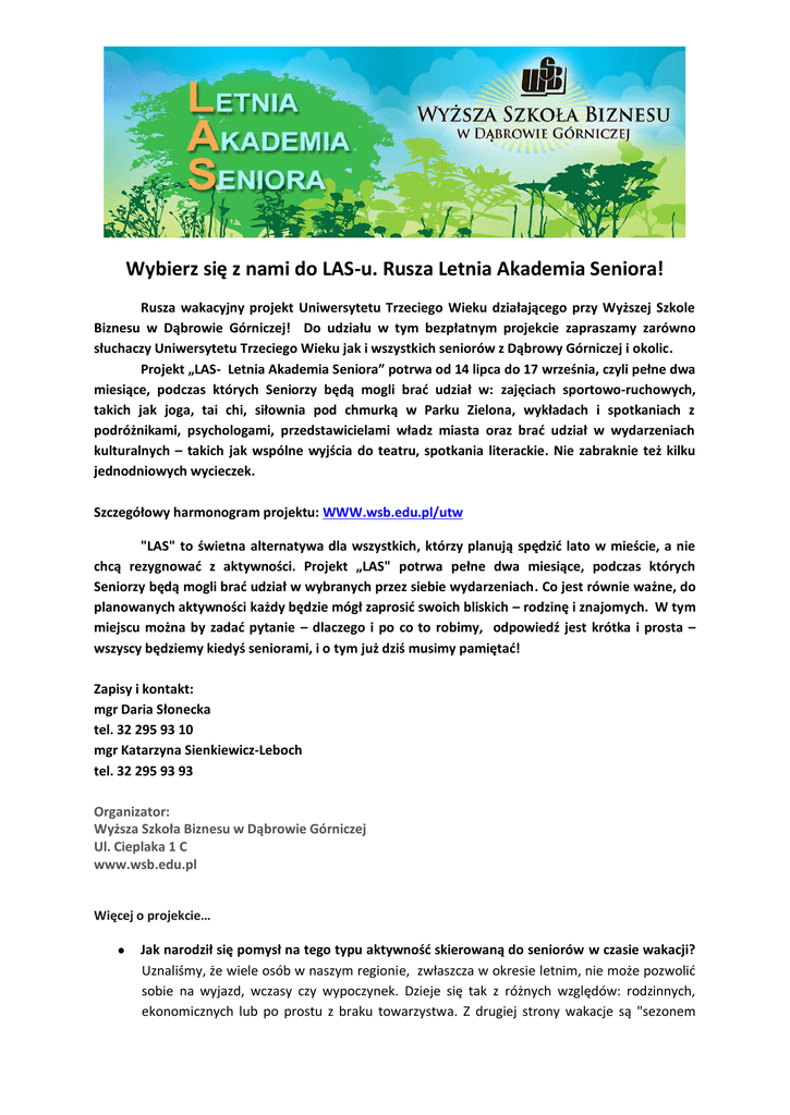 Wybierz się z nami do LAS-u. Rusza Letnia Akademia Seniora! Rusza wakacyjny projekt Uniwersytetu Trzeciego Wieku działającego przy Wyższej Szkole Biznesu w Dąbrowie Górniczej! Do udziału w tym bezpłatnym projekcie zapraszamy zarówno słuchaczy Uniwersytetu Trzeciego Wieku jak i wszystkich seniorów z Dąbrowy Górniczej i okolic. Projekt „LAS- Letnia Akademia Seniora” potrwa od 14 lipca do 17 września, czyli pełne dwa miesiące, podczas których Seniorzy będą mogli brać udział w: zajęciach sportowo-ruchowych, takich jak joga, tai chi, siłownia pod chmurką w Parku Zielona, wykładach i spotkaniach z podróżnikami, psychologami, przedstawicielami władz miasta oraz brać udział w wydarzeniach kulturalnych – takich jak wspólne wyjścia do teatru, spotkania literackie. Nie zabraknie też kilku jednodniowych wycieczek. Szczegółowy harmonogram projektu: WWW.wsb.edu.pl/utw "LAS" to świetna alternatywa dla wszystkich, którzy planują spędzić lato w mieście, a nie chcą rezygnować z aktywności. Projekt „LAS" potrwa pełne dwa miesiące, podczas których Seniorzy będą mogli brać udział w wybranych przez siebie wydarzeniach. Co jest równie ważne, do planowanych aktywności każdy będzie mógł zaprosić swoich bliskich – rodzinę i znajomych. W tym miejscu można by zadać pytanie – dlaczego i po co to robimy, odpowiedź jest krótka i prosta – wszyscy będziemy kiedyś seniorami, i o tym już dziś musimy pamiętać! Zapisy i kontakt: mgr Daria Słonecka tel. 32 295 93 10 mgr Katarzyna Sienkiewicz-Leboch tel. 32 295 93 93 Organizator: Wyższa Szkoła Biznesu w Dąbrowie Górniczej Ul. Cieplaka 1 C www.wsb.edu.pl Więcej o projekcie… Jak narodził się pomysł na tego typu aktywność skierowaną do seniorów w czasie wakacji? Uznaliśmy, że wiele osób w naszym regionie, zwłaszcza w okresie letnim, nie może pozwolić sobie na wyjazd, wczasy czy wypoczynek. Dzieje się tak z różnych względów: rodzinnych, ekonomicznych lub po prostu z braku towarzystwa. Z drugiej strony wakacje są "sezonem ogórkowym", w którym niewiele się dzieje. Mało jest imprez, wydarzeń kulturalnych. Postanowiliśmy to wykorzystać i zaproponować szereg atrakcji uszytych specjalnie na miarę potrzeb osób po pięćdziesiątym roku życia, i tym spośród seniorów, którzy zamierzają spędzić lato w mieście postanowiliśmy dać możliwość przebywania we wspólnym gronie podczas wielu ciekawych inicjatyw. Co oferujemy seniorom z terenu Zagłębia i okolic? Przede wszystkim mile i atrakcyjnie spędzony czas, mnóstwo atrakcji, rozrywki i możliwość wspólnej integracji ze środowiskiem seniorów działającym przy naszym uniwersytecie. Nasz projekt "LAS" ma być nie tylko ciekawą alternatywą spędzania wakacji w Dąbrowie, która ma wiele do zaoferowania, zarówno pod względem przyrodniczym, rekreacyjnym jak i sportowym, ale też ma zaktywizować seniorów i zachęcić ich do wyjścia z domu tym bardziej, że lato temu sprzyja. Z czego składa się „LAS”? Dla lepszego rozeznania, propozycje dla seniorów postanowiliśmy podzielić na konkretne i stałe aktywności. Do zaproponowania mamy: sportowe poniedziałki, naukowe środy i kulturalne czwartki. W każdy z tych dni, co tydzień, przez dwa miesiące, seniorzy będą mogli dobrowolnie i bezpłatnie korzystać z organizowanych przez nas wydarzeń. Wyjątkiem będą jedynie wspólne wyjścia do kina czy muzeum, gdzie uczestnicy będą musieli we własnym zakresie pokryć koszty biletów i koszty transportu. W niektóre weekendy natomiast będziemy proponować seniorom oraz ich rodzinom dodatkowe atrakcje w postaci udziału w różnego rodzaju spotkaniach i imprezach miejskich. Działalność Uniwersytety Trzeciego Wieku przy Wyższej Szkole Biznesu w Dąbrowie Górniczej. Nasz projekt ma na celu promowanie aktywnego uczestnictwa osób po pięćdziesiątym roku życia i zaangażowanie ich w działalność na rzecz naszego miasta i uniwersytetu, który od października 2014 roku szykuje sporo atrakcji, w tym planuje przeprowadzenie kilku projektów o charakterze społeczno-obywatelskim. Chcemy pokazać seniorom, że angażując się w działalność Uniwersytetu mogą dalej w sposób przyjemny pogłębiać swoją wiedzę, poprzez ciekawe tematy wykładów i spotkań. Chcemy pokazać im, że mogą również inwestować czas spędzony na naszym Uniwersytecie w swój rozwój osobisty dzięki udziałowi w warsztatach, rozwijać swoje pasje, realizować się na wielu polach aktywności społecznych, a przede wszystkim - chcemy pokazać, że wszystko to, co robią i czego dokonają w ramach działalności naszego Uniwersytetu jest dla nas ważne, cenne i przede wszystkim potrzebne - nie tylko nam, ale i całej lokalnej społeczności. Dlatego cały czas zapraszamy do zapisywania się na nasz Uniwersytet.
