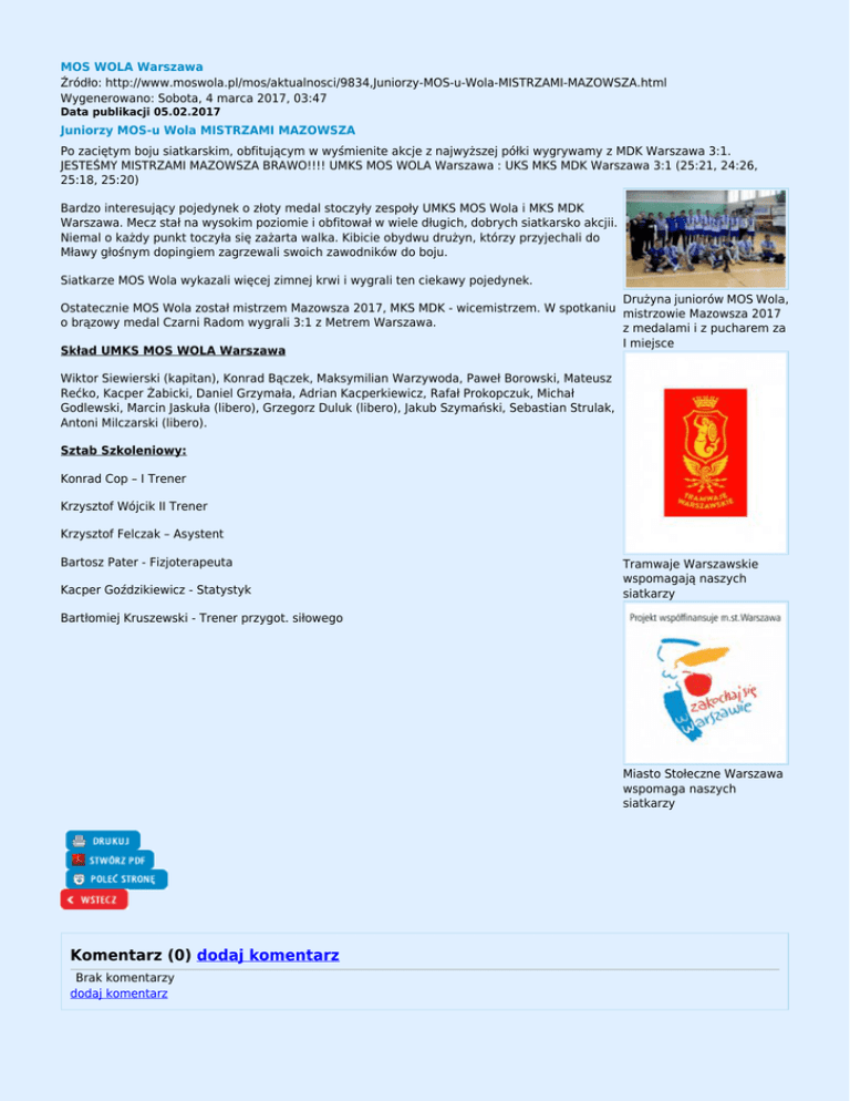 MOS WOLA Warszawa Źródło: http://www.moswola.pl/mos/aktualnosci/9834,Juniorzy-MOS-u-Wola-MISTRZAMI-MAZOWSZA.html Wygenerowano: Sobota, 4 marca 2017, 03:47 Data publikacji 05.02.2017 Juniorzy MOS-u Wola MISTRZAMI MAZOWSZA Po zaciętym boju siatkarskim, obfitującym w wyśmienite akcje z najwyższej półki wygrywamy z MDK Warszawa 3:1. JESTEŚMY MISTRZAMI MAZOWSZA BRAWO!!!! UMKS MOS WOLA Warszawa : UKS MKS MDK Warszawa 3:1 (25:21, 24:26, 25:18, 25:20) Bardzo interesujący pojedynek o złoty medal stoczyły zespoły UMKS MOS Wola i MKS MDK Warszawa. Mecz stał na wysokim poziomie i obfitował w wiele długich, dobrych siatkarsko akcjii. Niemal o każdy punkt toczyła się zażarta walka. Kibicie obydwu drużyn, którzy przyjechali do Mławy głośnym dopingiem zagrzewali swoich zawodników do boju. Siatkarze MOS Wola wykazali więcej zimnej krwi i wygrali ten ciekawy pojedynek. Drużyna juniorów MOS Wola, Ostatecznie MOS Wola został mistrzem Mazowsza 2017, MKS MDK - wicemistrzem. W spotkaniu mistrzowie Mazowsza 2017 o brązowy medal Czarni Radom wygrali 3:1 z Metrem Warszawa. z medalami i z pucharem za I miejsce Skład UMKS MOS WOLA Warszawa Wiktor Siewierski (kapitan), Konrad Bączek, Maksymilian Warzywoda, Paweł Borowski, Mateusz Rećko, Kacper Żabicki, Daniel Grzymała, Adrian Kacperkiewicz, Rafał Prokopczuk, Michał Godlewski, Marcin Jaskuła (libero), Grzegorz Duluk (libero), Jakub Szymański, Sebastian Strulak, Antoni Milczarski (libero). Sztab Szkoleniowy: Konrad Cop – I Trener Krzysztof Wójcik II Trener Krzysztof Felczak – Asystent Bartosz Pater - Fizjoterapeuta Kacper Goździkiewicz - Statystyk Tramwaje Warszawskie wspomagają naszych siatkarzy Bartłomiej Kruszewski - Trener przygot. siłowego Miasto Stołeczne Warszawa wspomaga naszych siatkarzy Komentarz (0) dodaj komentarz Brak komentarzy dodaj komentarz
