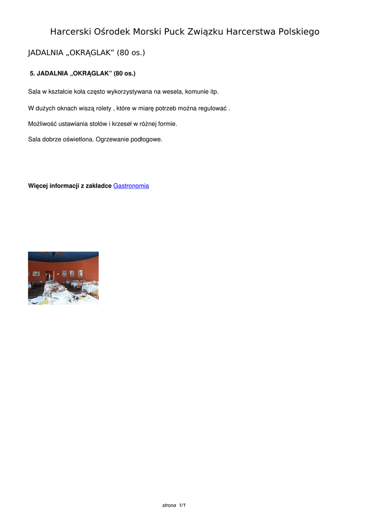 Harcerski Ośrodek Morski Puck Związku Harcerstwa Polskiego JADALNIA „OKRĄGLAK” (80 os.) 5. JADALNIA „OKRĄGLAK” (80 os.) Sala w kształcie koła często wykorzystywana na wesela, komunie itp. W dużych oknach wiszą rolety , które w miarę potrzeb można regulować . Możliwość ustawiania stołów i krzeseł w różnej formie. Sala dobrze oświetlona. Ogrzewanie podłogowe. Więcej informacji z zakładce Gastronomia strona 1/1 Powered by TCPDF (www.tcpdf.org)