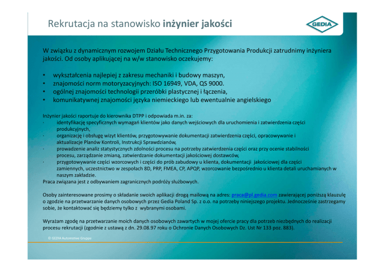 Rekrutacja na stanowisko inżynier jakości W związku z dynamicznym rozwojem Działu Technicznego Przygotowania Produkcji zatrudnimy inżyniera jakości. Od osoby aplikującej na w/w stanowisko oczekujemy: • • • • wykształcenia najlepiej z zakresu mechaniki i budowy maszyn, znajomości norm motoryzacyjnych: ISO 16949, VDA, QS 9000. ogólnej znajomości technologii przeróbki plastycznej i łączenia, komunikatywnej znajomości języka niemieckiego lub ewentualnie angielskiego Inżynier jakości raportuje do kierownika DTPP i odpowiada m.in. za: · identyfikację specyficznych wymagań klientów jako danych wejściowych dla uruchomienia i zatwierdzenia części produkcyjnych, · organizację i obsługę wizyt klientów, przygotowywanie dokumentacji zatwierdzenia części, opracowywanie i aktualizacje Planów Kontroli, Instrukcji Sprawdzianów, · prowadzenie analiz statystycznych zdolności procesu na potrzeby zatwierdzenia części oraz przy ocenie stabilności procesu, zarządzanie zmianą, zatwierdzanie dokumentacji jakościowej dostawców, · przygotowywanie części wzorcowych i części do prób zabudowy u klienta, dokumentacji jakościowej dla części zamiennych, uczestnictwo w zespołach 8D, PRP, FMEA, CP, APQP, wzorcowanie bezpośrednio u klienta detali uruchamianych w naszym zakładzie. Praca związana jest z odbywaniem zagranicznych podróży służbowych. Osoby zainteresowane prosimy o składanie swoich aplikacji drogą mailową na adres: [email protected] zawierającej poniższą klauzulę o zgodzie na przetwarzanie danych osobowych przez Gedia Poland Sp. z o.o. na potrzeby niniejszego projektu. Jednocześnie zastrzegamy sobie, że kontaktować się będziemy tylko z wybranymi osobami. Wyrażam zgodę na przetwarzanie moich danych osobowych zawartych w mojej ofercie pracy dla potrzeb niezbędnych do realizacji procesu rekrutacji (zgodnie z ustawą z dn. 29.08.97 roku o Ochronie Danych Osobowych Dz. Ust Nr 133 poz. 883). © GEDIA Automotive Gruppe