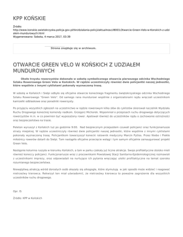 KPP KOŃSKIE Źródło: http://www.konskie.swietokrzyska.policja.gov.pl/tkn/dzialania-policji/aktualnosci/8003,Otwarcie-Green-Velo-w-Konskich-z-udzi alem-mundurowych.html Wygenerowano: Sobota, 4 marca 2017, 03:39 Strona znajduje się w archiwum. OTWARCIE GREEN VELO W KOŃSKICH Z UDZIAŁEM MUNDUROWYCH Około trzystu rowerzystów dokonało w sobotę symbolicznego otwarcia pierwszego odcinka Wschodniego Szlaku Rowerowego Green Velo w Końskich. W rajdzie uczestniczyły również dwie policjantki naszej jednostki, które wspólnie z innymi cyklistami pokonały wyznaczoną trasę. W sobotę w Końskich i Sielpi odbyło się oficjalne otwarcie koneckiego fragmentu świętokrzyskiego odcinka Wschodniego Szlaku Rowerowego "Green Velo". Od samego rana mundurowi wspólnie z organizatorami rajdu wręczali uczestnikom kamizelki odblaskowe oraz poradniki rowerzysty. Po przyjęciu wszystkich zgłoszeń na uczestnictwo w rajdzie rowerowym kilka słów do cyklistów skierował naczelnik Wydziału Ruchu Drogowego koneckiej komendy nadkom. Grzegorz Michorek. Wspomniał o przepisach ruchu drogowego dotyczących rowerzystów m.in. w co powinien być wyposażony rower. Apelował również do uczestników rajdu o zachowanie ostrożności oraz bezpieczeństwa na trasie. Peleton wyruszył z Końskich tuż po godzinie 9:00. Nad bezpiecznym przejazdem czuwali policjanci oraz funkcjonariusze straży miejskiej. W rajdzie uczestniczyły również dwie policjantki naszej jednostki, które wspólnie z innymi cyklistami pokonały wyznaczoną trasę. Policjantkom towarzyszył konecki ratownik medyczny Marcin Pytlos. Przez Niebo i Piekło miłośnicy rowerów dotarli do Sielpi. Tam nastąpiło oficjalne przecięcie wstęgi i tym samym oficjalnie zainaugurować projekt Green Velo. Następnie kolumna ruszyła w kierunku Końskich, a tam w parku czekały już liczne atrakcje. Swoje profilaktyczne stoisko mieli również koneccy policjanci. Funkcjonariusze wraz z pracownikami Powiatowej Stacji Sanitarno-Epidemiologicznej rozmawiali z uczestnikami imprezy, oraz odpowiadali na nurtujące ich pytania wręczając ulotki profilaktyczne na temat szeroko rozumianego bezpieczeństwa. Niewątpliwą atrakcją wśród dorosłych osób okazały się alkogogle, które stymulują w jaki sposób może widzieć i reagować nietrzeźwy kierowca. Rekwizyt ten miał uświadomić, że nietrzeźwy kierowca to poważne zagrożenie dla wszystkich uczestników ruchu drogowego. Opr. IS Źródło: KPP w Końskich Ocena: 0/5 (0) Tweetnij