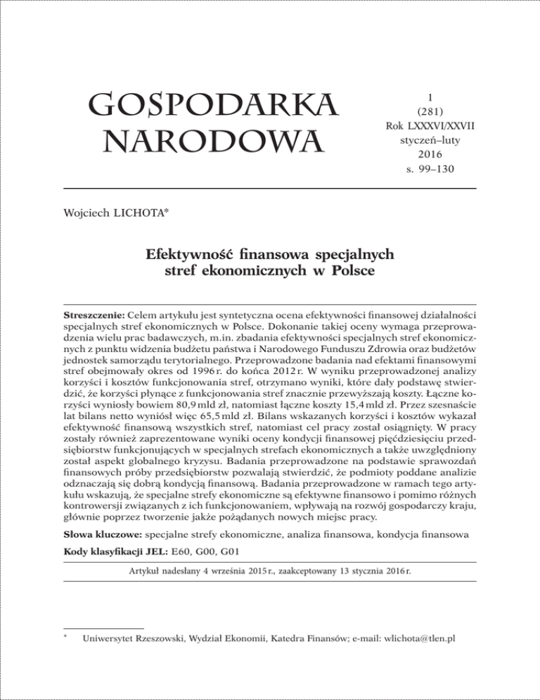 Wojciech Lichota, Efektywność finansowa specjalnych stref ekonomicznych w Polsce Gospodarka narodowa 99 1 (281) Rok LXXXVI/XXVII styczeń–luty 2016 s. 99–130 Wojciech LICHOTA* Efektywność finansowa specjalnych stref ekonomicznych w Polsce Streszczenie: Celem artykułu jest syntetyczna ocena efektywności finansowej działalności specjalnych stref ekonomicznych w Polsce. Dokonanie takiej oceny wymaga przeprowadzenia wielu prac badawczych, m.in. zbadania efektywności specjalnych stref ekonomicznych z punktu widzenia budżetu państwa i Narodowego Funduszu Zdrowia oraz budżetów jednostek samorządu terytorialnego. Przeprowadzone badania nad efektami finansowymi stref obejmowały okres od 1996 r. do końca 2012 r. W wyniku przeprowadzonej analizy korzyści i kosztów funkcjonowania stref, otrzymano wyniki, które dały podstawę stwierdzić, że korzyści płynące z funkcjonowania stref znacznie przewyższają koszty. Łączne korzyści wyniosły bowiem 80,9 mld zł, natomiast łączne koszty 15,4 mld zł. Przez szesnaście lat bilans netto wyniósł więc 65,5 mld zł. Bilans wskazanych korzyści i kosztów wykazał efektywność finansową wszystkich stref, natomiast cel pracy został osiągnięty. W pracy zostały również zaprezentowane wyniki oceny kondycji finansowej pięćdziesięciu przedsiębiorstw funkcjonujących w specjalnych strefach ekonomicznych a także uwzględniony został aspekt globalnego kryzysu. Badania przeprowadzone na podstawie sprawozdań finansowych próby przedsiębiorstw pozwalają stwierdzić, że podmioty poddane analizie odznaczają się dobrą kondycją finansową. Badania przeprowadzone w ramach tego artykułu wskazują, że specjalne strefy ekonomiczne są efektywne finansowo i pomimo różnych kontrowersji związanych z ich funkcjonowaniem, wpływają na rozwój gospodarczy kraju, głównie poprzez tworzenie jakże pożądanych nowych miejsc pracy. Słowa kluczowe: specjalne strefy ekonomiczne, analiza finansowa, kondycja finansowa Kody klasyfikacji JEL: E60, G00, G01 Artykuł nadesłany 4 września 2015 r., zaakceptowany 13 stycznia 2016 r. * Uniwersytet Rzeszowski, Wydział Ekonomii, Katedra Finansów; e-mail: [email protected] 100 GOSPODARKA NARODOWA nr 1/2016 Wstęp Zgodnie z definicją zawartą w ustawie o specjalnych strefach ekonomicznych, specjalna strefa ekonomiczna to wyodrębniona zgodnie z przepisami ustawy, niezamieszkała część terytorium Rzeczypospolitej Polskiej, na której terenie może być prowadzona działalność gospodarcza na zasadach określonych w ustawie1. W ujęciu prawnym specjalna strefa ekonomiczna jest enklawą na terytorium państwa, gdzie nie mają zastosowania przepisy regulujące krajową działalność gospodarczą. Jest to specyficzna konstrukcja prawno-polityczna, która tworzona jest punktowo na podstawie przyjętych regulacji prawnych, stwarzająca dla rozwoju firm atrakcyjniejsze warunki niż panujące na zewnątrz strefy [Polskie specjalne…, 2000, s. 13]. W literaturze, jako wyrażenia tożsame spotyka się pojęcia specjalnych stref ekonomicznych i stref uprzywilejowanych, co wynika z uniwersalizacji tych określeń. Strefy uprzywilejowane definiowane są jako obszary określone przestrzennie, na terenie których prowadzenie działalności gospodarczej zwolnione jest z opłat fiskalnych takich jak cła i podatki oraz może podlegać innym ulgowym przepisom formalnoprawnym i finansowym. Specjalne strefy ekonomiczne określane są również, jako instrument polityki rządu, służący do restrukturyzacji i uaktywnienia gospodarczego wybranych regionów kraju, zwłaszcza tam, gdzie stosowanie innych instrumentów okazało się niewystarczające [Wojtasik, 2010, s. 41]. Podstawą działalności stref są funkcjonujące w nich przedsiębiorstwa. To od nich zależą wielkość zatrudnienia, poniesionych nakładów inwestycyjnych, konkurencyjność regionu, co przekłada się na wpływy do budżetu państwa i budżetu jednostek samorządu terytorialnego w postaci określonych podatków, wpływy do Narodowego Funduszu Zdrowia, oszczędności związane z niewypłacaniem zasiłków dla bezrobotnych, czy też oszczędności związane z nieopłacaniem składek na ubezpieczenie społeczne bezrobotnych. Jednocześnie należy zauważyć, że strefy generują koszty. Są to koszty w postaci udzielonej pomocy publicznej przedsiębiorcom, koszty budowy i modernizacji infrastruktury strefowej, czy też utracone wpływy z tytułu podatku dochodowego od spółek zarządzających strefami. Nasuwa się zatem pytanie: Czy działalność specjalnych stref ekonomicznych w Polsce jest efektywna pod względem finansowym? W celu uzyskania odpowiedzi na powyższe pytanie, należy dokonać bilansu korzyści i kosztów związanych z funkcjonowaniem stref oraz znaleźć odpowiedź na pytania bardziej szczegółowe: Czy przedsiębiorstwa funkcjonujące w specjalnych strefach ekonomicznych mają dobrą kondycję finansową? Czy efektywność finansowa działalności specjalnych stref ekonomicznych zależy od kondycji finansowej przedsiębiorstw? Czy system ulg i przywilejów wpływa na przewagę konkurencyjną w stosunku do przedsiębiorstw spoza stref? Jakie korzyści społeczne wynikają z działalności 1 Ustawa z dnia 20 października 1994 r. o specjalnych strefach ekonomicznych (DzU 1994, nr 123, poz. 600). Wojciech Lichota, Efektywność finansowa specjalnych stref ekonomicznych w Polsce 101 specjalnych stref ekonomicznych? Ostatecznie, jak kryzys ekonomiczny wpływa na przedsiębiorstwa funkcjonujące w strefach? Odpowiadając na powyższe można zrozumieć sens tworzenia stref, ocenić ich wpływ na otoczenie i co najważniejsze zbadać efektywność finansową działalności specjalnych stref ekonomicznych. Uwarunkowania prawne, podstawowe efekty i kontrowersje związane z funkcjonowaniem specjalnych stref ekonomicznych2 Uwarunkowania prawne Proces transformacji systemowej w Polsce po 1989 r. spowodował, iż wiele polsk