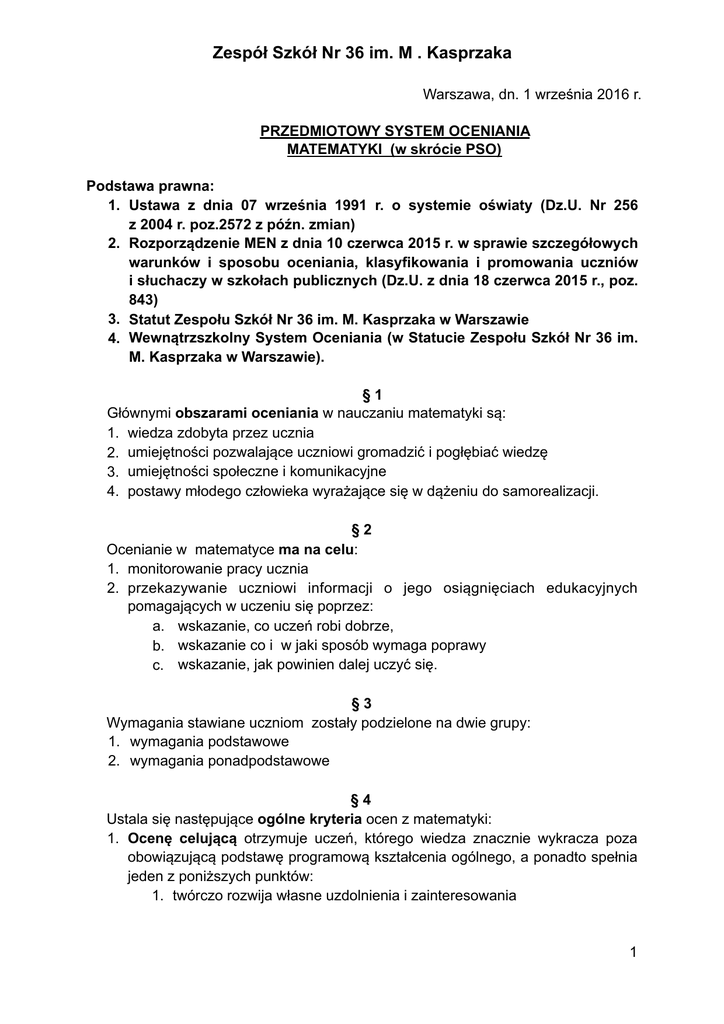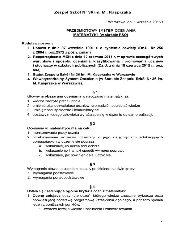 Zespół Szkół Nr 36 im. M . Kasprzaka Warszawa, dn. 1 września 2016 r. PRZEDMIOTOWY SYSTEM OCENIANIA MATEMATYKI (w skrócie PSO) Podstawa prawna: 1. Ustawa z dnia 07 września 1991 r. o systemie oświaty (Dz.U. Nr 256 z 2004 r. poz.2572 z późn. zmian) 2. Rozporządzenie MEN z dnia 10 czerwca 2015 r. w sprawie szczegółowych warunków i sposobu oceniania, klasyfikowania i promowania uczniów i słuchaczy w szkołach publicznych (Dz.U. z dnia 18 czerwca 2015 r., poz. 843) 3. Statut Zespołu Szkół Nr 36 im. M. Kasprzaka w Warszawie 4. Wewnątrzszkolny System Oceniania (w Statucie Zespołu Szkół Nr 36 im. M. Kasprzaka w Warszawie). §1 Głównymi obszarami oceniania w nauczaniu matematyki są: 1. wiedza zdobyta przez ucznia 2. umiejętności pozwalające uczniowi gromadzić i pogłębiać wiedzę 3. umiejętności społeczne i komunikacyjne 4. postawy młodego człowieka wyrażające się w dążeniu do samorealizacji. §2 Ocenianie w matematyce ma na celu: 1. monitorowanie pracy ucznia 2. przekazywanie uczniowi informacji o jego osiągnięciach edukacyjnych pomagających w uczeniu się poprzez: a. wskazanie, co uczeń robi dobrze, b. wskazanie co i w jaki sposób wymaga poprawy c. wskazanie, jak powinien dalej uczyć się. §3 Wymagania stawiane uczniom zostały podzielone na dwie grupy: 1. wymagania podstawowe 2. wymagania ponadpodstawowe §4 Ustala się następujące ogólne kryteria ocen z matematyki: 1. Ocenę celującą otrzymuje uczeń, którego wiedza znacznie wykracza poza obowiązującą podstawę programową kształcenia ogólnego, a ponadto spełnia jeden z poniższych punktów: 1. twórczo rozwija własne uzdolnienia i zainteresowania (1 Zespół Szkół Nr 36 im. M . Kasprzaka 2. uczestniczy aktywnie w zajęciach pozalekcyjnych koła przedmiotowego z matematyki 3. pomysłowo i oryginalnie rozwiązuje nietypowe zadania 4. bierze udział i osiąga sukcesy w konkursach i olimpiadach matematycznych. Ocenę celującą powinien uzyskać uczeń, który opanował w 100% wiedzę i zdobył wszystkie umiejętności zawarte w wymaganiach ponadpodstawowych. 2. Ocenę bardzo dobrą otrzymuje uczeń, który opanował pełny zakres treści zapisanych w podstawie programowej kształcenia ogólnego oraz potrafi: 1. sprawie wykonywać obliczenia 2. samodzielnie rozwiązywać zadania 3. wykazać się znajomością definicji i twierdzeń oraz umiejętnością ich stosowania w zadaniach 4. posługiwać się poprawnym językiem matematycznym 5. samodzielnie zdobywać wiedzę 6. przeprowadzać różne rozumowania dedukcyjne. Ocenę bardzo dobrą powinien otrzymać uczeń, który opanował wiedzę i zdobył umiejętności stanowiące 91% - 100% wymagań ponadpodstawowych. 3. Ocenę dobrą otrzymuje uczeń, który opanował wiadomości i umiejętności opisane w podstawie programowej kształcenia ogólnego, a także potrafi: 1. samodzielnie rozwiązywać zadania typowe 2. wykazywać się znajomością i rozumieniem poznanych pojęć i twierdzeń oraz algorytmów 3. posługiwać się językiem matematycznym, który może zawierać jedynie nieliczne błędy i potknięcia 4. sprawie wykonywać obliczenia 5. przeprowadzać proste rozumowanie dedukcyjne. Ocenę dobrą powinien otrzymać uczeń, który opanował wiedzę i zdobył umiejętności stanowiące 76% - 90 % wymagań ponadpodstawowych. 4. Ocenę dostateczną otrzymuje uczeń, który opanował wiadomości i umiejętności przewidziane podstawą programową kształcenia ogólnego, co pozwala mu na: 1. wykazanie się znajomością i rozumieniem podstawowych pojęć i algorytmów 2. stosowanie poznanych wzorów i twierdzeń w rozwiązywaniu typowych zadań 3. wykonywanie prostych obliczeń i przekształceń matematycznych. Ocenę dostateczną powinien otrzymać uczeń, który opanował wiedzę i zdobył umiejętności stanowiące 60% - 75% wymagań podstawowych. (2 Zespół Szkół Nr 36 im. M . Kasprzaka 5. Ocenę dopuszczającą otrzymuje uczeń, który opanował wiadomości i umiejętności przewidziane podstawa programową kształcenia ogólnego, co pozwala mu na: 1. samodzielne lub z niewielką pomocą nauczyciela wykonywanie ćwiczeń i zadań o niewielkim stopniu trudności 2. wykazanie się znajomością i rozumieniem najprostszych pojęć oraz algorytmów ( liczbami, 3. operowanie najprostszymi obiektami abstrakcyjnymi zbiorami, zmiennymi) i zbudowanymi z nich wyrażeniami. Ocenę dopuszczającą powinien otrzymać uczeń, który opanował wiedzę i zdobył umiejętności stanowiące 40% – 59% wymagań podstawowych. 6. Ocenę niedostateczną otrzymuje uczeń, który nie opanował podstawowych wiadomości i umiejętności opisanych w podstawie programowej kształcenia ogólnego oraz: 1. nie radzi sobie ze zrozumieniem najprostszych pojęć, algorytmów i twierdzeń 2. popełnia rażące błędy w obliczeniach 3. nie potrafi – nawet przy pomocy nauczyciela (który między innymi zadaje mu pomocnicze pytania) wykonywać najprostszych ćwiczeń i zadań 4. nie wykazuje najmniejszej chęci współpracy w celu uzupełnienia braków i nabycia podstawowej wiedzy oraz umiejętności. Ocenę nieostateczną powinien otrzymać uczeń, który opanował wiedzę i zdobył umiejętności stanowiące mniej niż 40% wymagań podstawowych. §5 Podczas nauczania matematyki stosuje się najczęściej następujące metody nauczania: 1. metoda podająca: wykład 2. metody aktywizujące: pogadanka, dyskusja, metoda problemowa, projekt, praca z tekstem matematycznym 1. praca z podręcznikiem 2. praca z wykorzystaniem encyklopedii, słowników, czasopism naukowych, roczników statystycznych, tablic matematycznych itp 3. praca z komputerem- w miarę możliwości organizacyjnych 3. rozwiązywanie ciągu zadań 1. praca z całą klasą: nauczyciel realizuje te same treści z całą klasą, wzajemne odpytywanie się 2. praca w grupach a. każda grupa dostaje do rozwiązania zadanie lub zadania b. metoda układanki „puzzle” c. metoda „drzewo decyzyjne” 
