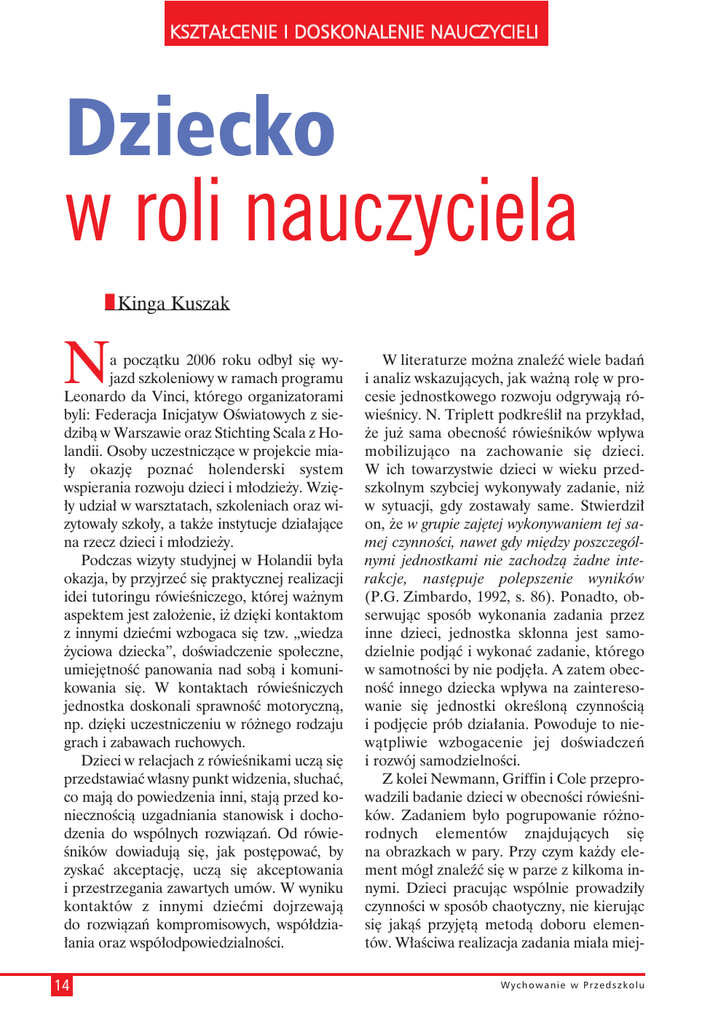 KSZTAŁCENIE I DOSKONALENIE NAUCZYCIELI Dziecko w roli nauczyciela n Kinga Kuszak N a początku 2006 roku odbył się wyjazd szkoleniowy w ramach programu Leonardo da Vinci, którego organizatorami byli: Federacja Inicjatyw Oświatowych z siedzibą w Warszawie oraz Stichting Scala z Holandii. Osoby uczestniczące w projekcie miały okazję poznać holenderski system wspierania rozwoju dzieci i młodzieży. Wzięły udział w warsztatach, szkoleniach oraz wizytowały szkoły, a także instytucje działające na rzecz dzieci i młodzieży. Podczas wizyty studyjnej w Holandii była okazja, by przyjrzeć się praktycznej realizacji idei tutoringu rówieśniczego, której ważnym aspektem jest założenie, iż dzięki kontaktom z innymi dziećmi wzbogaca się tzw. „wiedza życiowa dziecka”, doświadczenie społeczne, umiejętność panowania nad sobą i komunikowania się. W kontaktach rówieśniczych jednostka doskonali sprawność motoryczną, np. dzięki uczestniczeniu w różnego rodzaju grach i zabawach ruchowych. Dzieci w relacjach z rówieśnikami uczą się przedstawiać własny punkt widzenia, słuchać, co mają do powiedzenia inni, stają przed koniecznością uzgadniania stanowisk i dochodzenia do wspólnych rozwiązań. Od rówieśników dowiadują się, jak postępować, by zyskać akceptację, uczą się akceptowania i przestrzegania zawartych umów. W wyniku kontaktów z innymi dziećmi dojrzewają do rozwiązań kompromisowych, współdziałania oraz współodpowiedzialności. 14 W literaturze można znaleźć wiele badań i analiz wskazujących, jak ważną rolę w procesie jednostkowego rozwoju odgrywają rówieśnicy. N. Triplett podkreślił na przykład, że już sama obecność rówieśników wpływa mobilizująco na zachowanie się dzieci. W ich towarzystwie dzieci w wieku przedszkolnym szybciej wykonywały zadanie, niż w sytuacji, gdy zostawały same. Stwierdził on, że w grupie zajętej wykonywaniem tej samej czynności, nawet gdy między poszczególnymi jednostkami nie zachodzą żadne interakcje, następuje polepszenie wyników (P.G. Zimbardo, 1992, s. 86). Ponadto, obserwując sposób wykonania zadania przez inne dzieci, jednostka skłonna jest samodzielnie podjąć i wykonać zadanie, którego w samotności by nie podjęła. A zatem obecność innego dziecka wpływa na zainteresowanie się jednostki określoną czynnością i podjęcie prób działania. Powoduje to niewątpliwie wzbogacenie jej doświadczeń i rozwój samodzielności. Z kolei Newmann, Griffin i Cole przeprowadzili badanie dzieci w obecności rówieśników. Zadaniem było pogrupowanie różnorodnych elementów znajdujących się na obrazkach w pary. Przy czym każdy element mógł znaleźć się w parze z kilkoma innymi. Dzieci pracując wspólnie prowadziły czynności w sposób chaotyczny, nie kierując się jakąś przyjętą metodą doboru elementów. Właściwa realizacja zadania miała miejWychowanie w Przedszkolu sce dopiero jako metoda sprawdzająca, kiedy jednostki uzasadniały sposób wykonania zadania, a jednocześnie chciały sprawdzić, czy nie pozostały im do pogrupowania inne, dotychczas nie ujęte elementy (M. Garate, E. Gomez, 1997, s. 55–56). Wówczas okazywało się, że wspólna analiza doprowadza je do osiągnięcia właściwego rozwiązania. Wyniki kolejnych badań nad współpracą dzieci w wieku 4–5 lat przedstawiają J. Tudge, B. Rogoff (1995, s. 198). Wskazują na większy postęp w zakresie umiejętności poznawczych w sytuacji, gdy dzieci pracują w parach, niż wówczas, kiedy wykonują zadanie samodzielnie. Autorzy zwracają jednak uwagę na fakt, że korzyści płynące ze współpracy z rówieśnikiem w wieku przedszkolnym mają ograniczony zakres, gdyż dzieci dostarczają współpracownikowi zbyt małą ilość wyjaśnień werbalnych. Sytuacja ta uwarunkowana jest niskimi jeszcze umiejętnościami nawiązywania i prowadzenia komunikacji słownej. I chociaż dzieci czteroletnie mogą zająć pozycję tutora, potrafią bowiem nauczyć młodszych o rok kolegów określonych czynności, jednak dostarczają im niewiele wyjaśnień (J. Tudge, B. Rogoff, 1995, s. 198). Zdobywanie doświadczeń odbywa się tu drogą naśladowania starszego partnera przez młodszego. Niemniej jednak, dzieci młodsze podejmują i realizują zadania o wyższym stopniu trudności, niż podczas pracy indywidualnej, co z pewnością ma istotny wpływ na rozwój czynności wykonywanych samodzielnie. Aktywnie, czyli efektywnie W holenderskich szkołach idea tutoringu realizowana jest w ramach tzw. Nowego Wychowania w oparciu o konstruktywistyczny model kształcenia. Zadaniem nauczyciela jest tak organizować aktywność dzieci, aby mogły w jak najszerszym wymiarze uczyć się od siebie. Dlatego nauczyciel: l zamiast przekazywać wiedzę – pomaga ją dziecku odkryć, 1 l zamiast prowadzić dziecko – towarzyszy mu, l zamiast wydawać polecenia – jest opieku- nem, l zamiast ukazywać fakty – wskazuje pro- cesy, l zamiast zadawać pytania – zachęca dzieci do poszukiwania pytań i odpowiedzi na nie. Dziecko aktywne uczy się bardziej efektywnie. Podkreśla się więc, że zapamiętuje ono: 10% z tego, co przeczyta, 20% z tego, co usłyszy, 30% z tego, co zobaczy, 70%, wykorzystując własne uprzednie doświadczenia, 95% ucząc innych. Wchodząc w rolę nauczyciela, zdobywa i porządkuje wiedzę w sposób najbardziej efektywny, może też tą wiedzą dzielić się 1 z innymi . Podczas uczenia się we współpracy nauczyciel tak organizuje aktywność podopiecznych, by każdy z nich mógł czynnie włączyć się w działania grupy. Członek zespołu realizuje ściśle określone zadanie i aby osiągnąć zamierzony efekt, musi nawiązać współpracę z innymi dziećmi. Ogromną zaletą takiego sposobu pracy jest umiejętność wykorzystania faktu, że każda jednostka, znajdując się na typowym dla siebie poziomie rozwoju społeczno-emocjonalnego i poznawczego, może uczyć si