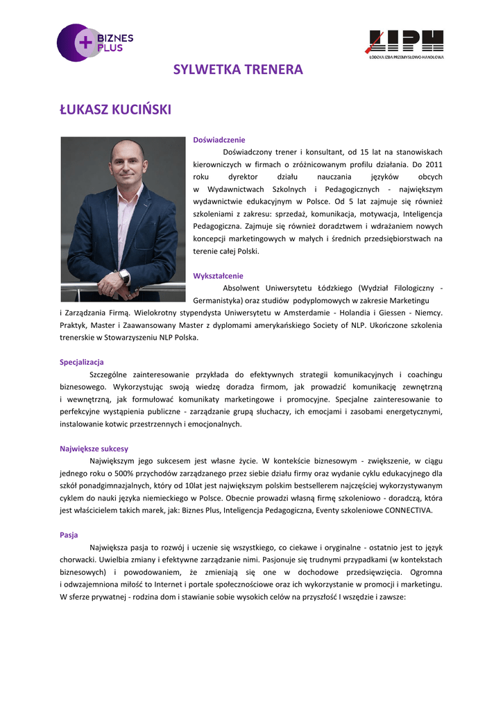 SYLWETKA TRENERA ŁUKASZ KUCIŃSKI Doświadczenie Doświadczony trener i konsultant, od 15 lat na stanowiskach kierowniczych w firmach o zróżnicowanym profilu działania. Do 2011 roku dyrektor działu nauczania języków obcych w Wydawnictwach Szkolnych i Pedagogicznych - największym wydawnictwie edukacyjnym w Polsce. Od 5 lat zajmuje się również szkoleniami z zakresu: sprzedaż, komunikacja, motywacja, Inteligencja Pedagogiczna. Zajmuje się również doradztwem i wdrażaniem nowych koncepcji marketingowych w małych i średnich przedsiębiorstwach na terenie całej Polski. Wykształcenie Absolwent Uniwersytetu Łódzkiego (Wydział Filologiczny Germanistyka) oraz studiów podyplomowych w zakresie Marketingu i Zarządzania Firmą. Wielokrotny stypendysta Uniwersytetu w Amsterdamie - Holandia i Giessen - Niemcy. Praktyk, Master i Zaawansowany Master z dyplomami amerykaoskiego Society of NLP. Ukooczone szkolenia trenerskie w Stowarzyszeniu NLP Polska. Specjalizacja Szczególne zainteresowanie przykłada do efektywnych strategii komunikacyjnych i coachingu biznesowego. Wykorzystując swoją wiedzę doradza firmom, jak prowadzid komunikację zewnętrzną i wewnętrzną, jak formułowad komunikaty marketingowe i promocyjne. Specjalne zainteresowanie to perfekcyjne wystąpienia publiczne - zarządzanie grupą słuchaczy, ich emocjami i zasobami energetycznymi, instalowanie kotwic przestrzennych i emocjonalnych. Największe sukcesy Największym jego sukcesem jest własne życie. W kontekście biznesowym - zwiększenie, w ciągu jednego roku o 500% przychodów zarządzanego przez siebie działu firmy oraz wydanie cyklu edukacyjnego dla szkół ponadgimnazjalnych, który od 10lat jest największym polskim bestsellerem najczęściej wykorzystywanym cyklem do nauki języka niemieckiego w Polsce. Obecnie prowadzi własną firmę szkoleniowo - doradczą, która jest właścicielem takich marek, jak: Biznes Plus, Inteligencja Pedagogiczna, Eventy szkoleniowe CONNECTIVA. Pasja Największa pasja to rozwój i uczenie się wszystkiego, co ciekawe i oryginalne - ostatnio jest to język chorwacki. Uwielbia zmiany i efektywne zarządzanie nimi. Pasjonuje się trudnymi przypadkami (w kontekstach biznesowych) i powodowaniem, że zmieniają się one w dochodowe przedsięwzięcia. Ogromna i odwzajemniona miłośd to Internet i portale społecznościowe oraz ich wykorzystanie w promocji i marketingu. W sferze prywatnej - rodzina dom i stawianie sobie wysokich celów na przyszłośd I wszędzie i zawsze: