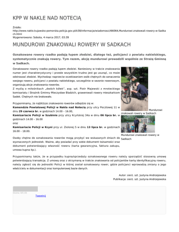 KPP W NAKLE NAD NOTECIĄ Źródło: http://www.naklo.kujawsko-pomorska.policja.gov.pl/k38/informacje/wiadomosci/66064,Mundurowi-znakowali-rowery-w-Sadka ch.html Wygenerowano: Sobota, 4 marca 2017, 03:39 MUNDUROWI ZNAKOWALI ROWERY W SADKACH Oznakowane rowery rzadko padają łupem złodziei, dlatego też, policjanci z powiatu nakielskiego, systematycznie znakują rowery. Tym razem, akcję mundurowi prowadzili wspólnie ze Strażą Gminną w Sadkach. Oznakowane rowery rzadko padają łupem złodziei. Naniesiony w trakcie znakowania numer jest charakterystyczny i przede wszystkim trudno jest go usunąć, co może odstraszać złodziei. Wychodząc naprzeciw oczekiwaniom osób chętnych do oznaczenia swojego roweru, policjanci z powiatu nakielskiego, szczególnie w sezonie rowerowym, organizują akcje znakowania rowerów. Z myślą o miłośnikach „dwóch kółek”, asp. szt. Piotr Majewski z mroteckiego komisariatu i Strażnik Gminny Mieczysław Bladzich, grawerowali rowery mieszkańcom Sadek. Chętnych nie brakowało. Przypominamy, że najbliższe znakowanie rowerów odbędzie się w: Komendzie Powiatowej Policji w Nakla nad Notecią przy ulicy Pocztowej 11 w dniu 29 czerwca br. w godzinach 14.00 – 16.00, Komisariacie Policji w Szubinie przy ulicy Kcyńskiej 34a w dniu 06 lipca br. w Mundurowi znakowali rowery w Sadkach godzinach 14.00 – 16.00 oraz Komisariacie Policji w Kcyni przy ul. Zielonej 5 w dniu 13 lipca br. w godzinach 16.00 – 18.00. Mundurowi znakowali rowery w Osoby chętne do oznakowania rowerów mogą przybyć we wskazanych dniach do Sadkach wyznaczonych jednostek. Ważne, aby posiadać przy sobie dokument tożsamości oraz dokument potwierdzający własność roweru (karta gwarancyjna, faktura zakupu, umowa kupna itp.). Przypominamy także, że w przypadku kupna/sprzedaży oznakowanego roweru należy sporządzić stosowną umowę potwierdzającą transakcję. Z umową oraz z otrzymaną w trakcie znakowania od policjantów kartą identyfikacyjną roweru, należy zgłosić się do jednostki Policji w której został oznakowany rower, gdzie policjanci wprowadzą zmiany o jego właścicielu w dokumentacji oraz komputerowej bazie danych. Autor: sierż. szt. Justyna Andrzejewska Publikacja: sierż. szt. Justyna Andrzejewska Ocena: 0/5 (0) Tweetnij