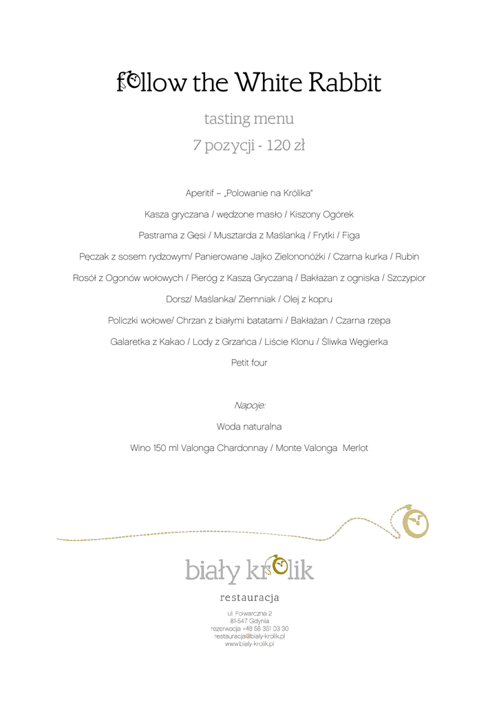 f#llow the White Rabbit tasting menu 7 pozycji - 120 zł Aperitif – „Polowanie na Królika” Kasza gryczana / wędzone masło / Kiszony Ogórek Pastrama z Gęsi / Musztarda z Maślanką / Frytki / Figa Pęczak z sosem rydzowym/ Panierowane Jajko Zielononóżki / Czarna kurka / Rubin Rosół z Ogonów wołowych / Pieróg z Kaszą Gryczaną / Bakłażan z ogniska / Szczypior Dorsz/ Maślanka/ Ziemniak / Olej z kopru Policzki wołowe/ Chrzan z białymi batatami / Bakłażan / Czarna rzepa Galaretka z Kakao / Lody z Grzańca / Liście Klonu / Śliwka Węgierka Petit four Napoje: Woda naturalna Wino 150 ml Valonga Chardonnay / Monte Valonga Merlot