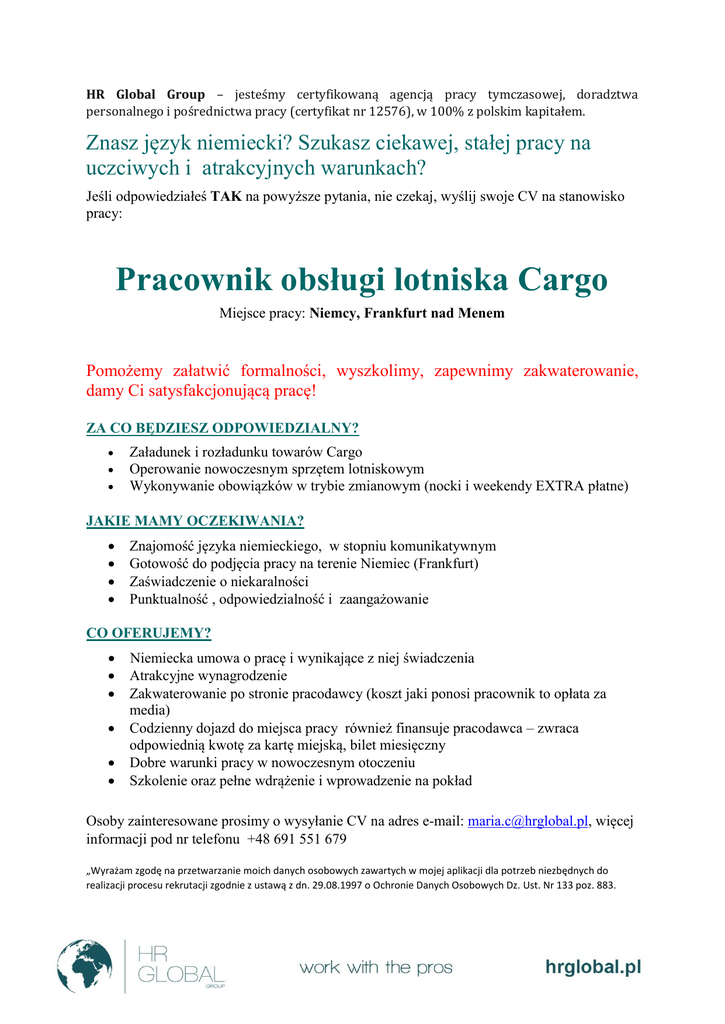 HR Global Group – jesteśmy certyfikowaną agencją pracy tymczasowej, doradztwa personalnego i pośrednictwa pracy (certyfikat nr 12576), w 100% z polskim kapitałem. Znasz język niemiecki? Szukasz ciekawej, stałej pracy na uczciwych i atrakcyjnych warunkach? Jeśli odpowiedziałeś TAK na powyższe pytania, nie czekaj, wyślij swoje CV na stanowisko pracy: Pracownik obsługi lotniska Cargo Miejsce pracy: Niemcy, Frankfurt nad Menem Pomożemy załatwić formalności, wyszkolimy, zapewnimy zakwaterowanie, damy Ci satysfakcjonującą pracę! ZA CO BĘDZIESZ ODPOWIEDZIALNY? Załadunek i rozładunku towarów Cargo Operowanie nowoczesnym sprzętem lotniskowym Wykonywanie obowiązków w trybie zmianowym (nocki i weekendy EXTRA płatne) JAKIE MAMY OCZEKIWANIA? Znajomość języka niemieckiego, w stopniu komunikatywnym Gotowość do podjęcia pracy na terenie Niemiec (Frankfurt) Zaświadczenie o niekaralności Punktualność , odpowiedzialność i zaangażowanie CO OFERUJEMY? Niemiecka umowa o pracę i wynikające z niej świadczenia Atrakcyjne wynagrodzenie Zakwaterowanie po stronie pracodawcy (koszt jaki ponosi pracownik to opłata za media) Codzienny dojazd do miejsca pracy również finansuje pracodawca – zwraca odpowiednią kwotę za kartę miejską, bilet miesięczny Dobre warunki pracy w nowoczesnym otoczeniu Szkolenie oraz pełne wdrążenie i wprowadzenie na pokład Osoby zainteresowane prosimy o wysyłanie CV na adres e-mail: [email protected], więcej informacji pod nr telefonu +48 691 551 679 „Wyrażam zgodę na przetwarzanie moich danych osobowych zawartych w mojej aplikacji dla potrzeb niezbędnych do realizacji procesu rekrutacji zgodnie z ustawą z dn. 29.08.1997 o Ochronie Danych Osobowych Dz. Ust. Nr 133 poz. 883.