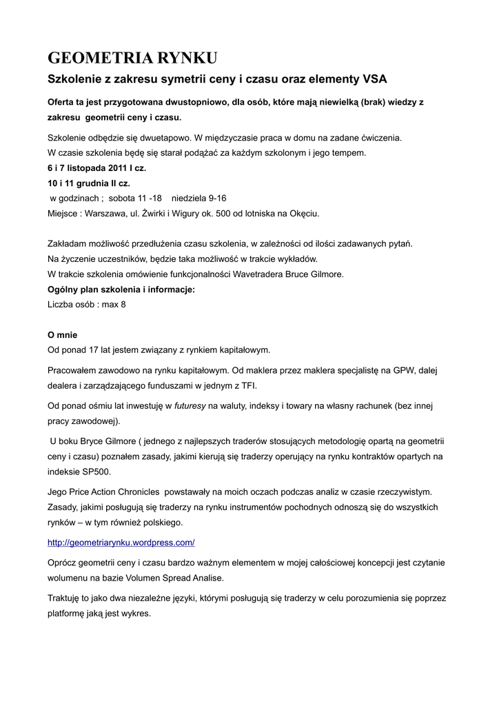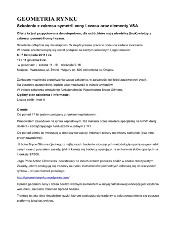 GEOMETRIA RYNKU Szkolenie z zakresu symetrii ceny i czasu oraz elementy VSA Oferta ta jest przygotowana dwustopniowo, dla osób, które mają niewielką (brak) wiedzy z zakresu geometrii ceny i czasu. Szkolenie odbędzie się dwuetapowo. W międzyczasie praca w domu na zadane ćwiczenia. W czasie szkolenia będę się starał podążać za każdym szkolonym i jego tempem. 6 i 7 listopada 2011 I cz. 10 i 11 grudnia II cz. w godzinach ; sobota 11 -18 niedziela 9-16 Miejsce : Warszawa, ul. Żwirki i Wigury ok. 500 od lotniska na Okęciu. Zakładam możliwość przedłużenia czasu szkolenia, w zależności od ilości zadawanych pytań. Na życzenie uczestników, będzie taka możliwość w trakcie wykładów. W trakcie szkolenia omówienie funkcjonalności Wavetradera Bruce Gilmore. Ogólny plan szkolenia i informacje: Liczba osób : max 8 O mnie Od ponad 17 lat jestem związany z rynkiem kapitałowym. Pracowałem zawodowo na rynku kapitałowym. Od maklera przez maklera specjalistę na GPW, dalej dealera i zarządzającego funduszami w jednym z TFI. Od ponad ośmiu lat inwestuję w futuresy na waluty, indeksy i towary na własny rachunek (bez innej pracy zawodowej). U boku Bryce Gilmore ( jednego z najlepszych traderów stosujących metodologię opartą na geometrii ceny i czasu) poznałem zasady, jakimi kierują się traderzy operujący na rynku kontraktów opartych na indeksie SP500. Jego Price Action Chronicles powstawały na moich oczach podczas analiz w czasie rzeczywistym. Zasady, jakimi posługują się traderzy na rynku instrumentów pochodnych odnoszą się do wszystkich rynków – w tym również polskiego. http://geometriarynku.wordpress.com/ Oprócz geometrii ceny i czasu bardzo ważnym elementem w mojej całościowej koncepcji jest czytanie wolumenu na bazie Volumen Spread Analise. Traktuję to jako dwa niezależne języki, którymi posługują się traderzy w celu porozumienia się poprzez platformę jaką jest wykres. Proszę się zapoznać z wpisami : wstęp do szkolenia http://geometriarynkuszkolenia.wordpress.com/category/wstep-do-szkolenia/ i moja metoda : http://geometriarynkuszkolenia.wordpress.com/category/moja-metoda/ Opinie po poprzednich szkoleniach można przejrzeć tu : http://geometriarynkuszkolenia.wordpress.com/category/opinie-po-szkoleniu/ To jedna z nich : Geometria Rynku to kompleksowe podejście do analizy technicznej rynków finansowych prezentowane przez Mietka Siudek. Zebrane przez Mietka metody analizy pomagają zrozumieć i wykorzystać procesy typowe dla współczesnych rynków finansowych. Wielu inwestorów stwierdza, że po 2009 roku rynki stały się znacznie trudniejsze niż wcześniej. Prezentowane przez autora podejście rozjaśnia obraz sytuacji. Działa jak swoisty system drogowskazów. Pozdrawiam, Robert Nejman Witam, chciałem przekazać moją opinię o szkoleniu u Mietka w dniach 24-25 września 2011r. Zanim przejdę do mojej opinii to kilka słów o innych szkoleniach, a kilka z nich za niemałe pieniądze zaliczyłem. Nie mogę napisać że poprzednie szkolenia nic mi nie dały bo to by była nie prawda. Ale podczas wielu szkoleń odnosiłem wrażenie że szkolący znają rynek z książek a nie z rzeczywistej gry. A u Mietka miłe zaskoczenie, olbrzymia znajomość rynku wynikająca z praktyki, codziennego traidingu. A to obecnie bardzo ważne, gdyż rynek nie porusza się wg książkowych zasad, rynek po prostu jest dynamiczny i czy chcemy czy nie to jest on coraz bardziej cwany a my małe leszcze musimy się do tego przyzwyczaić. Nie można nauczyć się pływać bez wejścia do głębokiej wody. A Mietek pływa w tej wodzie zwanej traidingiem świetnie i przekazuje nam swoją wiedzę. Uwagi praktyczne, jeśli ktoś chce uczestniczyć w tych szkoleniach to niech się dobrze przygotuje. Olbrzymia dawka wiedzy przekazana w krótkim czasie jest możliwa do jako takiego przyswojenia tylko dla osób ze sporą wiedzą, oczytaniem i pewną praktyką rynkową. To nie jest szkolenia typu opowiadam Wam jak zrobić pieniądze, nie nie, to jest przekazanie pełnej metodologii pracy na rynku day traidingu, przekazanie aktualnej wiedzy o rynku. A czy z tej wiedzy skorzystamy czy nie to zależy od nas samych. Najlepsze szkolenie w jakim uczestniczyłem, SUPER. Szkolenie oceniam jako bardzo dobre, wymagające sporej pracy samodzielnej ale dające praktyczną wiedzę. Polecam gorąco. pozdrawiam Krzysztof W. Plan szkolenia I Wstęp 1.Rynek elektroniczny , sterowany komputerami – jak do tego podejść ? 2.Parę słów o Flux – omówienie idei 3. Geometria rynku – co to jest ? 4. Liczby w oparciu o które pracujemy (rytm rynku) 5.Techniki projekcyjne (ret,alt,exp.rx,dx) – w skrócie (podstawy) II Układy geometryczne 1. Korekta 1:1 i 1:1 DD 2. Podejście do trendu 3. Poziomy wsparcia i oporu 4. Jak używać reguły korekty 1:1 ? 5. BUY setups ( 6 układów) 6. Sell setups ( 5 układów) 7. Setupy geometryczne 8. Układy harmoniczne XABCD i ABCD III Dzień giełdowy dla day traderów / Prepare work 1. 3 – dniowy swing 2. średnie 10 – dniowe odchylenie od open/close 3. Luki 4. Harmonogram sesji i jej punkty charakterystyczne 5. Typy dnia giełdowego III Czas ważniejszy niż cena 1. Analiza czasu 2. Geometria ceny i czasu a TFE IV. Wolumen prawdę Ci powie 1. Wprowadzenie do VSA (wolumen spread analise) – temat szeroki 2. Panika kupna, panika sprzedaży – chciwość i strach 3. Sygnały siły 4.Sygnały spadku 5. Klimat kupna / sprzedaży 6. Akumulacja / dystrybucja 7. Wyckoff spring - kampanie 8. Wolumen jako potwierdzenie układu geometrycznego (specyfika wybranych rynków) V. Podsumowanie Jak zdążymy …………………….. 1. Dual momentum 2. Trigery wejścia w rynek - vsa, PA, 123, …dywergencje … 3. Układ Hoffmana 4. Setupy Erica (przykłady) – geometria w służbie Floor Traders VI Dyskusja PROCEDURA Koszt to 2900 PLN od osoby (płatne 300 PLN zaliczka na konto (rezerwacja), pozostała część przed szkoleniem na konto