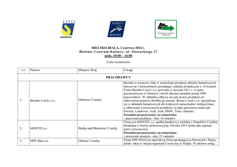 BIELSKO-BIAŁA, 2 czerwca 2016 r. Bielskie Centrum Kultury, ul. Słowackiego 27 godz. 10:00 – 14:00 Lista wystawców L.p. Nazwa Miejsce/ Kraj Uwagi PRACODAWCY 1. Brembo Czech s.r.o. Ostrawa/ Czechy 2. MONTIX a.s. Horka nad Moravou/ Czechy 3. MW-Dias a.s. Ostrwa/ Czechy Brembo to światowy lider w technologii produkcji układów hamulcowych obecny na 3 kontynentach, posiadający zakłady produkcyjne w 16 krajach. Firma Brembo Czech s.r.o. powstała w styczniu 2011 r. w parku przemysłowym w Ostrawie i chwili obecnej zatrudnia ponad 1000 pracowników. W zakładzie odbywa się cały proces produkcji od odlewnictwa poprzez obróbkę po montaŜ. Bremo Czech s.r.o. specjalizuje się w układach hamulcowych dla większych samochodów średniej klasy, a odbiorcami wytwarzanych produktów są takie prestiŜowe marki jak: Porsche, Landrover, Audi, Audi, BMW, Tesla i Daimler. Poszukiwani pracownicy na stanowiska: - pracownik produkcji - min. 10 wakatów Firma jest MONTIX, a.s. spółką handlową z siedzibą w Republice Czeskiej działającą w branŜy motoryzacyjnej. Od roku 2015 działa jako agencja pracy tymczasowej. Poszukiwani pracownicy na stanowiska: - pracownik montaŜu - min. 25 wakatów Firma MW-DIAS jest największą firmą sprzątającą na Morawach i Śląsku, działa takŜe w innych regionach Czech oraz w Pradze. W sektorze usług 4. HERN s.r.o. Námestovo/ Słowacja porządkowych na rynku czeskim działa od 1997 roku. Zatrudnia ponad 2000 pracowników. Poszukiwani pracownicy na stanowisko: - pracownik porządkowy w przemyśle – min. 15 wakatów Firma HERN, s.r.o. działająca w branŜy obróbki metali oraz inŜynierii maszyn, jest największy pracodawcą w regionie Orava. Specjalizuje się w produkcji detali oraz konstrukcji spawanych dla maszyn do robót ziemnych i drogowych, traktorów, kombajnów i innych maszyn. Poszukiwani pracownicy na stanowiska: - operator maszyn CNC – 2 wakaty - spawacz – 2 wakaty - frezer – 1 wakat - kierownik robót – 1 wakat Niemiecka agencja pracy tymczasowej. Poszukiwani pracownicy na stanowiska: 5. Renta Personaldienstleistungen GmbH 6. Diakonie Verein für Internationale Stuttgart/ Niemcy Jugendarbeit 7. StraŜ Miejska w Bielsku-Białej 8. Przedsiębiorstwo HotelarskoTurystyczne ODYS Sp. z o.o. Tresna Drezno/ Niemcy - pracownik produkcji, - operator CNC, - operator wozka widlowego, - magazynier, - spawacz, - tokarz, - stolarz Min. 50 wakatow. Diakonie to organizacja pomocy społecznej Kościoła Protestanckiego w Niemczech. Zapewnia pomoc potrzebującym opieki, osobom starszym i niepełnosprawnym, a takŜe osobom zmagającym się z uzaleŜnieniami. Poszukiwani pracownicy na stanowiska: - pielęgniarka – 10 wakatów, - opiekun osób starszych –30 wakatów. Bielsko-Biała/ Polska Informacje o naborze na stanowisko straŜnika miejskiego. Tresna/ Polska Firma działająca w branŜy hotelarsko-turysytcznej. Poszukiwani pracownicy na stanowiska: - specjalista sprzedaŜy i sportu – 1 wakat, - instruktor sportu – 1 wakat, 9. 10. Adecco Poland Medicare Services Sp. z o.o Sp. k. Bielsko – Biała/ Polska Kraków/ Polska - recepcjonistka – 1 wakat, - konserwator – 1 wakat, - kelner (sezonowa) – 3 wakat. Agencja zatrudnienia działająca od 2003 r. Poszukiwani pracownicy na stanowiska: - pracownicy produkcji (operator maszyn, magazynier, brygadzista, kierownik produkcji, pracownik utrzymania ruchu – elektryk, elektromechanik, automatyk, elektronik), - specjaliści lub kierownicy w następujących sektorach: marketing, sprzedaŜ, administracja, spedycja, logistyka, księgowość, inŜynieria, IT, - pracownicy biurowi ze znajomością języków obcych, - praca dorywcza (praca równieŜ dla uczniów/ studentów). MEDICARE SERVICES spółka z o.o. spółka komandytowa, świadczy usługi domowej opieki nad osobami starszymi, chorymi i niepełnosprawnymi. Poszukiwani pracownicy do pracy w Niemczech na stanowisko: - opiekun osób starszych – 50 wakatów. Agencja zatrudnienia działająca od 2004 r. 11. Manpower Group Sp. z o.o. Bielsko-Biała/ Polska 12. WORK FORCE Sp. z o.o. Opole/ Polska 13. PRUDENTIAL POLSKA Sp. z o.o. Bielsko-Biała/ Polska 14. Lidl Sp. z o.o. Sp. K. Polska 15. Jeronimo Martins Polska S.A. Polska Poszukiwani pracownicy na stanowiska: - pracownik produkcji – 30 wakatów, - perator wózka widłowego – 10 wakatów. Agencja zatrudnienia działająca od 2004 r. (praca w Polsce oraz Holandii) Poszukiwani pracownicy na stanowiska: - pakowacz – 20 wakatów, - operator wózka widłowego – 10 wakatów. Firma działająca w sektorze ubezpieczeń. Poszukiwani pracownicy na róŜne stanowiska: - konsultant ds. planowania finansowego – 10 wakatów, - lider sprzedaŜy zespołu – 3 wakaty. Sieć sklepów spoŜywczych. Poszukiwani pracownicy na stanowiska: - pracownik sklepu – 15 wakatow, - zastępca kierownika sklepu – 4 wakaty. Sieć sklepów spoŜywczych Biedronka. Poszukiwani pracownicy na stanowiska: 16. Zeitmann Spółka Jawna Kraków/ Polska 17. BRONOWSCY CZERNICHÓW Sp. z o.o. Sp. K. Czernichów/ Polska 18. Dae Dong System Poland Sp. z o.o. Cieszyn/ Polska 19. INVENIO Sp. z o.o. Bielsko-Biała/ Polska -sprzedawca – kasjer – 10 wakatow, - zastępca kierownika sklepu – 5 wakatów. Agencja zatrudnienia działająca w Polsce od 2013 r. (praca za granicą m.in. Niemczech). Poszukiwani pracownicy na stanowiska: - elektryk, hydraulik, spawacz – 60 wakatów, - stolarz, malarz – 40 wakatów. Piekarnia/ cukiernia oferuje wypieki z Czernichowa sporządzane według tradycyjnej receptury, kilkanaście sklepów firmowych znajduje się w Bielsku-Białej, Andrychowie, Chrzanowie, Czernichowie, Cieszynie. Poszukiwani pracownicy na stanowiska: Sprzedawca – 5 wakatów, Cukiernik – 2 wakatów, Piekarz – 2 wakatów. Daedong System Poland Sp. z o.o. został załoŜony we Wrocławiu w listopadzie 2007 r., a w Cieszynie funkcjonuje od stycznia 2008 r. ZałoŜycielem i jedynym udziałowcem jest koreańskie przedsiębiors