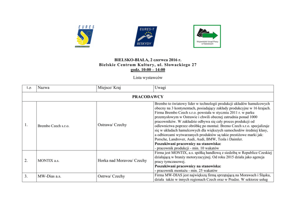 Lista wystawców 2016 - Wojewódzki Urząd Pracy w Katowicach
