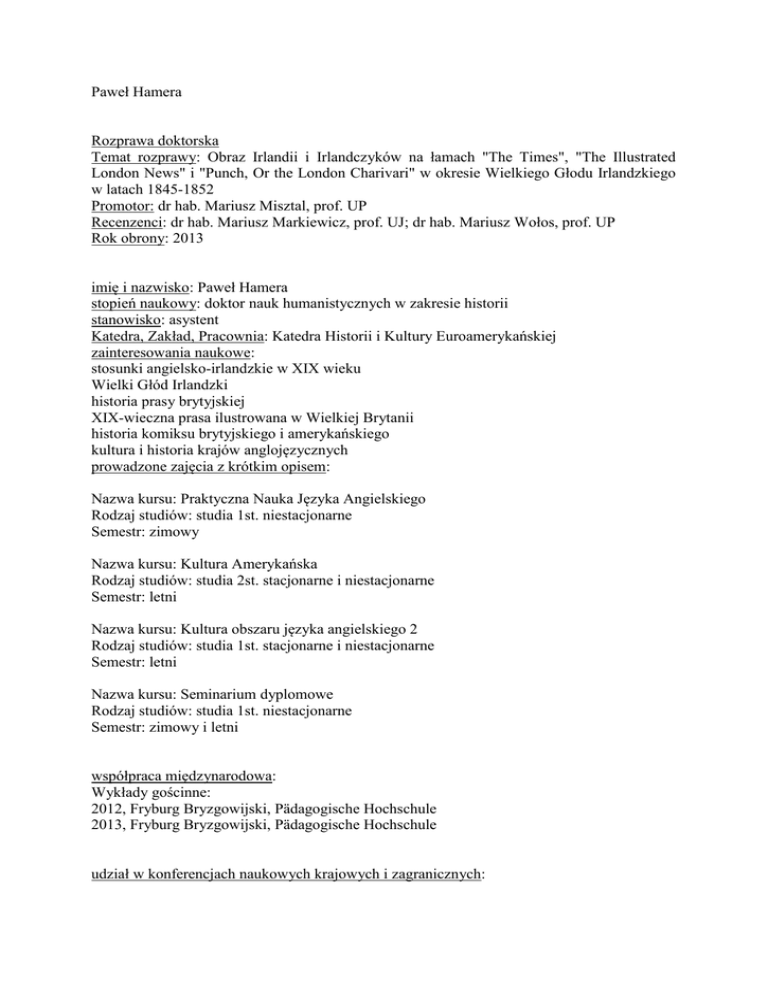 Paweł Hamera Rozprawa doktorska Temat rozprawy: Obraz Irlandii i Irlandczyków na łamach "The Times", "The Illustrated London News" i "Punch, Or the London Charivari" w okresie Wielkiego Głodu Irlandzkiego w latach 1845-1852 Promotor: dr hab. Mariusz Misztal, prof. UP Recenzenci: dr hab. Mariusz Markiewicz, prof. UJ; dr hab. Mariusz Wołos, prof. UP Rok obrony: 2013 imię i nazwisko: Paweł Hamera stopień naukowy: doktor nauk humanistycznych w zakresie historii stanowisko: asystent Katedra, Zakład, Pracownia: Katedra Historii i Kultury Euroamerykańskiej zainteresowania naukowe: stosunki angielsko-irlandzkie w XIX wieku Wielki Głód Irlandzki historia prasy brytyjskiej XIX-wieczna prasa ilustrowana w Wielkiej Brytanii historia komiksu brytyjskiego i amerykańskiego kultura i historia krajów anglojęzycznych prowadzone zajęcia z krótkim opisem: Nazwa kursu: Praktyczna Nauka Języka Angielskiego Rodzaj studiów: studia 1st. niestacjonarne Semestr: zimowy Nazwa kursu: Kultura Amerykańska Rodzaj studiów: studia 2st. stacjonarne i niestacjonarne Semestr: letni Nazwa kursu: Kultura obszaru języka angielskiego 2 Rodzaj studiów: studia 1st. stacjonarne i niestacjonarne Semestr: letni Nazwa kursu: Seminarium dyplomowe Rodzaj studiów: studia 1st. niestacjonarne Semestr: zimowy i letni współpraca międzynarodowa: Wykłady gościnne: 2012, Fryburg Bryzgowijski, Pädagogische Hochschule 2013, Fryburg Bryzgowijski, Pädagogische Hochschule udział w konferencjach naukowych krajowych i zagranicznych: 2009, Kraków—Technologie informacyjne w warsztacie nauczyciela REFERAT: Wykorzystanie internetowych filmów w nauczaniu języka angielskiego. 2009, Maniowe: Pamiętniki, dzienniki i relacje z XVIII-XX, jako źródła do badań historycznych. REFERAT: Portret XIX-wiecznej Irlandii w dziennikach z podróży Williama Makepeace'a Thackeray'a i Alexisa de Tocqueville'a. 2009, Kraków: 3rd International May Conference on English Studies REFERAT: American Comic Book Superheroes and the War Effort during the WWII. 2010, Poznań: Przestrzenie kultury komiksowej. Konferencja zorganizowana przez REFERAT: Miejsce XIX-wiecznych brytyjskich ilustracji w gazetach jako (pre)historia komiksu. 2010, Toruń: [Re]visions of History in Language and Fiction. REFERAT: (Po-)rewizjonistyczny obraz irlandzkiego wielkiego głodu w powieści graficznej „Ireland: A Graphic History”. 2011, Kraków: 4rd International May Conference on English Studies. REFERAT: The 1840s Irish State Trials and their Depiction in the Two English Illustrated Periodicals: “Punch, or the London Charivari” and “The Illustrated London News”. 2011, Łódź: Prze(d)sądy. O czytaniu kultury. REFERAT: Uprzedzenia Anglików epoki wiktoriańskiej wobec irlandzkich domostw na przykładzie opisu posiadłości Daniela O’Connella w listach komisarza „The Times”. 2013, Kraków: 5th International May Conference on English Studies. REFERAT: ‘Alas! The Irish peasant had tasted of famine and found that it was good’: ‘The Times’ and the Great Irish Famine kontakt: +48 12 662 6961; [email protected] Publikacje : 1. Rozwój sztuki komiksu w XIX-wiecznych brytyjskich periodykach satyrycznych. W: Kontekstowy MIKS: Od powieści graficznej do analiz kultury współczesnej. G. Gajewska, R. Wójcik (red.). Wydawnictwo Poznańskiego Towarzystwa Przyjaciół Nauk: Poznań 2011. Ilość stron: 12, s. 41-52. 2. Wykorzystanie internetowych filmów w nauczaniu języka angielskiego. W: Technologie informacyjne w warsztacie nauczyciela. J. Migdałek, W. Folta (red.). Wydawnictwo Uniwersytetu Pedagogicznego: Kraków 2010. Ilość stron: 8, s. 321-328. 3. W obszarze wybranych problemów komiksologii: definicja gatunku i jej historyczny kontekst. W: Komiks a Komiksologia. Ku rozpoznaniu i charakterystyce wzajemnych relacji między gatunkiem a jego teorią. Antologia referatów 10. Sympozjum Komiksologicznego. K. Skrzypczyk (red.). Stowarzyszenie Twórców „Contur”: Łódź 2010. Ilość stron: 3, s. 47-49. 4. The Picture of Ireland in the »Penny Magazine«. W: Miscellaneous Studies in English. P. Kaptur (red.). NKJO w Ostrowcu Świętokrzyskim 2010. Ilość stron: 19, s. 9-28. 5. American Comic Book Superheroes and the War Effort during the WWII. W: Current Issues in English Studies. M. Misztal, M. Trawiński (red.). Wydawnictwo Uniwersytetu Pedagogicznego: Kraków 2009. Ilość stron: 8, s. 313-321. 6. The Roots of Comic Book Superheroes. W: Miscellaneous Studies in English. P. Kaptur (red.). NKJO w Ostrowicu Świętokrzyskim 2009. Ilość stron: 14, s. 73-86. 7. The Outline of the Irish Famine Historiography. W: The Linguistic Academy Journal of Interdisciplinary Language Studies. J. Lewkowicz, K. Fordoński (red.). Lingwistyczna Szkoła w Warszawie 2011. Ilość stron: 10, s. 65-74. 8. Piloci – Ikony Pop-Kultury. W: publikacja Muzeum Lotnictwa Polskiego w Krakowie: VI Małopolski Piknik Lotniczy. Kraków 2009. Ilość stron: 1, s. 20. 9. Portret XIX-wiecznej Irlandii w dziennikach z podróży Williama Makepeace'a Thackeray'a i Alexisa de Tocqueville'a. W: K. Karolczak (red.) Pamiętniki, dzienniki i relacje z XVIII-XX, jako źródła do badań historycznych. Wydawnictwo Uniwersytetu Pedagogicznego: Kraków 2011. Ilość stron: 13, s. 137-149. 10. The 1840s Irish State Trials and their Depiction in the Two English Illustrated Periodicals: “Punch, or the London Charivari” and “The Illustrated London News”. W: Annales Universitatis Paedagogicae Cracoviensis: Studia Anglica III. M. Misztal, A. K. Kuropatnicki (red.). Wydawnictwo Naukowe UP: Kraków 2013. Ilość stron: 15, s. 127141. Data aktualizacji 07.11.2013