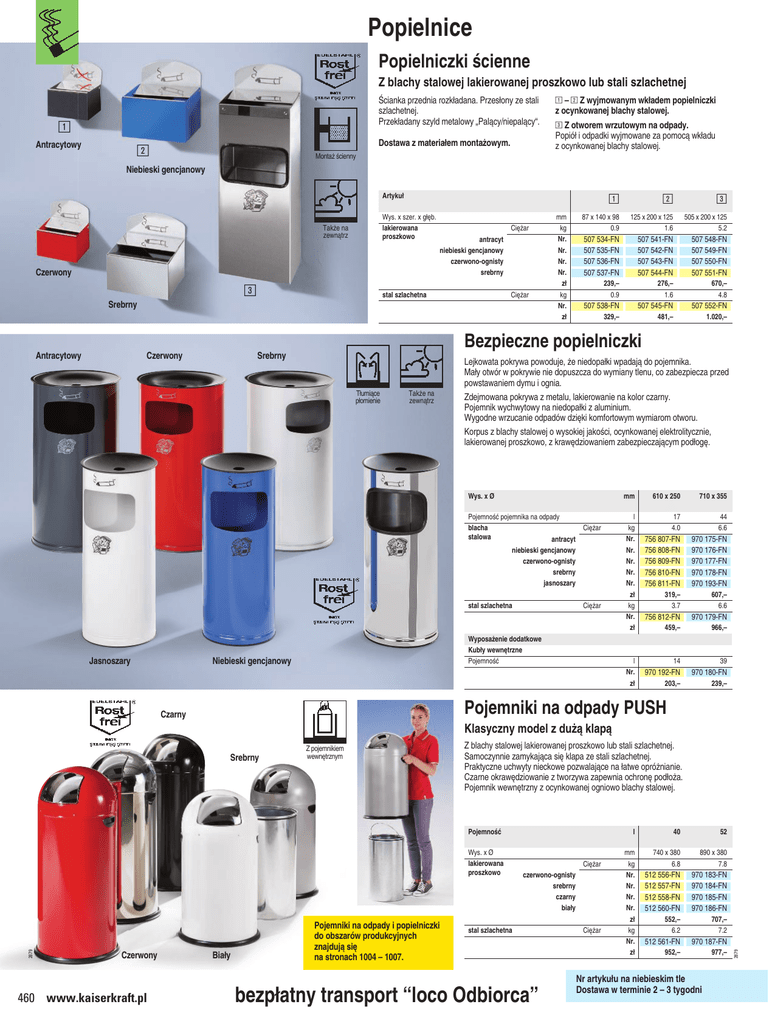 Popielnice Popielniczki ścienne Z blachy stalowej lakierowanej proszkowo lub stali szlachetnej Ścianka przednia rozkładana. Przesłony ze stali szlachetnej. Przekładany szyld metalowy „Palący/niepalący“. 1 Antracytowy Dostawa z materiałem montażowym. 2 Montaż ścienny 1 – 2 Z wyjmowanym wkładem popielniczki z ocynkowanej blachy stalowej. 3 Z otworem wrzutowym na odpady. Popiół i odpadki wyjmowane za pomocą wkładu z ocynkowanej blachy stalowej. Niebieski gencjanowy Artykuł Wys. x szer. x głęb. lakierowana proszkowo Także na zewnątrz Czerwony 3 stal szlachetna Srebrny Czerwony Ciężar 1 2 3 87 x 140 x 98 0.9 125 x 200 x 125 1.6 505 x 200 x 125 5.2 507 534-FN 507 535-FN 507 536-FN 507 537-FN 507 541-FN 507 542-FN 507 543-FN 507 544-FN 507 548-FN 507 549-FN 507 550-FN 507 551-FN 239,– 0.9 276,– 1.6 670,– 4.8 507 538-FN 507 545-FN 507 552-FN 329,– 481,– 1.020,– Bezpieczne popielniczki Srebrny Tłumiące płomienie Także na zewnątrz Lejkowata pokrywa powoduje, że niedopałki wpadają do pojemnika. Mały otwór w pokrywie nie dopuszcza do wymiany tlenu, co zabezpiecza przed powstawaniem dymu i ognia. Zdejmowana pokrywa z metalu, lakierowanie na kolor czarny. Pojemnik wychwytowy na niedopałki z aluminium. Wygodne wrzucanie odpadów dzięki komfortowym wymiarom otworu. Korpus z blachy stalowej o wysokiej jakości, ocynkowanej elektrolitycznie, lakierowanej proszkowo, z krawędziowaniem zabezpieczającym podłogę. Wys. x Ø Pojemność pojemnika na odpady blacha Ciężar stalowa antracyt niebieski gencjanowy czerwono-ognisty srebrny jasnoszary stal szlachetna Jasnoszary Ciężar Wyposażenie dodatkowe Kubły wewnętrzne Pojemność Niebieski gencjanowy l kg Nr. Nr. Nr. Nr. Nr. zł kg Nr. zł 17 4.0 44 6.6 756 807-FN 756 808-FN 756 809-FN 756 810-FN 756 811-FN 970 175-FN 970 176-FN 970 177-FN 970 178-FN 970 193-FN 319,– 3.7 607,– 6.6 756 812-FN 970 179-FN 459,– 966,– l Nr. zł Z pojemnikiem wewnętrznym 14 39 970 192-FN 970 180-FN 203,– 239,– Z blachy stalowej lakierowanej proszkowo lub stali szlachetnej. Samoczynnie zamykająca się klapa ze stali szlachetnej. Praktyczne uchwyty nieckowe pozwalające na łatwe opróżnianie. Czarne okrawędziowanie z tworzywa zapewnia ochronę podłoża. Pojemnik wewnętrzny z ocynkowanej ogniowo blachy stalowej. Pojemność Wys. x Ø lakierowana proszkowo 2879 710 x 355 Klasyczny model z dużą klapą Srebrny 460 www.kaiserkraft.pl 610 x 250 Pojemniki na odpady PUSH Czarny Czerwony mm Biały Pojemniki na odpady i popielniczki do obszarów produkcyjnych znajdują się na stronach 1004 – 1007. Ciężar czerwono-ognisty srebrny czarny biały stal szlachetna bezpłatny transport “loco Odbiorca” Ciężar l 40 52 mm kg Nr. Nr. Nr. Nr. zł kg Nr. zł 740 x 380 6.8 890 x 380 7.8 512 556-FN 512 557-FN 512 558-FN 512 560-FN 970 183-FN 970 184-FN 970 185-FN 970 186-FN 552,– 6.2 707,– 7.2 512 561-FN 970 187-FN 952,– 977,– Nr artykułu na niebieskim tle Dostawa w terminie 2 – 3 tygodni 2879 Antracytowy Ciężar antracyt niebieski gencjanowy czerwono-ognisty srebrny mm kg Nr. Nr. Nr. Nr. zł kg Nr. zł