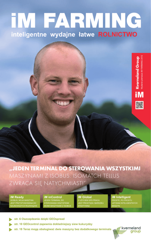 Wydanie pierwsze iM FARMING 2012 Kverneland Group iM „JEDEN TERMINAL DO STEROWANIA WSZYSTKIMI MASZYNAMI Z ISOBUS. ISOMATCH TELLUS ZWRACA SIĘ NATYCHMIAST!” iM Ready ISOBUS, MOJA MASZYNA JEST PRZYSTOSOWANA DO NAJNOWSZYCH ROZWIĄZAŃ iM inControl JEDEN TERMINAL DO STEROWANIA WSZYSTKIMI MOIMI MASZYNAMI Z ISOBUS iM Global Z UŻYCIEM GPS PRACA JEST PROSTSZA I BARDZIEJ EFEKTYWNA str. 6 Oszczędzanie dzięki GEOspread str. 10 GEOcontrol zapewnia dokładniejszy siew kukurydzy str. 18 Teraz mogę obsługiwać dwie maszyny bez dodatkowego terminala iM Intelligent PROSTE, PO PROSTU UŻYWAM INTELIGENTNYCH MASZYN TECHNOLOGIA STAJE SIĘ RZECZYWISTOŚCIĄ kverneland group Kverneland Group to wiodąca na rynku, międzynarodowa firma projektująca, produkująca i dystrybuująca maszyny z branży rolniczej. Dzięki skupianiu się na innowacjach mamy możliwość zaoferowania atrakcyjny, unikalny i szeroki wachlarz produktów o wysokiej jakości. Kverneland Group oferuje obszerny pakiet efektywnych i wydajnych systemów i rozwiązań dla profesjonalnego rolnictwa. Oferta obejmuje maszyny do uprawy i przygotowywania gleby, siewniki, maszyny do zbioru zielonek i przygotowania pasz, prasy do belowania, owijarki, rozsiewacze nawozów, opryskiwacze oraz elektroniczne rozwiązania do ciągników rolniczych i innych maszyn. Vicon i Kverneland to dobrze znane marki w branży rolniczej. Każda z naszych niezawodnych maszyn spełnia wymagania zorientowanych na przyszłość rolników. Maszyny wysokiej jakości z najnowocześniejszymi technologiami. Dzięki stałemu rozwojowi i oferowaniu ponad 50 modeli maszyn z ISOBUS, Kverneland Group przedstawia siebie jako firmę dobrze zorientowaną w technologii ISOBUS dla osprzętu rolniczego. Nasza nowa koncepcja komunikacji, ImFarming, opisuje i przedstawia naszą ofertę maszyn w technologii ISOBUS i rozwiązań elektronicznego sterowania maszynami. Wszystko z zamiarem zaoferowania wglądu w korzyści i wydajność naszej kompleksowej oferty, przystosowanej do twoich wymagań. Kverneland Group Polska Sp. z o.o. 87-100 Toruń, ul. Kręta 87 Polska str. | Ułatwienie życia rolnikom - tego właśnie możesz oczekiwać od Kverneland Group zarówno teraz jak i w przyszłości. To właśnie rozumiemy przez ‘iM FARMING’. http://pl.kvernelandgroup.com 04 ISOBUS był tylko początkiem 05 Odpowiednie rozwiązanie dla każdego rolnika 06 Inteligentne maszyny dostarczają nieskończonych możliwości Oszczędności dzięki GEOspread 09 Wysiew z dokładnością do jednego cala 10 GEOcontrol przejmuje sterowanie na uwrociach i polach o nie regularnym kształcie Precyzyjne opryski dzięki automatycznemu wyłączaniu sekcji BARDZIEJ EFEKTYWNE ZUŻYCIE ŚRODKÓW CHEMICZNYCH CHRONIĄCYCH UPRAWY 16 Od ISOBUS do IsoMatch GEOcontrol 17 IsoMatch GEOcontrol przynosi czyste korzyści 19 21 22 Pełne przekonanie do technologii ISOBUS Inteligentne rozsiewacze gotowe na nadchodzącą przyszłość Wszystko co chciałbyś wiedzieć o RTK-GPS 24 Zrelaksuj się i pozwól maszynom wykonywać pracę 26 Wygoda dzięki ISOBUS i Focus 27 Akcesoria uczynią z twojego IsoMatch Tellus bardziej kompleksowe narzędzie KVERNELAND GROUP JAKO DOSTAWCA INNOWACYJNYCH MASZYN wyznacza kierunek w dziedzinie elektronicznych rozwiązań dla maszyn opartych na protokole ISOBUS. KVERNELAND GROUP JUŻ DZISIAJ W SWOJEJ OFERCIE POSIADA PONAD 50 PODSTAWOWYCH MODELI MASZYN DOSTOSOWANYCH DO PROTOKOŁU ISOBUS. A BĘDZIE ICH JESZCZE WIĘCEJ! Wydanie pierwsze iM FARMING 2012 12 Kverneland Group 07 DLA kverneland group mechatronics iM Nasz departament ds. wiedzy o technice systemów elektronicznych sterowania i kontroli, Kverneland Group Mechatronics daje Kverneland Group silną przewagę nad konkurencją. Naszym głównym priorytetem jest utrzymanie już uzyskanej przewagi i zapewnienie maksimum korzyści dla naszych klientów oraz dystrybutorów. komunikacji: iM FARMING, która opisuje i prezentuje naszą ofertę odnośnie maszyn z ISOBUS i rozwiązań elektronicznego sterowania. Czasy zmieniają się szybko i równie szybko zmieniają się zapotrzebowania naszych klientów. Jak będzie wyglądać Rolnictwo Przyszłości? Maszyny będą stawać się coraz większe i coraz bardziej zaawansowane. Rolnicy szukają wydajnych maszyn, w związku z tym widzimy rosnące zapotrzebowanie na systemy Elektronicznego Sterowania, nazwijmy to Inteligentnymi Rozwiązaniami Rolnictwa. Jesteśmy dumni mogąc zaprezentować w tej broszurze naszą nową koncepcję Jesteśmy przekonani, że nasza oferta odnośnie maszyn z systemem ISOBUS oraz elektronicznymi rozwiązaniami dla precyzyjnego rolnictwa odegrają kluczową rolę w skutecznym i przyjaznym dla środowiska rolnictwie. W przyszłości, życzę przyjemnej lektury z tą broszurą. Wszystko z zamiarem zaoferowania wglądu w korzyści i wydajność naszej kompleksowej oferty. Kverneland Group posiada długą tradycję w utrzymywaniu bliskiej współpracy z rolnikami w celu zidentyfikowania potrzeb w efektywnych i wydajnych dla rolnictwa rozwiązaniach. Razem z nimi ciągle dążymy do rozwijania Rolnictwa Przyszłości. Ingvald Løyning Dyrektor Generalny i Prezes str. | JAKO ROLNIK OD SWOICH MASZYN WYMAGASZ JAK NAJWIĘCEJ. MUSZĄ BYĆ DOSTOSOWANE DO TWOJEJ WIZJI I PROWADZIĆ DO BARDZIEJ EFEKTYWNEJ PRACY. KVERNELAND GROUP POMOŻE CI WYBRAĆ ROZWIĄZANIA ODPOWIEDNIE DO TWOICH WYMAGAŃ W ROLNICTWIE. DLA KVERNELAND GROUP MECHATRONICS ISOBUS BYŁO TYLKO POCZĄTKIEM Innowacyjność jest rdzeniem Kverneland Group Mechatronics - centrum wiedzy elektronicznego sterowania maszynami rolniczymi należącego do Kverneland Group. Dzięki profesjonalnemu zespołowi, Kverneland Group Mechatronics jest światowym liderem w optymalizacji maszyn rolniczych przy pomocy rozwiązań software’owych, hardware’owych i mechatronicznych. „Siła Kverneland Group leży w naszej mieszance technicznych specjalizacji i rolniczej wiedzy” mówi Ton van der Voort van der Kley, Dyrektor Zarządzający w Kverneland 