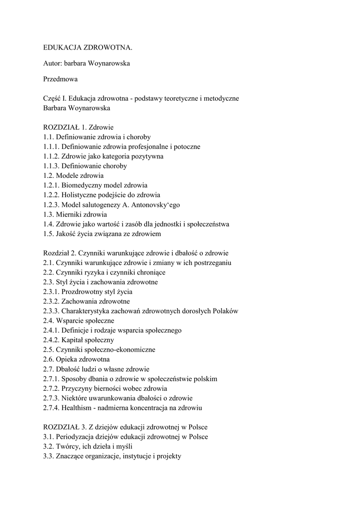 EDUKACJA ZDROWOTNA. Autor: barbara Woynarowska Przedmowa Część I. Edukacja zdrowotna - podstawy teoretyczne i metodyczne Barbara Woynarowska ROZDZIAŁ 1. Zdrowie 1.1. Definiowanie zdrowia i choroby 1.1.1. Definiowanie zdrowia profesjonalne i potoczne 1.1.2. Zdrowie jako kategoria pozytywna 1.1.3. Definiowanie choroby 1.2. Modele zdrowia 1.2.1. Biomedyczny model zdrowia 1.2.2. Holistyczne podejście do zdrowia 1.2.3. Model salutogenezy A. Antonovsky‘ego 1.3. Mierniki zdrowia 1.4. Zdrowie jako wartość i zasób dla jednostki i społeczeństwa 1.5. Jakość życia związana ze zdrowiem Rozdział 2. Czynniki warunkujące zdrowie i dbałość o zdrowie 2.1. Czynniki warunkujące zdrowie i zmiany w ich postrzeganiu 2.2. Czynniki ryzyka i czynniki chroniące 2.3. Styl życia i zachowania zdrowotne 2.3.1. Prozdrowotny styl życia 2.3.2. Zachowania zdrowotne 2.3.3. Charakterystyka zachowań zdrowotnych dorosłych Polaków 2.4. Wsparcie społeczne 2.4.1. Definicje i rodzaje wsparcia społecznego 2.4.2. Kapitał społeczny 2.5. Czynniki społeczno-ekonomiczne 2.6. Opieka zdrowotna 2.7. Dbałość ludzi o własne zdrowie 2.7.1. Sposoby dbania o zdrowie w społeczeństwie polskim 2.7.2. Przyczyny bierności wobec zdrowia 2.7.3. Niektóre uwarunkowania dbałości o zdrowie 2.7.4. Healthism - nadmierna koncentracja na zdrowiu ROZDZIAŁ 3. Z dziejów edukacji zdrowotnej w Polsce 3.1. Periodyzacja dziejów edukacji zdrowotnej w Polsce 3.2. Twórcy, ich dzieła i myśli 3.3. Znaczące organizacje, instytucje i projekty 3.4. Czasopisma naukowe i fachowe ROZDZIAŁ 4. Koncepcje i podstawy teoretyczne edukacji zdrowotnej 4.1. Terminologia i definicje 4.1.1. Nazwy i ich ewolucja 4.1.2. Definicje 4.1.3. Podstawowe pojęcia 4.2. Cele i oczekiwane efekty 4.3. Koncepcje i modele 4.4. Teorie wykorzystywane w edukacji zdrowotnej 4.5. Etyczne aspekty edukacji zdrowotnej ROZDZIAŁ 5. Edukacja zdrowotna a terapia i profilaktyka chorób oraz promocja zdrowia 5.1. Rola edukacji zdrowotnej w terapii chorób 5.2. Edukacja zdrowotna a profilaktyka 5.3. Promocja zdrowia 5.3.1. Geneza promocji zdrowia 5.3.2. Definicje 5.3.3. Strategia działania 5.3.4. Podejścia i metody działań 5.3.5. Modele promocji zdrowia 5.3.6. Edukacja zdrowotna jako kluczowy komponent promocji zdrowia 5.4. Profilaktyka a promocja zdrowia ROZDZIAŁ 6. Metodyka edukacji zdrowotnej 6.1. Planowanie i ewaluacja w edukacji zdrowotnej 6.1.1. Etapy planowania programu edukacji zdrowotnej 6.1.2. Zasady układania scenariusza zajęć 6.1.3. Ewaluacja w edukacji zdrowotnej 6.2. Tworzenie warunków do uczenia się 6.2.1. Komunikowanie jako podstawa uczenia się - nauczania 6.2.2. Rola i kompetencje osób prowadzących edukację zdrowotną 6.2.3. Warunki, organizacja i klimat sprzyjające dobremu komunikowaniu i uczeniu się 6.3. Metody wspomagania uczenia się 6.3.1. Rodzaje metod i technik uczenia się - nauczania 6.3.2. Zasady doboru metod i technik uczenia się - nauczania 6.3.3. Akcje i konkursy w edukacji zdrowotnej 6.3.4. Charakterystyka wybranych metod i technik 6.4. Środki dydaktyczne w edukacji zdrowotnej 6.4.1. Środki dydaktyczne stosowane w edukacji zdrowotnej w ostatnich dekadach 6.4.2. Korzyści i ograniczenia w korzystaniu z Internetu ROZDZIAŁ 7. Współpraca z mass mediami w edukacji zdrowotnej 7.1. Mass media jako źródła informacji o zdrowiu 7.2. Zasady skutecznego wykorzystywania mass mediów w edukacji zdrowotnej 7.3. Współpraca z mass mediami 7.4. Marketing społeczny i kampanie społeczne w promocji zdrowia i edukacji zdrowotnej ROZDZIAŁ 8. Edukacja zdrowotna w różnych siedliskach 8.1. Edukacja zdrowotna w rodzinie 8.1.1. Edukacja zdrowotna dzieci i młodzieży 8.1.2. Potrzeby w zakresie promocji zdrowia i edukacji zdrowotnej starszych członków rodziny 8.2. Edukacja zdrowotna w przedszkolu 8.3. Edukacja zdrowotna w szkole 8.3.1. Dzieje edukacji zdrowotnej w szkole w Polsce w ostatnim półwieczu 8.3.2. Aktualna sytuacja w szkolnej edukacji zdrowotnej w Polsce 8.3.3. Nowe rozwiązania w szkolnej edukacji zdrowotnej w niektórych krajach Europy 8.3.4. Szkoła promująca zdrowie 8.4. Edukacja zdrowotna w zakładach opieki zdrowotnej 8.4.1. Edukacja zdrowotna w praktyce lekarza podstawowej opieki zdrowotnej - lekarza rodzinnego 8.4.2. Zadania pielęgniarki rodzinnej w edukacji zdrowotnej 8.4.3. Zadania pielęgniarki i higienistki szkolnej w edukacji zdrowotnej 8.4.4. Edukacja osób przewlekle chorych i niepełnosprawnych 8.4.5. Szpital promujący zdrowie CZĘŚĆ II. Wybrane zagadnienia edukacji zdrowotnej dzieci i młodzieży w wieku szkolnym pod redakcją Barbary Woynarowskiej Wprowadzenie (Barbara Woynarowska) ROZDZIAŁ 1. Dbałość o ciało (Barbara Woynarowska) 1.1.Postrzeganie i dbałość o ciało we współczesnym świecie 1.2. Uczenie się dbania o ciało w dzieciństwie i młodości 1.3. Wybrane zagadnienia i propozycje zajęć 1.3.1. Dbałość o zęby 1.3.2. Samokontrola masy ciała 1.3.3. Pielęgnacja i samobadanie piersi 1.3.4. Samobadanie jąder 1.3.5. Ochrona przed nadmiernym nasłonecznieniem ROZDZIAŁ 2. Zdrowe żywienie i aktywność fizyczna (Barbara Woynarowska) 2.1. Pojęcie zdrowego żywienia 2.2. Prozdrowotna edukacja żywieniowa 2.3. Edukacja żywieniowa w szkole 2.4. Wybrane zagadnienia i propozycje zajęć 2.4.1. Urozmaicenie posiłków 2.4.2. Umiarkowanie w jedzeniu 2.4.3. Uregulowane żywienie 2.4.4. Umiejętność przygotowania posiłków 2.4.5. Uprawianie sportu i inne formy aktywności fizycznej 2.4.6. Unikanie lub ograniczanie spożycia niektórych produktów 2.4.7. + Uśmiech ROZDZIAŁ 3. Bezpieczeństwo - zapobieganie urazom (Barbara Woynarowska) 3.1. Wypadki i urazy - definicje i epidemiologia 3.2. Profilaktyka urazów a promocja bezpieczeństwa 3.3. Edukacja do bezpieczeństwa 3.4. Edukacja do bezpieczeństwa w szkole 3.5. Wybrane zagadnienia i propozycje zajęć 3.5.1. Samoocena własnych zachowań związanych z bezpieczeństwem 3.5.2. Przyczyny urazów i sposoby ich eliminowania 3.5.3. O